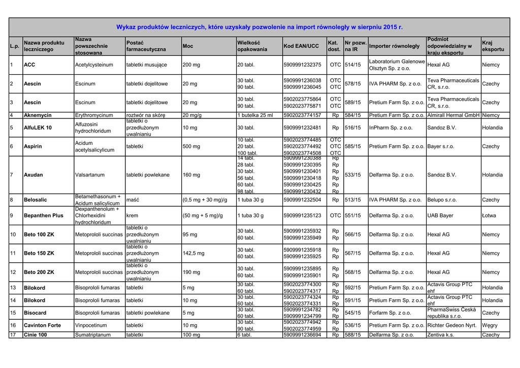 Wykaz produktów leczniczych, które uzyskały pozwolenie na import równoległy w sierpniu 2015 r. L.p. Nazwa produktu leczniczego Nazwa powszechnie stosowana Postać farmaceutyczna Moc Wielkość opakowania Kod EAN/UCC 1 ACC Acetylcysteinum tabletki musujące 200 mg 20 tabl. 5909991232375 OTC 514/15 Laboratorium Galenowe Hexal AG Olsztyn Sp. z o.o. 2 Aescin Escinum tabletki dojelitowe 20 mg 30 tabl. 90 tabl. 5909991236038 5909991236045 OTC 578/15 OTC IVA PHARM Sp. z o.o. Teva Pharmaceuticals Czechy CR, s.r.o. 3 Aescin Escinum tabletki dojelitowe 20 mg 30 tabl. 90 tabl. 5902023775864 5902023775871 OTC 589/15 OTC Pretium Farm Sp. z o.o. Teva Pharmaceuticals Czechy CR, s.r.o. 4 Aknemycin Erythromycinum 20 mg/g 1 butelka 25 ml 5902023774157 Rp 584/15 Pretium Farm Sp. z o.o. Almirall Hermal GmbH Niemcy 5 AlfuLEK 10 Alfuzosini hydrochloridum roztwór na skórę tabletki o przedłużonym uwalnianiu 10 mg 30 tabl. 5909991232481 Rp 516/15 InPharm Sp. z o.o. 6 Aspirin Acidum acetylsalicylicum tabletki 500 mg 7 Axudan Valsartanum tabletki powlekane 160 mg 10 tabl. 20 tabl. 100 tabl. 14 tabl. 28 tabl. 30 tabl. 56 tabl. 60 tabl. 98 tabl. 5902023774485 5902023774492 5902023774508 5909991230388 5909991230395 5909991230401 5909991230418 5909991230425 5909991230432 8 Belosalic maść (0,5 mg + 30 mg)/g 1 tuba 30 g 5909991232504 9 Bepanthen Plus krem (50 mg + 5 mg)/g 1 tuba 30 g 5909991235123 10 Beto 100 ZK 95 mg 30 tabl. 60 tabl. 5909991235932 5909991235949 Rp Rp 11 Beto 150 ZK 142,5 mg 30 tabl. 60 tabl. 5909991235918 5909991235925 12 Beto 200 ZK 190 mg 30 tabl. 60 tabl. 13 Bilokord Bisoprololi fumaras tabletki 5 mg 14 Bilokord Bisoprololi fumaras tabletki 10 mg 15 Bisocard Bisoprololi fumaras tabletki powlekane 5 mg 16 Cavinton Forte Vinpocetinum tabletki 10 mg 17 Cinie 100 Sumatriptanum tabletki 100 mg 30 tabl. 60 tabl. 30 tabl. 60 tabl. 30 tabl. 60 tabl. 30 tabl. 90 tabl. 6 tabl. Betamethasonum + Acidum salicylicum Dexpanthenolum + Chlorhexidini hydrochloridum tabletki o Metoprololi succinas przedłużonym uwalnianiu tabletki o Metoprololi succinas przedłużonym uwalnianiu tabletki o Metoprololi succinas przedłużonym uwalnianiu Kat. Nr pozw. Importer równoległy dost. na IR OTC OTC 585/15 OTC Rp Rp Rp 533/15 Rp Rp Rp Podmiot odpowiedzialny w kraju eksportu Sandoz B.V. Kraj eksportu Niemcy Holandia Pretium Farm Sp. z o.o. Bayer s.r.o. Czechy Delfarma Sp. z o.o. Sandoz B.V. Holandia IVA PHARM Sp. z o.o. Belupo s.r.o. Czechy Delfarma Sp. z o.o. UAB Bayer Łotwa 566/15 Delfarma Sp. z o.o. Hexal AG Niemcy Rp Rp 567/15 Delfarma Sp. z o.o. Hexal AG Niemcy 5909991235895 5909991235901 Rp Rp 568/15 Delfarma Sp. z o.o. Hexal AG Niemcy 5902023774300 5902023774317 5902023774324 5902023774331 5909991234782 5909991234799 5902023774942 5902023774959 5909991236694 Rp Rp Rp Rp Rp Rp Rp Rp Rp 592/15 Pretium Farm Sp. z o.o. Rp 513/15 OTC 551/15 591/15 545/15 Actavis Group PTC ehf Actavis Group PTC Pretium Farm Sp. z o.o. ehf PharmaSwiss Česká Forfarm Sp. z o.o. republika s.r.o. Holandia Holandia Czechy 536/15 Pretium Farm Sp. z o.o. Richter Gedeon Nyrt. Węgry 588/15 Delfarma Sp. z o.o. Czechy Zentiva k.s. Wykaz produktów leczniczych, które uzyskały pozwolenie na import równoległy w sierpniu 2015 r. L.p. Nazwa produktu leczniczego Nazwa powszechnie stosowana Postać farmaceutyczna Moc Wielkość opakowania Kod EAN/UCC 18 Citabax 20 Citalopramum tabletki powlekane 20 mg 14 tabl. 28 tabl. 56 tabl. 5909991233051 5909991233068 5909991233075 Rp Rp Rp 519/15 Delfarma Sp. z o.o. Ranbaxy (UK) Limited Słowacja 19 Clostilbegyt Clomifeni citras tabletki 50 mg 10 tabl. 5909991233136 Rp 525/15 Delfarma Sp. z o.o. Egis Pharmaceuticals Rumunia Plc. 20 Concor Cor 1,25 Bisoprololi fumaras tabletki powlekane 1,25 mg Merck Serono Ltd Wielka Brytania Bisoprololi fumaras tabletki powlekane 2,5 mg 547/15 Delfarma Sp. z o.o. Merck Serono Ltd Wielka Brytania 22 Concor Cor 3,75 Bisoprololi fumaras tabletki powlekane 3,75 mg 548/15 Delfarma Sp. z o.o. Merck Serono Ltd Wielka Brytania 23 Concor Cor 7,5 Bisoprololi fumaras tabletki powlekane 7,5 mg 549/15 Delfarma Sp. z o.o. Merck Serono Ltd Wielka Brytania 24 Dalacin Clindamycinum krem dopochwowy 20 mg/g Rp Rp Rp Rp Rp Rp Rp Rp Rp Rp Rp Rp Rp Delfarma Sp. z o.o. Concor Cor 2,5 5909991234973 5909991234980 5909991234997 5909991235000 5909991235017 5909991235024 5909991235031 5909991235048 5909991235055 5909991235062 5909991235079 5909991235086 5909991236724 552/15 21 28 tabl. 56 tabl. 100 tabl. 28 tabl. 56 tabl. 100 tabl. 28 tabl. 56 tabl. 100 tabl. 28 tabl. 56 tabl. 100 tabl. 1 tuba 40 g 594/15 InPharm Sp. z o.o. Grecja 25 Dalacin T Clindamycinum emulsja na skórę 10 mg/ml 1 butelka 30 ml 5909991235833 Rp 571/15 InPharm Sp. z o.o. 26 Dalacin T Clindamycinum Drospirenonum + Ethinylestradiolum żel 10 mg/g Rp Rp Rp Rp Rp Rp InPharm Sp. z o.o. 3 mg + 0,02 mg 5909991236717 5909991232559 5909991232566 5909991232580 5909991232597 5909991232603 595/15 tabletki powlekane 1 tuba 30 g 28 tabl. 84 tabl. 28 tabl. 84 tabl. 168 tabl. Pfizer Hellas A.E. Pfizer Service Company BVBA Pfizer Hellas A.E. 521/15 Delfarma Sp. z o.o. Gedeon Richter Plc. Portugalia 520/15 Delfarma Sp. z o.o. Gedeon Richter Plc. Holandia Rp 575/15 InPharm Sp. z o.o. Pfizer spol. s.r.o. Czechy OTC OTC 518/15 OTC InPharm Sp. z o.o. Laboratorios Menarini, Hiszpania S.A. Kat. Nr pozw. Importer równoległy dost. na IR Podmiot odpowiedzialny w kraju eksportu Kraj eksportu Grecja Grecja 27 Daylette 28 Daylette Drospirenonum + Ethinylestradiolum tabletki powlekane 3 mg + 0,02 mg 29 Depo-Medrol Methylprednisoloni acetas zawiesina do wstrzykiwań 40 mg/ml 1 fiol. 1 ml 5909991235772 30 Dexak Dexketoprofenum tabletki powlekane 25 mg 10 tabl. 20 tabl. 30 tabl. 5909991232450 5909991232467 5909991232474 31 Dexamytrex krople do oczu, roztwór (5 mg + 1 mg)/ml 1 butelka 5 ml 5909991233112 Rp 530/15 Delfarma Sp. z o.o. Angelini Farmaceutica, Lda. 32 Diprosalic maść (0,64 mg + 30 mg)/g 1 tuba 15 g 5909991236182 Rp 583/15 Delfarma Sp. z o.o.