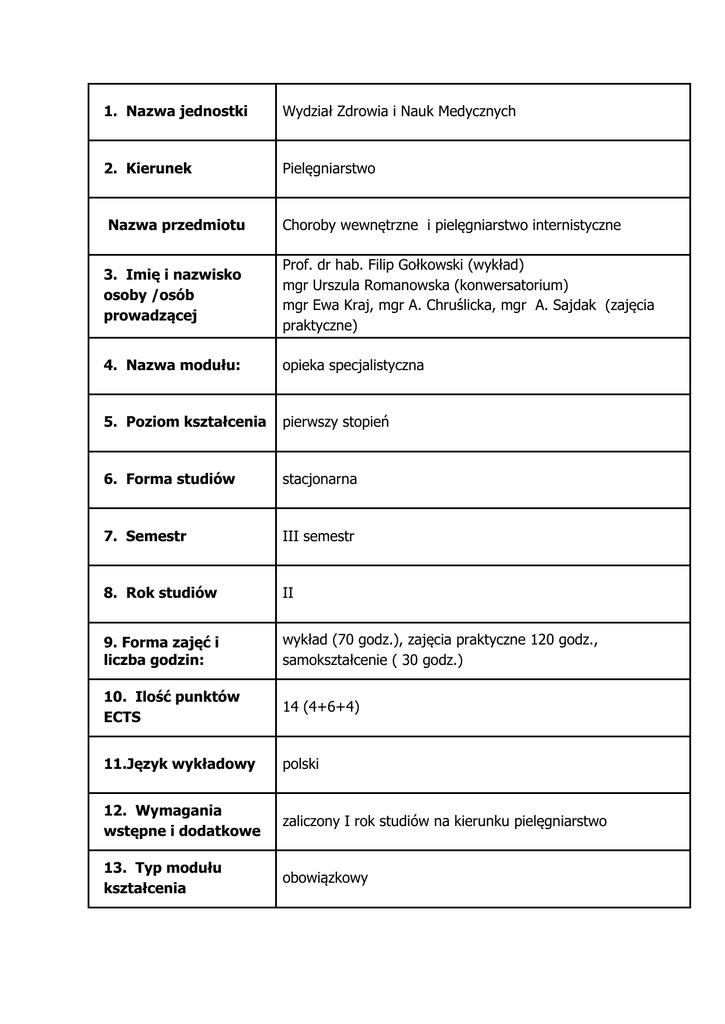 1. Nazwa jednostki Wydział Zdrowia i Nauk Medycznych 2. Kierunek Pielęgniarstwo Nazwa przedmiotu Choroby wewnętrzne i pielęgniarstwo internistyczne 3. Imię i nazwisko osoby /osób prowadzącej Prof. dr hab. Filip Gołkowski (wykład) mgr Urszula Romanowska (konwersatorium) mgr Ewa Kraj, mgr A. Chruślicka, mgr A. Sajdak (zajęcia praktyczne) 4. Nazwa modułu: opieka specjalistyczna 5. Poziom kształcenia pierwszy stopień 6. Forma studiów stacjonarna 7. Semestr III semestr 8. Rok studiów II 9. Forma zajęć i liczba godzin: wykład (70 godz.), zajęcia praktyczne 120 godz., samokształcenie ( 30 godz.) 10. Ilość punktów ECTS 14 (4+6+4) 11.Język wykładowy polski 12. Wymagania wstępne i dodatkowe zaliczony I rok studiów na kierunku pielęgniarstwo 13. Typ modułu kształcenia obowiązkowy 14.Efekty kształcenia dla modułu: Szczegółowe efekty kształcenia Wiedza Wymienia objawy zagrożenia życia u pacjenta w różnym wieku. Charakteryzuje czynniki ryzyka i zagrożeń zdrowotnych pacjentów w różnym wieku i stanie zdrowia Wyjaśnia etiopatogenezę, objawy kliniczne, przebieg, leczenie, rokowanie i opiekę pielęgniarską w schorzeniach: układu krążenia (serca, naczyń krwionośnych), układu oddechowego, układu nerwowego, układu pokarmowego (żołądka, jelit, wielkich gruczołów), wątroby, trzustki, układu moczowego(nerek i pęcherza moczowego), układu kostno-stawowego, mięśni, układu dokrewnego oraz krwi Zna zasady oceny stanu chorego w zależności od wieku Zna zasady diagnozowania w pielęgniarstwie internistycznym, geriatrycznym, chirurgicznym, pediatrycznym, neurologicznym, psychiatrycznym, anestezjologicznym, położniczo-ginekologicznym i opiece paliatywnej Zna zasady planowania opieki nad chorymi w zależności od wieku i stanu zdrowia Zna zasady przygotowania, opieki w trakcie oraz po badaniach i zabiegach diagnostycznych wykonywanych u pacjentów w różnym wieku i stanie zdrowia Charakteryzuje grupy leków i ich działanie na układ i narządy chorego w różnych schorzeniach, w zależności od wieku i stanu zdrowia, z uwzględnieniem działań niepożądanych, interakcji z innymi lekami i dróg podania Charakteryzuje techniki i procedury pielęgniarskie stosowane w opiece nad chorym w zależności od jego wieku i stanu zdrowia Zna zasady przygotowania chorego do samoopieki w zależności od jego wieku i stanu zdrowia Różnicuje reakcje chorego na chorobę i hospitalizację w zależności od jego wieku i stanu zdrowia Zna rolę pielęgniarki przy przyjęciu chorego do przedsiębiorstwa podmiotu leczniczego w zależności od wieku i stanu zdrowia pacjenta Zna swoiste zasady organizacji opieki specjalistycznej (geriatrycznej, intensywnej opieki medycznej, neurologicznej, psychiatrycznej, pediatrycznej, internistycznej, chirurgicznej, paliatywnej oraz systemu ratownictwa medycznego w Polsce) D.W1. Stopień realizacji efektu w module/ +++ D.W2 +++ D.W3. +++ D.W4. D.W5. +++ +++ D.W6. +++ D.W7 ++ D.W8. ++ D.W9. ++ D.W10. ++ D.W11. +++ D.W12. +++ D.W14. +++ Zna następstwa długotrwałego unieruchomienia Rozpoznaje stany zagrożenia życia i opisuje monitorowanie pacjentów metodami przyrządowymi i bezprzyrządowymi Zna procedurę postępowania z ciałem pacjenta zmarłego D.W 25 D.W 45 +++ ++ D.W 51 + Symbol Efektu kształcenia UMIEJĘTNOŚCI Gromadzi informacje, formułuje diagnozę pielęgniarską, ustala cele i plan opieki, wdraża interwencje pielęgniarskie oraz dokonuje ewaluacji opieki zdrowia; Rozpoznaje uwarunkowania zachowania zdrowia odbiorców opieki w różnym wieku i stanie zdrowia Prowadzi poradnictwo w zakresie samoopieki pacjentów w różnym wieku i stanie zdrowia, dotyczące wad rozwojowych, chorób i uzależnień; Motywuje chorego i jego opiekunów do wejścia do grup wsparcia społecznego; Prowadzi profilaktykę powikłań w przebiegu chorób; Organizuje izolację chorych zakaźnie w miejscach publicznych i w warunkach domowych; Diagnozuje stopień ryzyka rozwoju odleżyn i dokonuje ich klasyfikacji; Pobiera materiał do badań diagnostycznych Ocenia stan ogólny pacjenta w kierunku powikłań po specjalistycznych badaniach diagnostycznych i powikłań pooperacyjnych; Doraźnie podaje tlen, modyfikuje dawkę stałą insuliny szybko i krótko działającej; Przygotowuje chorego do badań diagnostycznych pod względem fizycznym i psychicznym Dokumentuje sytuację zdrowotną pacjenta, jej dynamikę zmian i realizowaną opiekę pielęgniarską Rozpoznaje stany nagłego zagrożenia zdrowia Prowadzi żywienie enteralne i parentalne dorosłych i dzieci z wykorzystaniem różnych technik, w tym pompy obrotowo-perystaltycznej Rozpoznaje powikłania leczenia farmakologicznego, dietetycznego, rehabilitacyjnego, leczniczopielęgnacyjnego Prowadzi rozmowę terapeutyczna Doraźnie tamuje krwawienia i krwotoki Prowadzi rehabilitację przyłóżkową i usprawnianie ruchowe pacjenta oraz aktywizację z wykorzystaniem elementów terapii zajęciowej Prowadzi, dokumentuje i ocenia bilans płynów pacjenta Przekazuje informacje o stanie zdrowia chorego członkom zespołu terapeutycznego Asystuje lekarzowi w trakcie badań diagnostycznych i leczniczych Prowadzi dokumentację opieki nad chorym: kartę obserwacji, zabiegów pielęgnacyjnych i raportów, kartę rejestru zakażeń szpitalnych, profilaktyki i leczenia odleżyn oraz kartę informacyjną z zaleceniami w zakresie samoopieki Ocenia poziom bólu, reakcje chorego na ból i nasilenie bólu oraz stosuje postępowanie przeciwbólowe D.U1 +++ D.U2 +++ D.U3 ++ D.U4 ++ D.U5 D.U6 ++ + D.U8 +++ D.U9 D.U10 ++ ++ D.U11 ++ D.U12 ++ D.U13 ++ D.U16 D.U19 ++ ++ D.U20 ++ D.U22 D.U23 D.U24 ++ + + D.U25 +++ D.U26 +++ D.U27 ++ D.U28 +++ D.U29 ++ Tworzy pacjentowi warunki do godnego umierania D.U30 + Dostosowuje interwencje pielęgniarskie do rodzaju D.U32 +++ problemów pielęgnacyjnych; Przygotowuje i podaje leki różnymi drogami, D.U33 +++ samodzielnie lub na zlecenie lekarza kompetencje szanuje godność i auto