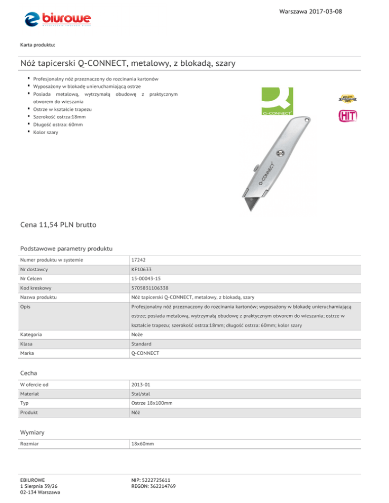 Warszawa 2017-03-08 Karta produktu: Nóż tapicerski Q-CONNECT, metalowy, z blokadą, szary Profesjonalny nóż przeznaczony do rozcinania kartonów Wyposażony w blokadę unieruchamiającą ostrze Posiada metalową, wytrzymałą obudowę z praktycznym otworem do wieszania Ostrze w kształcie trapezu Szerokość ostrza:18mm Długość ostrza: 60mm Kolor szary Cena 11,54 PLN brutto Podstawowe parametry produktu Numer produktu w systemie 17242 Nr dostawcy KF10633 Nr Celcen 15-00043-15 Kod kreskowy 5705831106338 Nazwa produktu Nóż tapicerski Q-CONNECT, metalowy, z blokadą, szary Opis Profesjonalny nóż przeznaczony do rozcinania kartonów; wyposażony w blokadę unieruchamiającą ostrze; posiada metalową, wytrzymałą obudowę z praktycznym otworem do wieszania; ostrze w kształcie trapezu; szerokość ostrza:18mm; długość ostrza: 60mm; kolor szary Kategoria Noże Klasa Standard Marka Q-CONNECT Cecha W ofercie od 2013-01 Materiał Stal/stal Typ Ostrze 18x100mm Produkt Nóż Wymiary Rozmiar 18x60mm EBIUROWE 1 Sierpnia 39/26 02-134 Warszawa NIP: 5222725611 REGON: 362214769 Warszawa 2017-03-08 Karta katalogowa produktu cd. Nóż tapicerski Q-CONNECT, metalowy, z blokadą, szary Wspólny słownik zamówień CPV 39241130-3 Noże specjalistyczne Certyfikaty Hit Hit Nowy produkt w ofercie Standard Kolor Kolor Szary Serdecznie zapraszamy do współpracy EBIUROWE zespół. EBIUROWE 1 Sierpnia 39/26 02-134 Warszawa NIP: 5222725611 REGON: 362214769