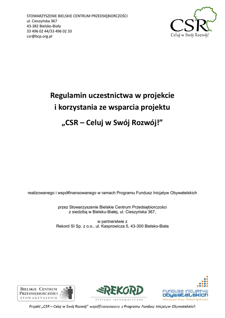 STOWARZYSZENIE BIELSKIE CENTRUM PRZEDSIĘBIORCZOŚCI ul. Cieszyńska 367 43-382 Bielsko-Biała 33 496 02 44/33 496 02 33 [email protected] Regulamin uczestnictwa w projekcie i korzystania ze wsparcia projektu „CSR – Celuj w Swój Rozwój!” realizowanego i współfinansowanego w ramach Programu Fundusz Inicjatyw Obywatelskich przez Stowarzyszenie Bielskie Centrum Przedsiębiorczości z siedzibą w Bielsku-Białej, ul. Cieszyńska 367, w partnerstwie z Rekord SI Sp. z o.o., ul. Kasprowicza 5, 43-300 Bielsko-Biała STOWARZYSZENIE BIELSKIE CENTRUM PRZEDSIĘBIORCZOŚCI ul. Cieszyńska 367 43-382 Bielsko-Biała 33 496 02 44/33 496 02 33 [email protected] §1 Postanowienia ogólne 1. Projekt „CSR – Celuj w Swój Rozwój” jest realizowany przez Stowarzyszenie Bielskie Centrum Przedsiębiorczości w partnerstwie z firmą Rekord SI Sp. z o.o. z Bielska-Białej w ramach projektu dofinansowanego z Programu Fundusz Inicjatyw Obywatelskich. 2. Obszarem realizacji projektu są: a) Dla przedsiębiorców – województwo śląskie (udział pośredni w projekcie) b) Dla podmiotów ekonomii społecznej - subregion południowy: powiaty bielski, cieszyński, żywiecki oraz Miasto Bielsko-Biała. 3. Celem projektu jest zwiększenie zaangażowania przedstawicieli organizacji pozarządowych (NGO) oraz przedsiębiorców we wspólne inicjatywy oparte o koncepcję społecznej odpowiedzialności biznesu (CSR) poprzez szerokie działania edukacyjne. Projekt ma za zadanie wzmocnić potencjał przedsiębiorczy trzeciego sektora przy wykorzystaniu jego zasobów i możliwości. 4. Termin realizacji projektu 01.07.2015 – 31.12.2015 5. Projekt skierowany jest do: a) Podmiotów Ekonomii Społecznej (m.in.: organizacji pozarządowych, spółdzielni socjalnych i innych podmiotów ekonomii społecznej) - zwanych dalej PES; b) Przedstawicieli biznesu. 6. Siedziba projektu: Stowarzyszenie Bielskie Centrum Przedsiębiorczości ul. Cieszyńska 367, 43-382 Bielsko-Biała, pok. 306 II piętro tel. 33 496 02 44 lub 33 496 02 33 fax: 33 496 02 22 www.owes.bcp.org.pl 7. Niniejszy regulamin określa warunki uczestnictwa w działaniach oferowanych w ramach projektu, proces rekrutacji, zakres wsparcia, obowiązki uczestników oraz warunki rezygnacji. 8. Udział Uczestników w Projekcie jest bezpłatny. STOWARZYSZENIE BIELSKIE CENTRUM PRZEDSIĘBIORCZOŚCI ul. Cieszyńska 367 43-382 Bielsko-Biała 33 496 02 44/33 496 02 33 [email protected] §2 Słownik pojęć Użyte w niniejszym Regulaminie pojęcia, oznaczają: Biuro Projektu - Stowarzyszenie Bielskie Centrum Przedsiębiorczości, ul. Cieszyńska 367, 43-382 Bielsko-Biała, pok. 306 II piętro; tel. 33 496 02 44 lub 33 496 02 33 PES – podmiot ekonomii społecznej: organizacje pozarządowe (w tym fundacje i stowarzyszenia); podmioty wymienione w art.3 ust.3 ustawy z dnia 24 kwietnia 2003r. o pożytku publicznym i wolontariacie (w tym m.in. stowarzyszenia jednostek samorządu terytorialnego, spółdzielnie socjalne, kluby sportowe); Centra Integracji Społecznej, Kluby Integracji Społecznej, Zakłady Aktywności Zawodowej, Warsztaty Terapii Zajęciowej mające siedzibę na terenie subregionu południowego tj. powiat bielski, cieszyński, żywiecki oraz miasto Bielsko-Biała. Projekt – "CSR – Celuj w Swój Rozwój” Przedstawiciel PES – osoba współpracująca z PES na o pracę/cywilnoprawnej/stażowej/wolontariackiej lub będąca członkiem PES. zasadzie: umowy Realizator – Stowarzyszenie Bielskie Centrum Przedsiębiorczości w partnerstwie z Rekord SI Sp. z o.o. z Bielska-Białej. Uczestnik projektu – Podmiot ekonomii społecznej (PES) STOWARZYSZENIE BIELSKIE CENTRUM PRZEDSIĘBIORCZOŚCI ul. Cieszyńska 367 43-382 Bielsko-Biała 33 496 02 44/33 496 02 33 [email protected] §3 Oferta Projektu 1. Bezpośrednia oferta – wsparcie skierowane jest do PES spełniających kryteria określone w § 4 pkt 2, oferowane przez projekt formy wsparcia: a) Tworzenie partnerstw prywatno – społecznych w zakresie realizacji strategii CSR, w tym celu zostaną zorganizowane następujące działania: -Warsztaty dla PES -Doradztwo dla PES 2. Pośrednia oferta – wsparcie skierowane do wszystkich PES i biznesu zainteresowanych tematyką CSR spełniających kryteria określone w §1 pkt 2, oferowane przez projekt formy wsparcia: a) Kampania informacyjno–promocyjna dla PES i biznesu dot. CSR i projektu; b) Konferencja metodą Open Space dla PES i biznesu; c) Elektroniczna publikacja dotycząca wypracowywanych wspólnie rozwiązań PES i biznesu w trakcie trwania całego projektu §4 Warunki korzystania z oferty projektu 1. Uczestnikami uprawnionymi do skorzystania z oferty projektu (w zakresie określonym w §3 pkt. 1 są przedstawiciele PES mający siedzibę w jednym z trzech powiatów (powiat bielski, cieszyński, żywiecki oraz Miasto Bielsko-Biała). 2. Warunkiem uczestnictwa jest złożenie następujących dokumentów: a) Formularz zgłoszeniowy organizacji do udziału w projekcie (wypełniany w okresie rekrutacji – podpisywany przez reprezentantów PES); b) Deklaracja przystąpienia instytucji do projektu; c) Dane uczestników projektów (przedstawicieli PES), którzy otrzymają wsparcie w postaci warsztatów/doradztwa. 3. Na podstawie złożonych formularzy następuje weryfikacja zgłoszeń pod kątem formalnym, oraz pod kątem kryteriów oceny wniosku. 4. Realizator nie ponosi odpowiedzialności (prawnej i materialnej) za zaniechania lub działania Uczestnika Projektu podjęte w związku z otrzymaną usługą. STOWARZYSZENIE BIELSKIE CENTRUM PRZEDSIĘBIORCZOŚCI ul. Cieszyńska 367 43-382 Bielsko-Biała 33 496 02 44/33 496 02 33 [email protected] 5. Uczestnik wyraża zgodę na przeprowadzanie działań monitoringowych, kontrolnych (również w trakcie realizacji usługi) i ewaluacyjnych zakresu i produktów usługi przez Realizatora oraz inne instytucje lub jednostki organizacyjne uprawnione w następstwie zawarcia umowy na realizację projektu „CSR – Celuj w Swój