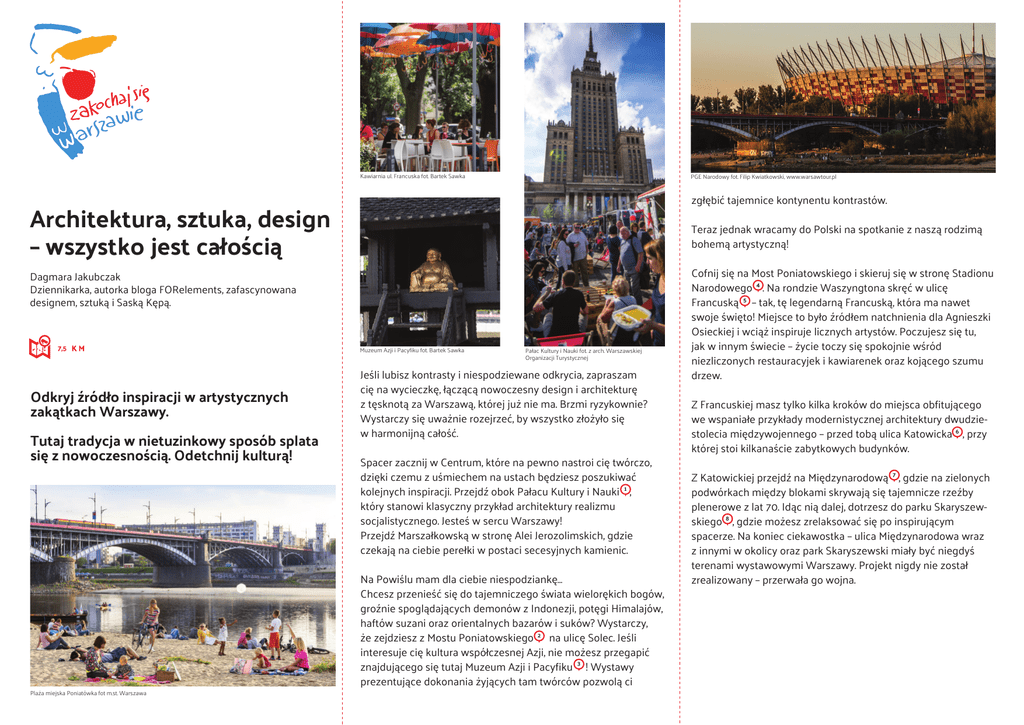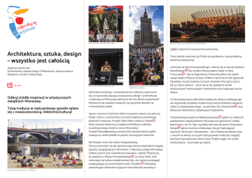 Kawiarnia ul. Francuska fot. Bartek Sawka PGE Narodowy fot. Filip Kwiatkowski, www.warsawtour.pl zgłębić tajemnice kontynentu kontrastów. Architektura, sztuka, design – wszystko jest całością Teraz jednak wracamy do Polski na spotkanie z naszą rodzimą bohemą artystyczną! Dagmara Jakubczak Dziennikarka, autorka bloga FORelements, zafascynowana designem, sztuką i Saską Kępą. Muzeum Azji i Pacyfiku fot. Bartek Sawka Odkryj źródło inspiracji w artystycznych zakątkach Warszawy. Tutaj tradycja w nietuzinkowy sposób splata się z nowoczesnością. Odetchnij kulturą! Plaża miejska Poniatówka fot m.st. Warszawa Pałac Kultury i Nauki fot. z arch. Warszawskiej Organizacji Turystycznej Jeśli lubisz kontrasty i niespodziewane odkrycia, zapraszam cię na wycieczkę, łączącą nowoczesny design i architekturę z tęsknotą za Warszawą, której już nie ma. Brzmi ryzykownie? Wystarczy się uważnie rozejrzeć, by wszystko złożyło się w harmonijną całość. Spacer zacznij w Centrum, które na pewno nastroi cię twórczo, dzięki czemu z uśmiechem na ustach będziesz poszukiwać kolejnych inspiracji. Przejdź obok Pałacu Kultury i Nauki 1 , który stanowi klasyczny przykład architektury realizmu socjalistycznego. Jesteś w sercu Warszawy! Przejdź Marszałkowską w stronę Alei Jerozolimskich, gdzie czekają na ciebie perełki w postaci secesyjnych kamienic. Na Powiślu mam dla ciebie niespodziankę… Chcesz przenieść się do tajemniczego świata wielorękich bogów, groźnie spoglądających demonów z Indonezji, potęgi Himalajów, haftów suzani oraz orientalnych bazarów i suków? Wystarczy, że zejdziesz z Mostu Poniatowskiego 2 na ulicę Solec. Jeśli interesuje cię kultura współczesnej Azji, nie możesz przegapić znajdującego się tutaj Muzeum Azji i Pacyfiku 3 ! Wystawy prezentujące dokonania żyjących tam twórców pozwolą ci Cofnij się na Most Poniatowskiego i skieruj się w stronę Stadionu Narodowego 4 . Na rondzie Waszyngtona skręć w ulicę Francuską 5 – tak, tę legendarną Francuską, która ma nawet swoje święto! Miejsce to było źródłem natchnienia dla Agnieszki Osieckiej i wciąż inspiruje licznych artystów. Poczujesz się tu, jak w innym świecie – życie toczy się spokojnie wśród niezliczonych restauracyjek i kawiarenek oraz kojącego szumu drzew. Z Francuskiej masz tylko kilka kroków do miejsca obfitującego we wspaniałe przykłady modernistycznej architektury dwudziestolecia międzywojennego – przed tobą ulica Katowicka 6 , przy której stoi kilkanaście zabytkowych budynków. Z Katowickiej przejdź na Międzynarodową 7 , gdzie na zielonych podwórkach między blokami skrywają się tajemnicze rzeźby plenerowe z lat 70. Idąc nią dalej, dotrzesz do parku Skaryszewskiego 8 , gdzie możesz zrelaksować się po inspirującym spacerze. Na koniec ciekawostka – ulica Międzynarodowa wraz z innymi w okolicy oraz park Skaryszewski miały być niegdyś terenami wystawowymi Warszawy. Projekt nigdy nie został zrealizowany – przerwała go wojna. MOST ŚLĄSKO-DĄBROWSKI ZAMEK KRÓLEWSKI ALEJA GROCHOW SKA METRO STADION NARODOWY CI ERNOŚ SOLID WISŁA CKA ENIE ZIEL ALEJA BUW TEATR WIELKI OPERA NARODOWA A BR WS KO DO KRA KIE 8 PARK SKARYSZEWSKI UNIWERSYTET WARSZAWSKI W PGE NARODOWY ES EŻ RZ SYRENKA 4 A A TON YNG ASZ W LEJA RONDO WASZYNGTONA DZY NAR ICK A ÓW S ZE ĘZC YCI ZW A ŃCÓW OBRO W ODO A SASK C IED SK Ń ZY I A IE MSK OLI ROZ JE LEJE A ŃSK KŁA NIE LE W TO SO RONDO DE GAULLE’A MIĘ SKA 6 3 ŁM METRO CENTRUM 5 WALECZNYCH WA 1 MOST KSIĘCIA JÓZEFA PONIATOWSKIEGO KA IAT Y ŚW PKiN NCU IE SK 2 NOW METRO ŚWIĘTOKRZYSKA KA TAM OW ZK TOK ŚWIĘ US METRO NOWY ŚWIAT - UNIWERSYTET A SK RZY FRA CI OŚ EK EŻ IE RZ SK YB CIŃ W ZE ZC EL PI TO CIE IEŚ METRO CENTRUM NAUKI KOPERNIK YB EDM PRZ OGRÓD SASKI MOST ŚWIĘTOKRZYSKI 7 SKIE JAZDOW ALEJE U KA WS O AŁK RSZ MA