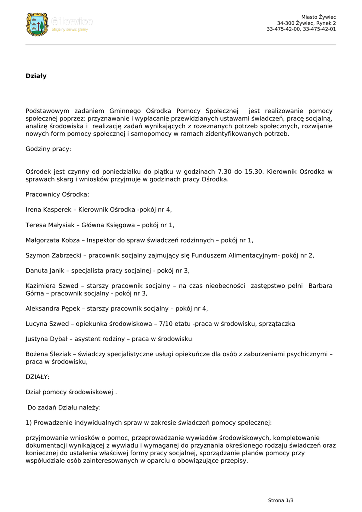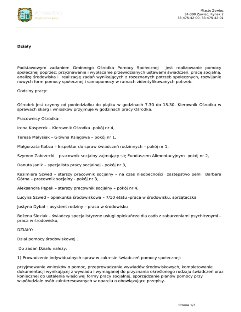 Miasto Żywiec 34-300 Żywiec, Rynek 2 33-475-42-00, 33-475-42-01 Działy Podstawowym zadaniem Gminnego Ośrodka Pomocy Społecznej jest realizowanie pomocy społecznej poprzez: przyznawanie i wypłacanie przewidzianych ustawami świadczeń, pracę socjalną, analizę środowiska i realizację zadań wynikających z rozeznanych potrzeb społecznych, rozwijanie nowych form pomocy społecznej i samopomocy w ramach zidentyfikowanych potrzeb. Godziny pracy: Ośrodek jest czynny od poniedziałku do piątku w godzinach 7.30 do 15.30. Kierownik Ośrodka w sprawach skarg i wniosków przyjmuje w godzinach pracy Ośrodka. Pracownicy Ośrodka: Irena Kasperek – Kierownik Ośrodka -pokój nr 4, Teresa Małysiak – Główna Księgowa – pokój nr 1, Małgorzata Kobza – Inspektor do spraw świadczeń rodzinnych – pokój nr 1, Szymon Zabrzecki – pracownik socjalny zajmujący się Funduszem Alimentacyjnym- pokój nr 2, Danuta Janik – specjalista pracy socjalnej - pokój nr 3, Kazimiera Szwed – starszy pracownik socjalny – na czas nieobecności zastępstwo pełni Barbara Górna – pracownik socjalny - pokój nr 3, Aleksandra Pępek – starszy pracownik socjalny – pokój nr 4, Lucyna Szwed – opiekunka środowiskowa – 7/10 etatu -praca w środowisku, sprzątaczka Justyna Dybał – asystent rodziny – praca w środowisku Bożena Śleziak – świadczy specjalistyczne usługi opiekuńcze dla osób z zaburzeniami psychicznymi – praca w środowisku, DZIAŁY: Dział pomocy środowiskowej . Do zadań Działu należy: 1) Prowadzenie indywidualnych spraw w zakresie świadczeń pomocy społecznej: przyjmowanie wniosków o pomoc, przeprowadzanie wywiadów środowiskowych, kompletowanie dokumentacji wynikającej z wywiadu i wymaganej do przyznania określonego rodzaju świadczeń oraz koniecznej do ustalenia właściwej formy pracy socjalnej, sporządzanie planów pomocy przy współudziale osób zainteresowanych w oparciu o obowiązujące przepisy. Strona 1/3 Miasto Żywiec 34-300 Żywiec, Rynek 2 33-475-42-00, 33-475-42-01 2#℣䍐⌡⌀ 倀爀漀眀愀搀稀攀渀椀攀 瀀爀愀挀礀 猀漀挀樀愀氀渀攀樀 猀欀椀攀爀漀眀愀渀攀樀 渀愀 瀀漀洀漀挀 漀猀漀戀漀洀 椀 爀漀搀稀椀渀漀洀 眀攀 眀稀洀漀挀渀椀攀渀椀甀 氀甀b odzyskaniu ich zdolności do funkcjonowania w społeczeństwie oraz na tworzenie warunków sprzyjających temu celowi oraz stałe poszukiwanie nowych form pracy socjalnej, w tym m. in.: - pomoc w uporządkowaniu problemów rodziny i zaplanowanie działań mających na celu rozwiązanie tych problemów, - motywowanie klientów do podejmowania działań mających na celu rozwiązywanie ich problemów, udzielanie wsparcia, kierowanie, łączenie klientów z placówkami, organizacjami, instytucjami zajmującymi się specjalistyczną pomocą, pomoc w wykorzystaniu możliwości, uprawnień klientów, rzecznictwo na rzecz podopiecznych, działania edukacyjne mające na celu zwiększenie umiejętności społecznych podopiecznych, towarzyszenie w załatwianiu różnych spraw, podejmowanie działań interwencyjnych w sytuacjach tego wymagających, sporządzanie oceny, diagnozy oraz długofalowego planu pomocy społecznej. 3) Ustalanie i realizacja polityki pomocy społecznej prowadzonej przez Ośrodek: rozeznanie potrzeb środowiska, jego zasobów i deficytów, sporządzanie analiz, opinii na podstawie tego rozeznania, przeprowadzanie wywiadów, opinii na zlecenie innych organów upoważnionych do występowania o ich sporządzenie. 4#℣䍐⌡⌀ 娀眀椀愀搀挀稀攀渀椀攀 甀猁䈀甀最 漀瀀椀攀欀甁䐀挀稀礀挀栀 漀爀愀稀 猀瀀攀挀樀愀氀椀猀琀礀挀稀渀礀挀栀 甀猁䈀甀最 漀瀀椀攀欀甁䐀挀稀礀挀栀 搀氀愀 漀猀戀 z zaburzeniami psychicznymi. 5) Wsparcie rodziny niewydolnej wychowawczo poprzez przydzielenie jej asystenta rodziny. 6) Realizacja ustawy o dodatkach mieszkaniowych. Dział świadczeń rodzinnych. Do zadań Działu świadczeń z zakresu realizacji świadczeń rodzinnych i świadczeń z funduszu alimentacyjnego należy w szczególności: 1. Realizacja zadań wynikających z ustawy o świadczeniach rodzinnych: przyjmowanie wniosków, prowadzenie postępowań i wydawanie decyzji dotyczących zasiłku rodzinnego oraz dodatków do zasiłku rodzinnego, świadczeń opiekuńczych, składek na ubezpieczenia społeczne, zdrowotne osób pobierających świadczenia rodzinne, zlecanie przeprowadzenia wywiadów w sprawie przyznawania świadczeń rodzinnych, prowadzenie spraw dotyczących nienależnie pobranych świadczeń rodzinnych, rozpatrywanie odwołań od wydawanych decyzji, udzielanie informacji na temat obowiązujących przepisów w zakresie świadczeń rodzinnych, prowadzenie analizy przyznanych i wypłaconych świadczeń rodzinnych. realizacja programu rządowego Kara Dużej Rodziny 2. Realizacja świadczeń z funduszu alimentacyjnego: prowadzenie spraw dotyczących świadczeń z funduszu alimentacyjnego przyjmowanie wniosków i prowadzenie postępowań w sprawie ustalenia uprawnień do świadczeń z funduszu alimentacyjnego, przygotowanie decyzji administracyjnych w sprawie świadczeń z funduszu alimentacyjnego, rozliczanie kwartalne świadczeń alimentacyjnych wraz z odsetkami, rozpatrywanie odwołań od decyzji w tym zakresie, prowadzenie analizy przyznanych i wypłaconych świadczeń z funduszu alimentacyjnego, prowadzenie spraw dotyczących nienależnie pobranych świadczeń z funduszu alimentacyjnego, współpraca z komornikami Sądów Rejonowych i Sądem Okręgowym w zakresie spraw dotyczących świadczeń z funduszu alimentacyjnego oraz dłużników alimentacyjnych, udzielanie informacji na temat obowiązujących przepisów w sprawie świadczeń z funduszu alimentacyjnego, prowadzenie postępowań wobec osób zobowiązanych do zwrotu wypłaconych Strona 2/3 Miasto Żywiec 34-300 Żywiec, Rynek 2 33-475-42-00, 33-475-42-01 świadczeń z funduszu alimentacyjnego . Strona 