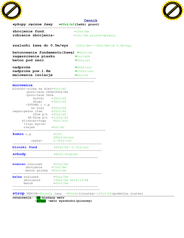 y o c u -tr a c k .c Cennik wykopy ręczne ławy =60zł/m3(lekki grunt) ------------------------------------zbrojenie fund. =10zł/bm robienie zbrojenia=15zl/bm proste(4pręty) szalunki ława do 0.5m/wys =20zł/bm---35zł/bm-od 0.5m/wys betonowanie fundamentu(ława) =45zł/m3 zagęszczenie piasku =5zł/m2b beton pod zero =50zł/m3 nadproże nadproże pow.1.8m malowanie izolacje =60zł/szt =100zł/szt =6zł/m2 ---------------------------------------------------------------------------------------- murowanie bloczki-siłka na klej=40zł/m2 -poro-term 24cm=24zł/m2 -poro-term 36cm krótki =36zł/m2 długi =30zł/m2 -YUTONG i t.p na klej =30zł/m2 cegła-pełna 12sm =35zł/m2 25cm p/t =30zł/m2 38-52cm p/t =110zł/m3 klinkier+fuga =5zł/szt +1raz mycie+ olejek =6zł/m2 -------------------------------------------------komin c.p =150280zł/m/wys cegła= 2.50zł/szt -----------------------------------------------bloczki fund =40zł/m2~~2.5zł/szt -----------------------------------------------schody =60zł/stopień ---------------------------------------------wieniec szalunek =15zł/bm zbrojenie =15zł/bm beton grucha =20zł/bm -----------------------------------------------belka szalunek =45zł/bm zbrojenie -30zł/bm belki(6-8) beton =20zł/bm -------------------------------------------------------------------------------------------strop TERIVA-60złm2; lany -80złm2(1siatka)-125zł/m2(podwójna siatka) oznaczenia: -bm-bieżący metr -m/wys -metr wysokości(pionowy) .d o m o w w w .d o C lic k to bu y bu to k lic C w w w N O W ! h a n g e Vi e N PD ! XC er O W F- w m h a n g e Vi e w PD XC er F- c u -tr a c k .c