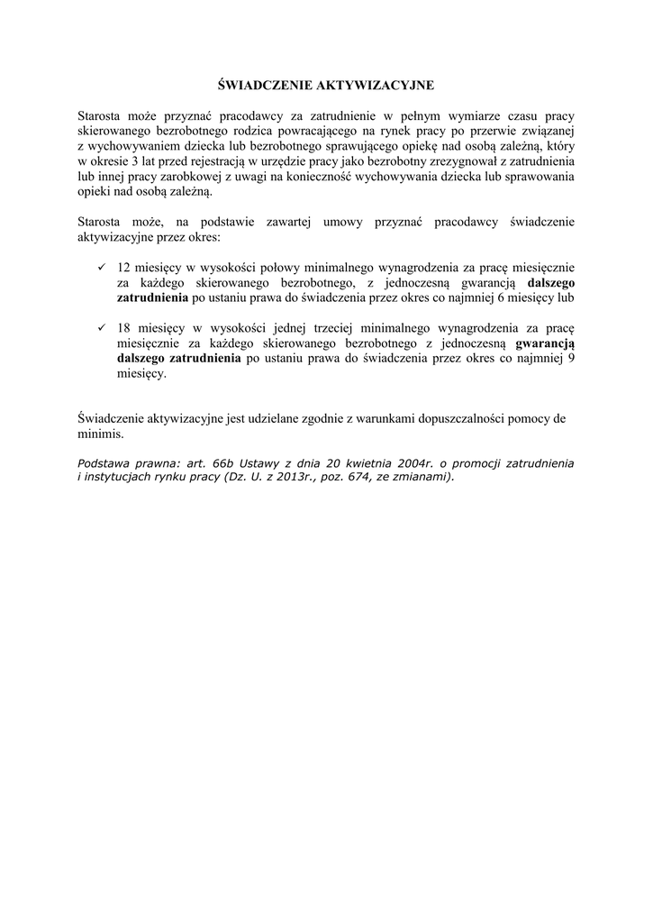 ŚWIADCZENIE AKTYWIZACYJNE Starosta może przyznać pracodawcy za zatrudnienie w pełnym wymiarze czasu pracy skierowanego bezrobotnego rodzica powracającego na rynek pracy po przerwie związanej z wychowywaniem dziecka lub bezrobotnego sprawującego opiekę nad osobą zależną, który w okresie 3 lat przed rejestracją w urzędzie pracy jako bezrobotny zrezygnował z zatrudnienia lub innej pracy zarobkowej z uwagi na konieczność wychowywania dziecka lub sprawowania opieki nad osobą zależną. Starosta może, na podstawie zawartej umowy przyznać pracodawcy świadczenie aktywizacyjne przez okres: 12 miesięcy w wysokości połowy minimalnego wynagrodzenia za pracę miesięcznie za każdego skierowanego bezrobotnego, z jednoczesną gwarancją dalszego zatrudnienia po ustaniu prawa do świadczenia przez okres co najmniej 6 miesięcy lub 18 miesięcy w wysokości jednej trzeciej minimalnego wynagrodzenia za pracę miesięcznie za każdego skierowanego bezrobotnego z jednoczesną gwarancją dalszego zatrudnienia po ustaniu prawa do świadczenia przez okres co najmniej 9 miesięcy. Świadczenie aktywizacyjne jest udzielane zgodnie z warunkami dopuszczalności pomocy de minimis. Podstawa prawna: art. 66b Ustawy z dnia 20 kwietnia 2004r. o promocji zatrudnienia i instytucjach rynku pracy (Dz. U. z 2013r., poz. 674, ze zmianami).