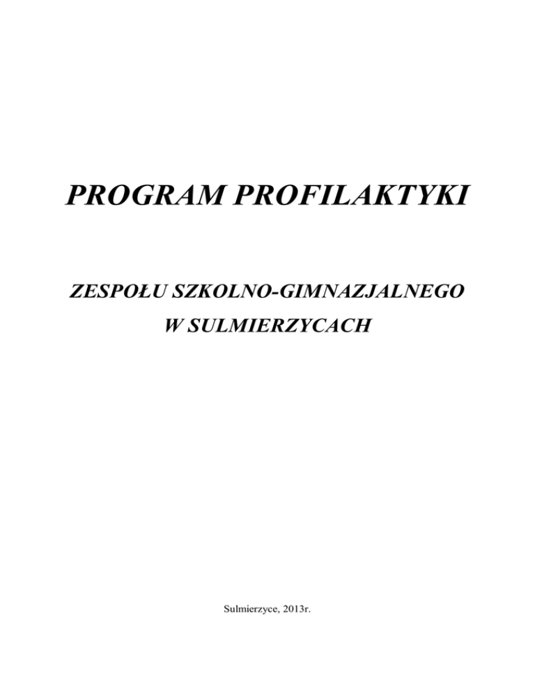 PROGRAM PROFILAKTYKI ZESPOŁU SZKOLNO-GIMNAZJALNEGO W SULMIERZYCACH Sulmierzyce, 2013r. SPIS TREŚCI I. II. Wprowadzenie Spójność programu profilaktycznego z programem wychowawczym III. Założenia programu IV. Cele i zadania szkolnego programu wychowawczego V. Treści szkolnego programu profilaktyki VI. Sposób realizacji szkolnego programu profilaktyki VII. Metody realizacji szkolnego programu profilaktyki VIII. IX. X. Adresaci programu i struktura oddziaływań profilaktycznych Osoby odpowiedzialne za realizacje szkolnego programu profilaktyki Ewaluacja szkolnego programu profilaktyki 2 I. WPROWADZENIE Specyfika czasów, w których żyjemy, to przyśpieszone tempo przemian, nie zawsze harmonijnych. Zwiększyła się liczba czynników destrukcyjnych oddziałujących na młodzież, która staje wobec wyborów i decyzji bardzo złożonych i skomplikowanych. Skutkiem czego stale wzrasta liczba osób przejawiających dysfunkcje rozwojowe oraz wykorzystujących szkodliwe sposoby odreagowania w trudnych sytuacjach życiowych. Aby przeciwdziałać temu zjawisku, konieczne jest podejmowanie na terenie szkoły wielopoziomowych działań profilaktycznych gdyż: szkoła wypełnia znaczną część aktywnego życia dzieci i młodzieży, szkoła jest miejscem intensywnego rozwoju w zakresie funkcjonowania interpersonalnego i społecznego w grupie rówieśniczej, szkoła jest miejscem działalności zadaniowej uczniów, a więc ujawnia lub wręcz wyzwala trudności dzieci i młodzieży związane z przyjmowaniem odpowiedzialności za własne życie, szkoła jest miejscem konfrontacji autorytetów i kształtowania się poczucia własnej tożsamości ucznia, szkoła pozwala na łatwy dostęp do środowiska dzieci i młodzieży, i sprawną organizację prowadzonych oddziaływań. Szkolny program profilaktyki to program profilaktyki środowiskowej, to znaczy taki, w którym obiektem działań jest całe środowisko szkolne. Uczestnikami zajęć i oddziaływań są uczniowie, ich rodzice, a także nauczyciele i wychowawcy. Biorąc pod uwagę, że większość dzieci i młodzieży, przechodzi zasadnicze przemiany związane z okresem dorastania, dojrzewania, że jest to czas poszukiwania własnej tożsamości, odnajdywania się w nowych rolach, dużych zmian fizjologicznych, emocjonalnych, społecznych, a także duchowych, przyjmujemy, że główne zadanie profilaktyki w tym okresie to: wskazywanie sposobów radzenia sobie z trudnościami, poznawanie norm moralno-społecznych regulujących przebieg relacji międzyludzkich, przekazywanie informacji na temat obowiązującego prawa i konsekwencjach łamania go, przekazywanie informacji na temat specyfiki oddziaływania substancji psychoaktywnych na fizjologię i psychikę człowieka, 3 kształtowanie u młodych ludzi poczucia odpowiedzialność, które jest szczególnie ważne gdy uczniowie uzyskują większą swobodę, uwidacznianie pozytywnych aspektów dojrzewania i rozwoju. Profilaktyka to proces, który wspiera zdrowie przez umożliwienie ludziom uzyskania pomocy potrzebnej im do konfrontacji ze złożonymi, stresującymi warunkami życia oraz przez umożliwienie jednostkom osiągania subiektywnie satysfakcjonującego, społecznie akceptowanego życia. Program profilaktyki dostosowany jest do potrzeb rozwojowych uczniów oraz potrzeb danego środowiska, obejmującego wszystkie treści i działania o charakterze profilaktycznym skierowane do uczniów, nauczycieli i rodziców. II. SPÓJNOŚĆ SZKOLNEGO PROGRAMU PROFILAKTYKI Z PROGRAMEM WYCHOWAWCZYM W naszej szkole zmierzamy w kierunku wzmacniania postaw pożądanych społecznie i akceptowanych powszechnie zachowań. Warunkiem efektywnej realizacji tych założeń jest spójność programu profilaktycznego i wychowawczego. Mają one ukierunkować ucznia w jego dążeniach, pomóc zbudować właściwą hierarchię wartości, nauczyć umiejętnego realizowania własnych potrzeb przy jednoczesnym poszanowaniu drugiego człowieka. Celem wychowania szkolnego jest: "Przygotowanie do życia we współczesnym świecie" poprzez wszechstronny rozwój ucznia, a przede wszystkim przez: zwiększenie aktywności poznawczej ucznia oraz rozwijanie rozumienia siebie, drugiego człowieka i otoczenia, przygotowanie ucznia do rozpoznawania zagrożeń i dokonywania właściwych wyborów, kształtowanie postaw moralnych, obywatelskich i patriotycznych koniecznych do życia w społeczeństwie, aby wszechstronny rozwój ucznia przebiegał w sposób harmonijny, konieczna jest ochrona i ingerencja, gdy pojawia się zagrożenie. 4 III. ZAŁOŻENIA SZKOLNEGO PROGRAMU PROFILAKTYKI 1. Profilaktyka rozumiana jako zapobieganie występowaniu niepożądanych procesów i zjawisk, określanych jako przejawy patologii życia społecznego, jako system działań wzmacniających lub podtrzymujących różne, dodatnie społeczne postawy uczniów w toku wychowania, realizowana jest podczas działalności edukacyjnej szkoły (w ramach godzin wychowawczych, uroczystości szkolnych, spotkań młodzieży m.in z przedstawicielami policji, prelekcji prowadzonych przez szkolnego pedagoga lub psychologa i innych działań ukierunkowanych także na aktywność uczniów) oraz w postaci różnych odrębnych zajęć profilaktyczno-edukacyjnych. 2. Profilaktyka w naszej szkole powinna koncentrować się na wzmacnianiu czynników chroniących (pozwalających na uniknięcie wystąpienia sytuacji kryzysowej): a) rozwijanie zainteresowań uczniów oraz przeciwdziałanie niepowodzeniom szkolnym, b) wspomaganie rozwoju moralnego uczniów (poszanowanie norm, wartości, autorytetów), c) stworzenie uczniom możliwości przynależenia do pozytywnych grup rówieśniczych: kół zainteresowań, zespołów sportowych, tanecznych, artystycznych itp., d) wspomaganie rodziców w prawidłowym pełnieniu przez nich funkcji wychowawczych, 3. Organizatorami działań profilaktycznych na terenie szkoły są także pedagog i psycholog. Ich rola polega na dostrzeganiu potrzeb mło