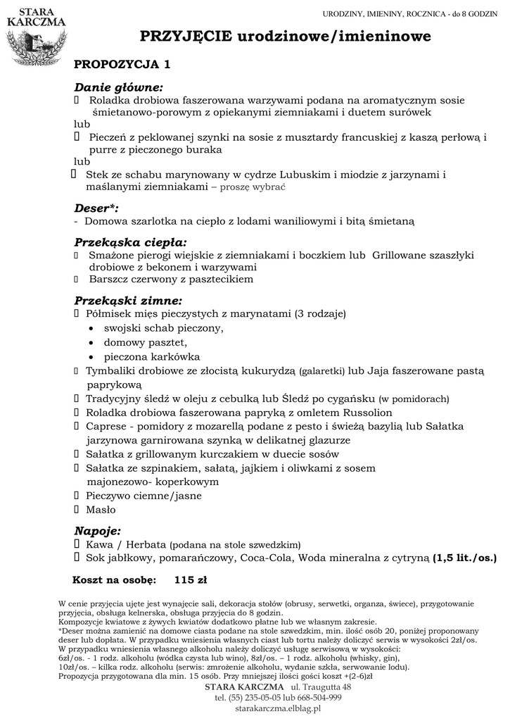 URODZINY, IMIENINY, ROCZNICA - do 8 GODZIN PRZYJĘCIE urodzinowe/imieninowe PROPOZYCJA 1 Danie główne: - Roladka drobiowa faszerowana warzywami podana na aromatycznym sosie śmietanowo-porowym z opiekanymi ziemniakami i duetem surówek lub - Pieczeń z peklowanej szynki na sosie z musztardy francuskiej z kaszą perłową i purre z pieczonego buraka lub - Stek ze schabu marynowany w cydrze Lubuskim i miodzie z jarzynami i maślanymi ziemniakami – proszę wybrać Deser*: - Domowa szarlotka na ciepło z lodami waniliowymi i bitą śmietaną Przekąska ciepła: - Smażone pierogi wiejskie z ziemniakami i boczkiem lub Grillowane szaszłyki drobiowe z bekonem i warzywami Barszcz czerwony z pasztecikiem Przekąski zimne: - Półmisek mięs pieczystych z marynatami (3 rodzaje) swojski schab pieczony, domowy pasztet, pieczona karkówka - Tymbaliki drobiowe ze złocistą kukurydzą (galaretki) lub Jaja faszerowane pastą paprykową - Tradycyjny śledź w oleju z cebulką lub Śledź po cygańsku (w pomidorach) - Roladka drobiowa faszerowana papryką z omletem Russolion - Caprese - pomidory z mozarellą podane z pesto i świeżą bazylią lub Sałatka jarzynowa garnirowana szynką w delikatnej glazurze - Sałatka z grillowanym kurczakiem w duecie sosów - Sałatka ze szpinakiem, sałatą, jajkiem i oliwkami z sosem majonezowo- koperkowym - Pieczywo ciemne/jasne - Masło Napoje: - Kawa / Herbata (podana na stole szwedzkim) - Sok jabłkowy, pomarańczowy, Coca-Cola, Woda mineralna z cytryną (1,5 lit./os.) Koszt na osobę: 115 zł W cenie przyjęcia ujęte jest wynajęcie sali, dekoracja stołów (obrusy, serwetki, organza, świece), przygotowanie przyjęcia, obsługa kelnerska, obsługa przyjęcia do 8 godzin. Kompozycje kwiatowe z żywych kwiatów dodatkowo płatne lub we własnym zakresie. *Deser można zamienić na domowe ciasta podane na stole szwedzkim, min. ilość osób 20, poniżej proponowany deser lub dopłata. W przypadku wniesienia własnych ciast lub tortu należy doliczyć serwis w wysokości 2zł/os. W przypadku wniesienia własnego alkoholu należy doliczyć usługę serwisową w wysokości: 6zł/os. - 1 rodz. alkoholu (wódka czysta lub wino), 8zł/os. – 1 rodz. alkoholu (whisky, gin), 10zł/os. – kilka rodz. alkoholu (serwis: zmrożenie alkoholu, wydanie szkła, serwowanie lodu). Propozycja przygotowana dla min. 15 osób. Przy mniejszej ilości gości koszt +(2-6)zł STARA KARCZMA ul. Traugutta 48 tel. (55) 235-05-05 lub 668-504-999 starakarczma.elblag.pl URODZINY, IMIENINY, ROCZNICA - do 8 GODZIN PROPOZYCJA 2 Zupa: - Krem z pomidorów z ziołowymi grzankami lub Krem z białych warzyw z chipsem z boczku Danie główne: Roladka po warmińsku z piersi indyka otulona boczkiem podana z opiekanymi ziemniakami i duetem surówek lub - Kieszeń ze schabu z pieczarkowym nadzieniem aromatyzowana białym winem z sosem leśnym z pieczonym ziemniakiem i bukietem sałat z sosem vinegrette lub - Koperty „ Żuławskie” z szynki wieprzowej nadziewane ogórkiem kiszonym i wędzonką duszone w sosie własnym z tradycyjnymi ziemniakami i kapustą szmurowaną – proszę wybrać - Przekąski ciepłe: - Łódeczki francuskie z mięsem mielonym i serem lub Mini kotleciki schabowe z grillowanymi pieczarkami – proszę wybrać Żur „staropolski” podany z jajkiem i białą kiełbasą Przekąski zimne: - Półmisek swojskich wędlin wędzonych i kiełbas (4 rodzaje) swojska szynka karkówka wędzona swojskie kiełbasy i boczek - Roladka drobiowa faszerowana szpinakiem z serem Gorgonzola lub Jaja faszerowane pieczarkami i zieloną pietruszką – proszę wybrać - Śledziowe roladki na wiejskiej śmietanie z ogórkiem, jabłkiem i cebulą - Schab opiekany w kminku z nadzieniem śliwkowym - Tradycyjny tatar wołowy z marynatami - Sałatka z polędwiczką na mixsie sałat w duecie sosów - Sałatka grecka z fetą i oliwkami - Sos chrzanowy - Pieczywo ciemne/jasne - Masło Napoje i ciasta: - Kawa / Herbata (podana na stole szwedzkim) - Napoje: Sok jabłkowy, pomarańczowy, Coca-Cola, Woda z cytryną (1,5 lit./os.) - Ciasta naszego wypieku (podane na stole szwedzkim) ciasto z karmelowym słonecznikiem lub z brzoskwiniami i bitą śmietana domowa szarlotka oprószona cukrem Koszt na osobę: 125 zł W cenie przyjęcia ujęte jest wynajęcie sali, dekoracja stołów (obrusy, serwetki, organza, świece), przygotowanie przyjęcia, obsługa kelnerska, obsługa przyjęcia do 8 godzin. Kompozycje kwiatowe z żywych kwiatów dodatkowo płatne lub we własnym zakresie. Min. ilość osób w przypadku ciast na stole szwedzkim – 20, poniżej proponowany deser lub dopłata. W przypadku wniesienia własnych ciast lub tortu należy doliczyć serwis w wysokości 2zł/os. W przypadku wniesienia własnego alkoholu należy doliczyć usługę serwisową w wysokości: 6zł/os. - 1 rodz. alkoholu (wódka czysta lub wino), 8zł/os. – 1 rodz. alkoholu (whisky, gin), 10zł/os. – kilka rodz. alkoholu (serwis: zmrożenie alkoholu, wydanie szkła, serwowanie lodu). Propozycja przygotowana dla min. 15 osób. Przy mniejszej ilości gości koszt +(2-6)zł STARA KARCZMA ul. Traugutta 48 tel. (55) 235-05-05 lub 668-504-999 starakarczma.elblag.pl URODZINY, IMIENINY, ROCZNICA - do 8 GODZIN PROPOZYCJA 3 Zupa: - Krem z brokułów z łezką śmietany i prażonymi płatkami migdałowymi lub Bulion z kaczki z kołdunami Danie główne: - Polędwiczki wieprzowe sous-vide z sosem kurkowym, pieczonym ziemniakiem i bukietem jarzyn/zestawem surówek lub - Filet drobiowy faszerowany suszonymi pomidorami i serem bałkańskim z opiekanymi ziemniakami i bukietem sałat z sosem vinegrette Deser: Tort okolicznościowy naszego wypieku Przekąski ciepłe: - Półmisek rozmaitości, a w nim: cząstki kurczaka, mini szaszłyczki i śliwki w boczku z salsą meksykańską Barszcz czerwony z pasztecikiem lub z kołdunami (proszę wybrać) Przekąski zimne: - Półmisek mięs pieczystych z marynatami (3 rodzaje mięs pieczonych) schab ze śliwką sw
