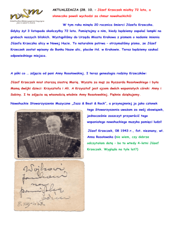 AKTUALIZACJA (28. 10. – Józef Krzeczek miałby 72 lata, a słoneczko powoli wychodzi za chmur nowohuckich W tym roku minęła 20 rocznica śmierci Józefa Krzeczka. Gdyby żył 3 listopada skończyłby 72 lata. Pamiętajmy o nim, kiedy będziemy zapalać lampki na grobach naszych bliskich. Wystąpiliśmy do Urzędu Miasta Krakowa z pismem o nadanie imienia Józefa Krzeczka ulicy w Nowej Hucie. To naturalnie potrwa – otrzymaliśmy pismo, ze Józef Krzeczek został wpisany do Banku Nazw ulic, placów itd. w Krakowie. Teraz będziemy szukać odpowiedniego miejsca. A póki co … zdjęcia od pani Anny Rosołowskiej. I teraz genealogia rodziny Krzeczków: Józef Krzeczek miał starszą siostrę Marię. Wyszła za mąż za Ryszarda Rosołowskiego i była Mamą dwójki dzieci: Krzysztofa i Ali. A Krzysztof jest ojcem dwóch wspaniałych córek: Anny i Sabiny. I te zdjęcia są własnością właśnie Anny Rosołowskiej. Pięknie dziękujemy. Nowohuckie Stowarzyszenie Muzyczne „Jazz & Beat & Rock”, a przynajmniej ja jako członek tego Stowarzyszenia uważam za swój obowiązek, jednocześnie zaszczyt przywrócić tego wspaniałego nowohuckiego muzyka pamięci ludzi! Józef Krzeczek, 08 1943 r., fot. nieznany, wł. Anna Rosołowska (nie wiem, czy dobrze odczytałam datę – bo to wtedy 4-letni Józef Krzeczek. Wygląda na tyle lat?) Tutaj koncert w Filharmonii Narodowej w Warszawie – może to pierwszy big-beatowy koncert w Polsce w Filharmonii? Na trąbce Józef Krzeczek, ale kto dalej? Proszę o wiadomości, jeśli ktoś wie!!! I rewelacja!!! Jedyne, jak dotąd zdjęcie muszli koncertowej w parku przy Ognisku Młodych ZMS, ok. 1956,57 r. , śpiewa Janina Karczewska, przy fortepianie Józef Krzeczek, na akordeonie Zdzisław Zientara, ps. Hindus. Tyle rozpoznałam. Fot. Nieznany, wł. Anna Rosołowska. Kto tam jeszcze gra? Pozdrawiam, Krystyna Downar