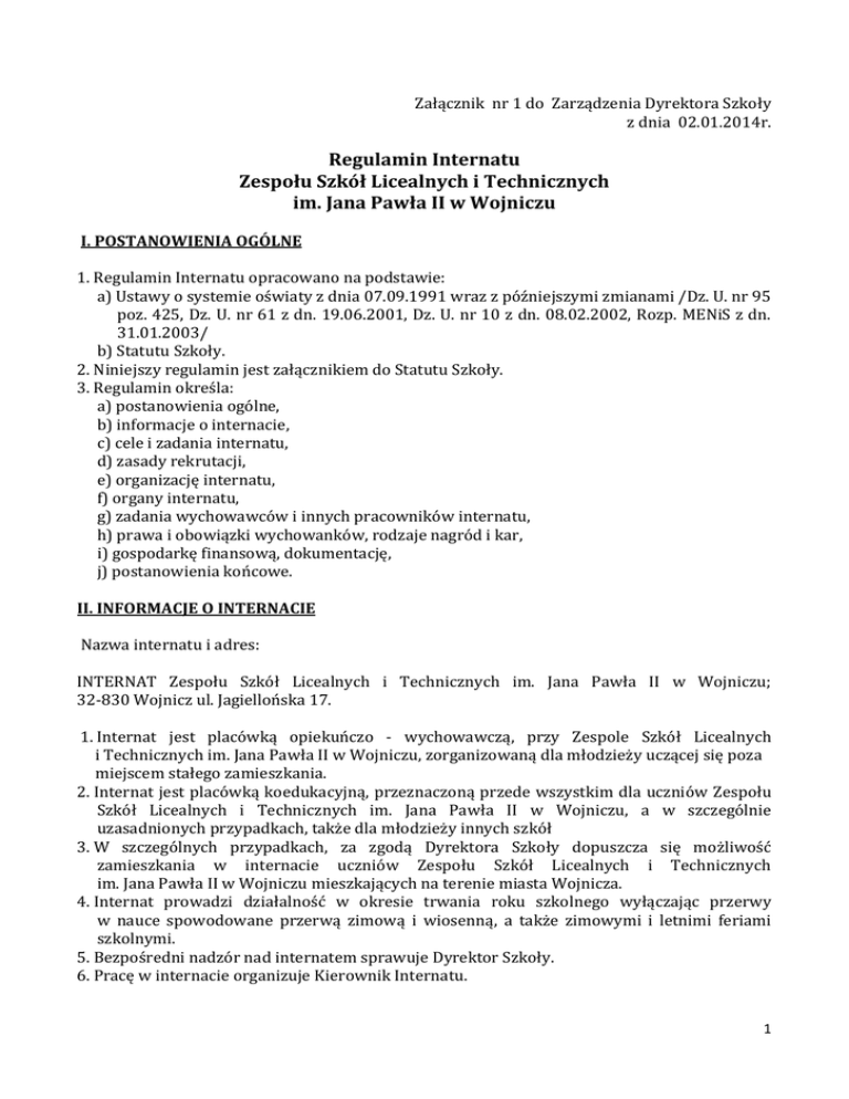 Załącznik nr 1 do Zarządzenia Dyrektora Szkoły z dnia 02.01.2014r. Regulamin Internatu Zespołu Szkół Licealnych i Technicznych im. Jana Pawła II w Wojniczu I. POSTANOWIENIA OGÓLNE 1. Regulamin Internatu opracowano na podstawie: a) Ustawy o systemie oświaty z dnia 07.09.1991 wraz z późniejszymi zmianami /Dz. U. nr 95 poz. 425, Dz. U. nr 61 z dn. 19.06.2001, Dz. U. nr 10 z dn. 08.02.2002, Rozp. MENiS z dn. 31.01.2003/ b) Statutu Szkoły. 2. Niniejszy regulamin jest załącznikiem do Statutu Szkoły. 3. Regulamin określa: a) postanowienia ogólne, b) informacje o internacie, c) cele i zadania internatu, d) zasady rekrutacji, e) organizację internatu, f) organy internatu, g) zadania wychowawców i innych pracowników internatu, h) prawa i obowiązki wychowanków, rodzaje nagród i kar, i) gospodarkę finansową, dokumentację, j) postanowienia końcowe. II. INFORMACJE O INTERNACIE Nazwa internatu i adres: INTERNAT Zespołu Szkół Licealnych i Technicznych im. Jana Pawła II w Wojniczu; 32-830 Wojnicz ul. Jagiellońska 17. 1. Internat jest placówką opiekuńczo - wychowawczą, przy Zespole Szkół Licealnych i Technicznych im. Jana Pawła II w Wojniczu, zorganizowaną dla młodzieży uczącej się poza miejscem stałego zamieszkania. 2. Internat jest placówką koedukacyjną, przeznaczoną przede wszystkim dla uczniów Zespołu Szkół Licealnych i Technicznych im. Jana Pawła II w Wojniczu, a w szczególnie uzasadnionych przypadkach, także dla młodzieży innych szkół 3. W szczególnych przypadkach, za zgodą Dyrektora Szkoły dopuszcza się możliwość zamieszkania w internacie uczniów Zespołu Szkół Licealnych i Technicznych im. Jana Pawła II w Wojniczu mieszkających na terenie miasta Wojnicza. 4. Internat prowadzi działalność w okresie trwania roku szkolnego wyłączając przerwy w nauce spowodowane przerwą zimową i wiosenną, a także zimowymi i letnimi feriami szkolnymi. 5. Bezpośredni nadzór nad internatem sprawuje Dyrektor Szkoły. 6. Pracę w internacie organizuje Kierownik Internatu. 1 7. Otwarcie, przekształcanie lub likwidacja internatu następuje na podstawie decyzji organu prowadzącego szkołę. 8. Internat zapewnia wychowankom w okresie nauki szkolnej zakwaterowanie w pomieszczeniach mieszkalnych, warunki do nauki, wypoczynku, utrzymania codziennej higieny osobistej, a w szczególności: a) indywidualne miejsce do spania wyposażone w kołdrę, poduszkę, koc, meble do wypoczynku, nauki i przechowywania odzieży, bielizny, obuwia, pomocy szkolnych i przyborów osobistych, b) właściwe oświetlenie, c) ciepłą wodę do codziennego mycia i kąpieli oraz warunki do utrzymania higieny osobistej, 9. Internat zapewnia wychowankom i uczniom mieszkającym w Internacie codzienne wyżywienie zgodne z obowiązującymi normami i zasadami racjonalnego żywienia. 10.Internat może przyjmować studentów szkół wyższych na praktykę pedagogiczną. 11. Internat za zgodą Kierownika Internatu może udostępnić studentom w celach naukowych różne informacje dotyczące działalności internatu. III. CELE I ZADANIA INTERNATU 1. Internat zapewnia wychowankom optymalne warunki w czasie pobierania przez nich nauki. 2. Internat planuje i realizuje swoje zadania współdziałając ze szkołą, rodzicami wychowanków, organizacjami uczniowskimi, organizacjami społecznymi oraz instytucjami i placówkami w środowisku. 3. Do zadań internatu w szczególności należy: a) zapewnienie właściwych warunków do nauki, rozwijania zainteresowań, zamiłowań i uzdolnień, b) zapewnienie wychowankom codziennego wyżywienia i całodobowego zakwaterowania, całodobową opiekę wychowawcy, c) zapewnienie właściwych warunków sanitarno-higienicznych, d) stwarzanie możliwości do uczestniczenia w kulturze, e) upowszechnianie kultury fizycznej oraz troska o zdrowie wychowanków, f) wyrabianie zaradności życiowej wychowanków, rozwijanie samodzielności i samorządności, wdrożenie do demokracji życia, g) wdrożenie do samodzielnego wykonywania określonych prac porządkowogospodarczych, h) wyrabianie szacunku dla osób pracujących w internacie, kultury bycia, koleżeńskiej postawy i umiejętności współdziałania w zespole, i) zapewnienie wychowankom miejsca i urządzeń do dokonywania drobnych przepierek, suszenia i prasowania, j) wyrabianie szacunku i troski o sprzęt, stanowiący wyposażenie internatu, ekonomicznego korzystania z energii elektrycznej i wody, dbanie o estetykę i czystość pomieszczeń internatu. 2 IV. Rekrutacja 1. Przyjęcie do internatu mogą ubiegać się uczniowie mieszkający w miejscowościach, z których codzienny dojazd do szkoły jest niemożliwy lub utrudniony bądź uciążliwy. 2. W szczególnie uzasadnionych przypadkach jak warunki zdrowotne, materialne, wychowawcze mogą być przyjęci do internatu uczniowie z innych miejscowości i miasta Wojnicz będącego siedzibą internatu. 3. Pierwszeństwo w przyjęciu do internatu przysługuje: a) wychowankom rodzin zastępczych, b) wychowankom z rodzin niepełnych, sierotom, c) dzieciom z rodzin wielodzietnych i mających trudne warunki materialne, d) wychowankom, którzy mieszkali w poprzednich latach w internacie i nie było zastrzeżeń do ich zachowania. 4. Podanie o miejsce w internacie składają uczniowie w kancelarii internatu lub sekretariacie szkoły w terminie rekrutacji do szkoły. Wychowankowie internatu na kolejny rok szkolny składają deklarację do 20 kwietnia. 5. Do internatu mogą być przyjmowani uczniowie z innych szkół, jeżeli internat dysponuje wolnymi miejscami. 6. Decyzję o przyjęciu ucznia do internatu podejmuje komisja, której przewodniczącym jest Kierownik Internatu. Od decyzji istnieje możliwość odwołania się do Dyrektora szkoły w terminie 7 dni. 7. Uczeń przyjeżdżając do internatu musi posiadać: - własne przybory toaletowe, ręcznik, - własną pościel (poszwa, poszewka i prześcieradło) - piżamę, kapcie, - każdy mieszkaniec internatu 