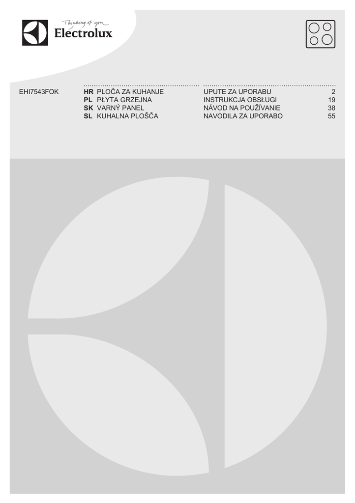 EHI7543FOK HR PL SK SL PLOČA ZA KUHANJE PŁYTA GRZEJNA VARNÝ PANEL KUHALNA PLOŠČA UPUTE ZA UPORABU INSTRUKCJA OBSŁUGI NÁVOD NA POUŽÍVANIE NAVODILA ZA UPORABO 2 19 38 55 2 www.electrolux.com SADRŽAJ 1. INFORMACIJE O SIGURNOSTI........................................................................ 3 2. SIGURNOSNE UPUTE...................................................................................... 4 3. OPIS PROIZVODA............................................................................................. 6 4. SVAKODNEVNA UPORABA..............................................................................8 5. SAVJETI........................................................................................................... 11 6. ČIŠĆENJE I ODRŽAVANJE.............................................................................13 7. RJEŠAVANJE PROBLEMA..............................................................................13 8. POSTAVLJANJE.............................................................................................. 16 9. TEHNIČKI PODACI.......................................................................................... 18 MISLIMO NA VAS Hvala vam što ste kupili Electrolux uređaj. Izabrali ste proizvod koji sa sobom donosi desetljeća profesionalnog iskustva i inovacija. Domišljat i elegantan, projektiran je misleći na vas. Stoga, uvijek kada ga koristite, možete biti sigurni znajući da ćete svaki put dobiti izvrsne rezultate. Dobrodošli u Electrolux. Posjetite našu internetsku stranicu za: Dobivanje savjeta o korištenju, prospekata, rješavanju problema, servisnim informacija: www.electrolux.com Registriranje vašeg proizvoda za bolji servis: www.registerelectrolux.com Kupovinu dodatne opreme, potrošnog materijala i originalnih rezervnih dijelova za vaš uređaj: www.electrolux.com/shop BRIGA O KUPCIMA I SERVIS Preporučujemo uporabu originalnih rezervnih dijelova. Prilikom kontaktiranja ovlaštenog servisnog centra, provjerite da su vam dostupni sljedeći podaci: Model, PNC, serijski broj. Informacije možete pronaći na nazivnoj pločici. Upozorenje / Oprez - sigurnosne informacije Opće informacije i savjeti Ekološke informacije Zadržava se pravo na izmjene. HRVATSKI 1. 3 INFORMACIJE O SIGURNOSTI Prije postavljanja i korištenja uređaja, pažljivo pročitajte isporučene upute. Proizvođač nije odgovoran ako nepravilno postavljanje i uporaba uređaja uzrokuje ozljede i oštećenja. Upute uvijek čuvajte s uređajem, za buduće potrebe. 1.1 Sigurnost djece i slabijih osoba • • • • • • • Ovaj uređaj mogu koristiti djeca od 8 godina pa na više i osobe smanjenih tjelesnih, osjetilnih ili mentalnih mogućnosti ili osobe koje ne raspolažu iskustvom ili znanjem ako su pod nadzorom osobe odgovorne za njihovu sigurnost i rade po uputama koje se odnose na sigurno korištenje uređaja te razumiju uključene opasnosti. Ne dozvolite djeci da se igraju s uređajem. Svu ambalažu čuvajte izvan dohvata djece. Djeci i kućnim ljubimcima ne dozvoljavajte približavanje uređaju dok je u radu ili dok se hladi. Dostupni dijelovi su vrući. Ako je uređaj opremljen sigurnosnom blokadom za djecu, preporučujemo da je uključite. Čišćenje i održavanje uređaja ne smiju obavljati djeca bez nadzora. Djeca mlađa od 3 godine trebaju se držati podalje ako nisu pod trajnim nadzorom. 1.2 Opća sigurnost • • • Uređaj i njegovi dostupni dijelovi zagrijavaju se tijekom uporabe. Ne dodirujte grijače. Ne upravljajte uređajem pomoću vanjskog uređaja za podešavanja vremena ili preko odvojenog sustava za daljinsko upravljanje. Kuhanje na ploči za kuhanje bez nadzora uz upotrebu masnoće ili ulja može biti opasno i može dovesti do požara. 4 www.electrolux.com • • • • • • • Vatru nikada ne gasite vodom već isključite uređaj i tada prekrijte vatru, npr. poklopcem ili protupožarnim prekrivačem. Stvari ne držite na površinama za kuhanje. Metalne predmete kao što su noževi, vilice, žlice i poklopce ne stavljajte na površinu ploče za kuhanje jer će se zagrijati. Za čišćenje uređaja ne upotrebljavajte uređaje za parno čišćenje. Nakon uporabe, isključite element ploče za kuhanje odgovarajućom kontrolom, a ne oslanjajte se na detektor posuđa. Ako je staklokeramička/staklena površina napuknuta, isključite uređaj kako biste spriječili mogućnost električnog udara Ako je kabel za napajanje oštećen, proizvođač ili ovlašteni servis ili osoba sličnih kvalifikacija mora ga zamijeniti kako bi se izbjegla opasnost. 2. SIGURNOSNE UPUTE 2.1 Instalacija UPOZORENJE! Samo kvalificirana osoba smije postaviti ovaj uređaj. • • • • • • • • Odstranite svu ambalažu Ne postavljajte i ne koristite oštećeni uređaj. Pridržavajte se uputa za instalaciju isporučenih s uređajem. Održavajte minimalnu udaljenost od drugih uređaja i kuhinjskih elemenata. Budite pažljivi kada pomičete uređaj jer je težak. Obavezno nosite zaštitne rukavice. Izrezane površine zabrtvite sredstvom za brtvljenje kako biste spriječili bubrenje uzrokovano vlagom. Donji dio uređaja zaštite od pare i vlage. Uređaj ne postavljajte u blizini vrata ili ispod prozora. Na taj način se sprječava pad vrućeg posuđa kada se vrata ili prozor otvore. • • • Ako je uređaj postavljen iznad ladica uvjerite se da je prostor, između dna uređaja i gornje ladice, dovoljan za cirkulaciju zraka Može se zagrijati dno uređaja. Preporučamo da ispod uređaja postavite nezapaljivu pregradnu ploču kako biste spriječili pristup dnu. Uvjerite se da je prostor za provjetravanje veličine 2 mm, između radne ploče i prednjeg ruba kuhinjskog elementa ispod nje, slobodan. Jamstvo ne pokriva oštećenja uzrokovana nedostatkom odgovarajućeg prostora za provjetravanje. 2.2 Spajanje na električnu mrežu UPOZORENJE! Opasnost od požara i strujnog udara. • Sva spajanja na električnu mrežu treba izvršiti kvalifi