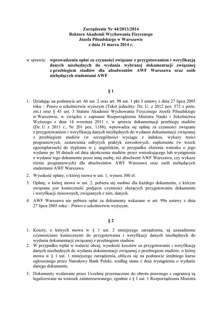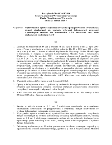 Zarządzenie Nr 44/2013/2014 Rektora Akademii Wychowania Fizycznego Józefa Piłsudskiego w Warszawie z dnia 31 marca 2014 r. w sprawie: wprowadzenia opłat za czynności związane z przygotowaniem i weryfikacją danych niezbędnych do wydania wybranej dokumentacji związanej z przebiegiem studiów dla absolwentów AWF Warszawa oraz osób niebędących studentami AWF §1 1. Działając na podstawie art. 66 ust. 2 oraz art. 98 ust. 1 pkt 5 ustawy z dnia 27 lipca 2005 roku – Prawo o szkolnictwie wyższym (Tekst jednolity: Dz. U. z 2012 poz. 572 z późn. zm.) oraz § 45 ust. 3 Statutu Akademii Wychowania Fizycznego Józefa Piłsudskiego w Warszawie, w związku z zapisami Rozporządzenia Ministra Nauki i Szkolnictwa Wyższego z dnia 14 września 2011 r. w sprawie dokumentacji przebiegu studiów (Dz. U. z 2011 r., Nr 201 poz. 1188), wprowadza się opłatę za czynności związane z przygotowaniem i weryfikacją danych niezbędnych do wydania dokumentacji związanej z przebiegiem studiów (w szczególności wyciągu z indeksu, wykazy treści programowych, zestawienia odbytych praktyk zawodowych, suplementu (w trzech egzemplarzach) do dyplomu w j. angielskim, w przypadku złożenia wniosku o jego wydanie po 30 dniach od dnia ukończenia studiów przez wnioskującego lub wystąpienia o wydanie tego dokumentu przez inną osobę, niż absolwent AWF Warszawa, czy wykazu różnic programowych) dla absolwentów AWF Warszawa oraz osób niebędących studentami AWF Warszawa. 2. Wysokość opłaty, o której mowa w ust. 1, wynosi 300 zł. 3. Opłatę, o której mowa w ust. 2, pobiera się osobno dla każdego dokumentu, z którym związana jest konieczność podjęcia czynności służących przygotowaniu dokumentu i weryfikacji stosownych, związanych z nim, danych. 4. AWF Warszawa nie pobiera opłat za dokumenty wskazane w art. 99a ustawy z dnia 27 lipca 2005 roku – Prawo o szkolnictwie wyższym. §2 1. Koszty, o których mowa w § 1 ust. 2 niniejszego zarządzenia, są uzasadnione czynnościami koniecznymi do przygotowania i weryfikacji danych niezbędnych do wydania dokumentacji związanej z przebiegiem studiów. 2. W przypadku wpłat w walucie obcej, wysokość kosztów za przygotowanie i weryfikację danych niezbędnych do wydania dokumentacji związanej z przebiegiem studiów, o której mowa w § 1 ust. 1 niniejszego zarządzenia, oblicza się na podstawie średniego kursu ogłoszonego przez Narodowy Bank Polski, według stanu z dnia wystąpienia o wydanie danego dokumentu. 3. Dokumenty wydawane przez Uczelnię przeznaczone do obrotu prawnego z zagranicą są legalizowane na wniosek zainteresowanego, zgodnie z § 1 ust. 1 Rozporządzenia Ministra Nauki i Szkolnictwa Wyższego z dnia 14 września 2011 r. w sprawie dokumentacji przebiegu studiów. 4. Opłaty, o których mowa w § 1 ust. 2 niniejszego zarządzenia, wnosi się na wskazany rachunek bankowy AWF Warszawa. 5. Dziekan może zwolnić absolwenta z opłat, o których mowa w § 1 niniejszego zarządzenia. §3 Niniejsze zarządzenie wchodzi w życie z dniem podpisania. Rektor Dr hab. prof. AWF Andrzej Mastalerz