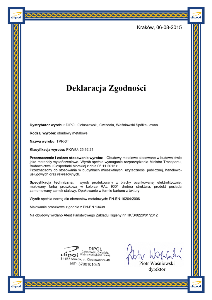 Kraków, 06-08-2015 Deklaracja Zgodności Dystrybutor wyrobu: DIPOL Gołaszewski, Gwizdała, Waśniowski Spółka Jawna Rodzaj wyrobu: obudowy metalowe Nazwa wyrobu: TPR-3T Klasyfikacja wyrobu: PKWiU: 25.92.21 Przeznaczenie i zakres stosowania wyrobu: Obudowy metalowe stosowane w budownictwie jako materiały wykończeniowe. Wyrób spełnia wymagania rozporządzenia Ministra Transportu, Budownictwa i Gospodarki Morskiej z dnia 06.11.2012 r. Przeznaczony do stosowania w budynkach mieszkalnych, użyteczności publicznej, handlowousługowych oraz rekreacyjnych. Specyfikacja techniczna: wyrób produkowany z blachy ocynkowanej elektrolitycznie, malowany farbą proszkową w kolorze RAL 9001 drobna struktura, produkt posiada zamontowany zamek stalowy. Opakowanie w formie kartonu z tektury. Wyrób spełnia normę dla elementów metalowych: PN-EN 10204:2006 Malowanie proszkowe z godnie z PN-EN 13438 Na obudowy wydano Atest Państwowego Zakładu Higieny nr HK/B/0220/01/2012 Piotr Waśniowski dyrektor