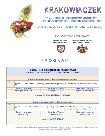 XXVI Przegląd Dziecięcych Zespołów Folklorystycznych Regionu Krakowskiego 7 czerwca 2015 r. Amfiteatr letni w Łoniowej HONOROWY PATRONAT Andrzej POTĘPA Starosta Brzeski Wiesław KOZŁOWSKI Wójt Gminy Dębno PROGRAM GODZ. 11:00 ROZPOCZĘCIE PREZENTACJI DZIECIĘCYCH ZESPOŁÓW FOLKLORYSTYCZNYCH Zespół prezentujący folklor w formie opracowanej artystycznie 1. godz. 11:10 – 11:30 Dziecięcy Zespół Folklorystyczny z Kokotowa, gm. Wieliczka, pow. wielicki Twórca programu Katarzyna SKOCZEK Instruktor Zespołu Katarzyna SKOCZEK Kierownik muzyczny Agnieszka MAKARSKA program: KRAKOWSKIE ZABAWY I TAŃCE Zespół prezentujący folklor w formie autentycznej 2. godz. 11:33 – 11:53 Dziecięcy Zespół Regionalny RZEPIOKI z Rzepiennika Suchego gm. Rzepiennik Strzyżewski, pow. tarnowski Twórca programu Anna BUGNO Instruktor Zespołu Anna BUGNO Kierownik muzyczny Anna BUGNO program: PASE JO SE PASE Opracowała: Beata ROMPAŁA – koordynator 26. edycji Przeglądu Dziecięcych Zespołów Folklorystycznych Regionu Krakowskiego KRAKOWIACZEK Zespół prezentujący folklor w formie opracowanej artystycznie 3. godz. 11:56 – 12:24 Dziecięcy Zespół Folklorystyczny MALI JASTRZĘBIANIE z Jastrzębi, gm. Ciężkowice, pow. tarnowski Twórca programu Janusz CIERLIK Instruktor Zespołu JANUSZ CIERLIK Kierownik muzyczny Stanisław DEŚ program: JAK HANKA „SPŁOD ŚWIERKU” Z DZIEWUCHAMI OŁTARZ NA BOZE CIAŁO RYKTOWAŁY, A DZIECISKA SIĘ BAWIUŁY Zespół prezentujący folklor w formie opracowanej artystycznie 4. godz. 12:26 – 12:46 Dziecięcy Zespół Pieśni i Tańca MALI ŁONIOWIACY z Łoniowej, gm. Dębno, pow. brzeski Twórca programu Kazimierz GÓRCZAK Instruktor Zespołu Kazimierz GÓRCZAK Kierownik muzyczny Zenon PIĘKOŚ program: WIOSNA IDZIE Zespół prezentujący folklor w formie autentycznej 5. godz. 12:50 – 13:15 Dziecięcy Zespół Folklorystyczny NIECZAJNIANIE z Nieczajnej Górnej, gm. Dąbrowa Tarnowska, pow. dąbrowski Twórca programu Jowita WILOWSKI Instruktor Zespołu Jowita WILOWSKI Kierownik muzyczny Kamil BANAŚ program: Z WIZYTĄ W NIECZAJNIAŃSKIEJ ZAGRODZIE Zespół prezentujący folklor w formie autentycznej 6. godz. 13:18 – 13:40 Dziecięcy Zespół Folklorystyczny MAŁY GWOŹDZIEC z Gwoźdźca gm. Zakliczyn, pow. tarnowski Twórca programu Janusz CIERLIK Instruktor Zespołu Janusz CIERLIK Kierownik muzyczny Andrzej SOJA program: PRZY GOŚCIŃCU KAPELE LUDOWE 7. godz. 13:42 – 13:47 Dziecięca Kapela Ludowa PASTUSZKOWE GRANIE - mali ze Szczurowej, gm. Szczurowa, pow. brzeski Kierownik Kapeli Ludowej program: KRAKOWIAK – „A JOK JO SE CISNE” WALCZYK – „NAD WODĄ W WIECZORNEJ Michał PASTUCH CISZY” JADOWNICKA POLKA Opracowała: Beata ROMPAŁA – koordynator 26. edycji Przeglądu Dziecięcych Zespołów Folklorystycznych Regionu Krakowskiego KRAKOWIACZEK 8. godz. 13:49– 13:54 Dziecięca Kapela Ludowa ZALASOWIOCKI z Zalasowej gm. Ryglice, pow. tarnowski Kierownik Kapeli Ludowej Anna WENC - ZABAWA program: KRAKOWIAK – „Z GÓR CI JO DZIEWCYNO” WALCZYK – „OJ, ZAGROJ MI MUZYCKO” KRAKOWIAK – „NIE BĘDĘ JO PASŁA” 9. godz. 13:56 – 14:01 Dziecięca Kapela Ludowa PASTUSZKOWE GRANIE - średni ze Szczurowej, gm. Szczurowa, pow. brzeski Kierownik Kapeli Ludowej Michał PASTUCH program: KRAKOWIAK – „MUZYKA MI GRAŁA” WALCZYK – „ Z TAMTEJ STRONY WODY” HURA - POLKA POLKA OD TOŃSKIEGO Zespół prezentujący folklor w formie opracowanej artystycznie 10. godz. 14:06 – 14:26 Dziecięcy Zespół Regionalny MALI ŁYSOGÓRZANIE z Łysej Góry gm. Dębno, pow. brzeski Twórca programu Janusz CIERLIK Twórca programu Janusz CIERLIK Kierownik muzyczny Tomasz PABIAN program: KRAKOWIACZEK CI JA Zespół prezentujący folklor w formie autentycznej 11. godz. 14:30– 14:50 Twórca programu Stanisław GURGUL Dziecięcy Zespół Ludowy ZŁOCOKI ze Złotej, gm. Czchów, pow. brzeski Twórca programu Kierownik muzyczny Stanisław GURGUL Stanisław GURGUL program: U STRYKA POD SZOPĄ Zespół prezentujący folklor w formie autentycznej 12. godz. 14:55– 15:15 Dziecięcy Zespół Folklorystyczny ŁĄKTA z Łąkty Górnej gm. Żegocina, pow. bocheński Twórca programu Maria DUDEK Instruktor Zespołu Maria DUDEK Kierownik muzyczny Mieczysław KĘDRA program: JAK UJEK GRAĆ UCYLI Opracowała: Beata ROMPAŁA – koordynator 26. edycji Przeglądu Dziecięcych Zespołów Folklorystycznych Regionu Krakowskiego KRAKOWIACZEK Zespół prezentujący folklor w formie autentycznej 13. godz. 15:20 – 15:50 Dziecięcy Zespół Regionalny MALI BISKUPIANIE z Biskupic Radłowskich, gm. Radłów, pow. tarnowski Twórca programu Instruktor Zespołu Kierownik muzyczny Janusz CIERLIK Janusz CIERLIK Ryszard SROGA program: JAK TO W JARMAK DZIECISKA U HANKI PYTLOWEJ SIĘ BAWIŁY Zespół prezentujący folklor w formie opracowanej artystycznie 14. godz. 15:55 – 16:10 Dziecięcy Zespół Ludowy WOLANIE z Woli Radłowskiej gm. Radłów, pow. tarnowski Twórca programu Instruktor Zespołu Kierownik muzyczny Kinga BIEL - DUBIEL Kinga BIEL - DUBIEL Grzegorz GAWEŁEK program: OJ! BĘDZIE SIĘ DZIAŁO Zespół prezentujący folklor w formie autentycznej 15. godz. 16:12 – 16:32 Dziecięcy Zespół Folklorystyczny MALI ŁONIOWIACY z Łoniowej, gm. Dębno, pow. brzeski Twórca programu Instruktor Zespołu Kierownik muzyczny Maria DUDEK Maria DUDEK Tomasz PABIAN program: MIETEŁECKA UJKA Zespół prezentujący folklor w formie opracowanej artystycznie 16. godz. 16:34 – 16:54 Dziecięcy Zespół Ludowy MALI SIEMIECHOWIANIE z Siemiechowa gm. Gromnik, pow. tarnowski Twórca programu Janusz CIERLIK Instruktor Zespołu Janusz CIERLIK Kierownik muzyczny Zenon PAJOR program: Z WIZYTĄ W NIECZAJNIAŃSKIEJ ZAGRODZIE Zespół prezentujący folklor w formie autentycznej 17. godz. 17:00 – 17:30 Dziecięcy Zespół Folklorystyczny BOBROWIANIE z Bobrownik Wielkich, gm. Żabno, pow. tarnowski Twórca programu Instruktor Zespołu Kierownik muzyczny Magdalena WITKOWSKA Katarzyna MAZUREK M