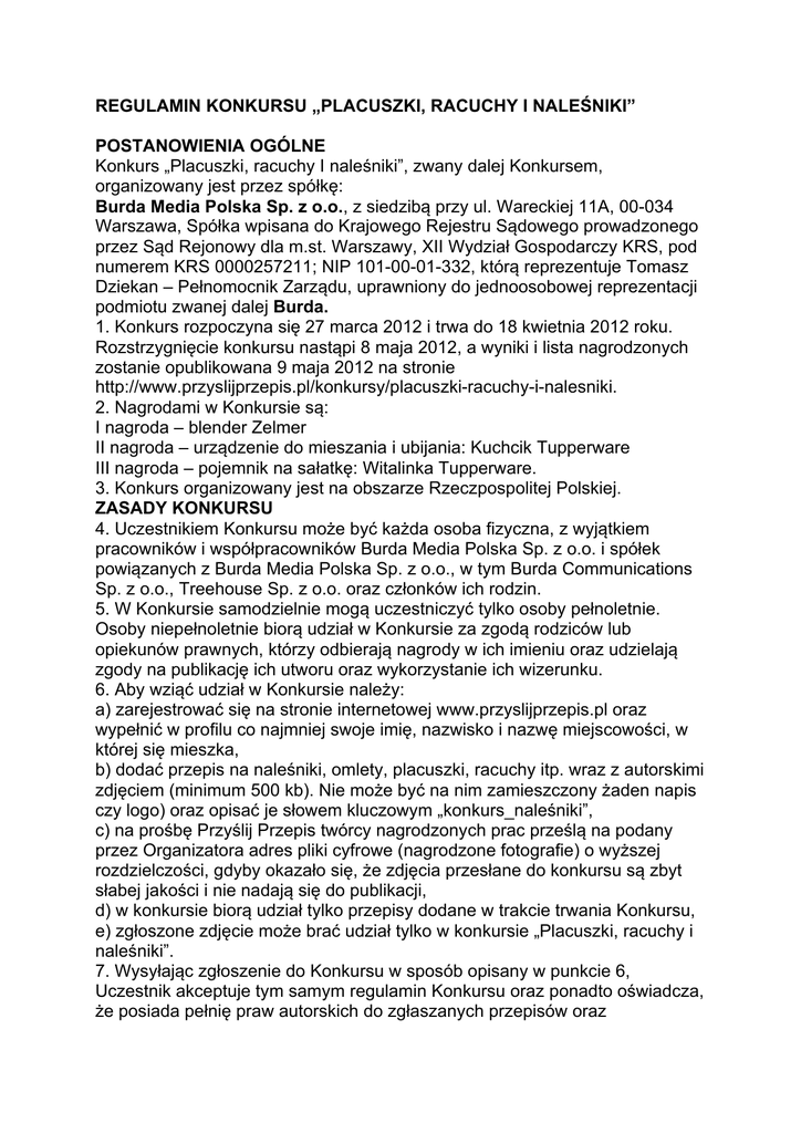 REGULAMIN KONKURSU „PLACUSZKI, RACUCHY I NALEŚNIKI” POSTANOWIENIA OGÓLNE Konkurs „Placuszki, racuchy I naleśniki”, zwany dalej Konkursem, organizowany jest przez spółkę: Burda Media Polska Sp. z o.o., z siedzibą przy ul. Wareckiej 11A, 00-034 Warszawa, Spółka wpisana do Krajowego Rejestru Sądowego prowadzonego przez Sąd Rejonowy dla m.st. Warszawy, XII Wydział Gospodarczy KRS, pod numerem KRS 0000257211; NIP 101-00-01-332, którą reprezentuje Tomasz Dziekan – Pełnomocnik Zarządu, uprawniony do jednoosobowej reprezentacji podmiotu zwanej dalej Burda. 1. Konkurs rozpoczyna się 27 marca 2012 i trwa do 18 kwietnia 2012 roku. Rozstrzygnięcie konkursu nastąpi 8 maja 2012, a wyniki i lista nagrodzonych zostanie opublikowana 9 maja 2012 na stronie http://www.przyslijprzepis.pl/konkursy/placuszki-racuchy-i-nalesniki. 2. Nagrodami w Konkursie są: I nagroda – blender Zelmer II nagroda – urządzenie do mieszania i ubijania: Kuchcik Tupperware III nagroda – pojemnik na sałatkę: Witalinka Tupperware. 3. Konkurs organizowany jest na obszarze Rzeczpospolitej Polskiej. ZASADY KONKURSU 4. Uczestnikiem Konkursu może być każda osoba fizyczna, z wyjątkiem pracowników i współpracowników Burda Media Polska Sp. z o.o. i spółek powiązanych z Burda Media Polska Sp. z o.o., w tym Burda Communications Sp. z o.o., Treehouse Sp. z o.o. oraz członków ich rodzin. 5. W Konkursie samodzielnie mogą uczestniczyć tylko osoby pełnoletnie. Osoby niepełnoletnie biorą udział w Konkursie za zgodą rodziców lub opiekunów prawnych, którzy odbierają nagrody w ich imieniu oraz udzielają zgody na publikację ich utworu oraz wykorzystanie ich wizerunku. 6. Aby wziąć udział w Konkursie należy: a) zarejestrować się na stronie internetowej www.przyslijprzepis.pl oraz wypełnić w profilu co najmniej swoje imię, nazwisko i nazwę miejscowości, w której się mieszka, b) dodać przepis na naleśniki, omlety, placuszki, racuchy itp. wraz z autorskimi zdjęciem (minimum 500 kb). Nie może być na nim zamieszczony żaden napis czy logo) oraz opisać je słowem kluczowym „konkurs_naleśniki”, c) na prośbę Przyślij Przepis twórcy nagrodzonych prac prześlą na podany przez Organizatora adres pliki cyfrowe (nagrodzone fotografie) o wyższej rozdzielczości, gdyby okazało się, że zdjęcia przesłane do konkursu są zbyt słabej jakości i nie nadają się do publikacji, d) w konkursie biorą udział tylko przepisy dodane w trakcie trwania Konkursu, e) zgłoszone zdjęcie może brać udział tylko w konkursie „Placuszki, racuchy i naleśniki”. 7. Wysyłając zgłoszenie do Konkursu w sposób opisany w punkcie 6, Uczestnik akceptuje tym samym regulamin Konkursu oraz ponadto oświadcza, że posiada pełnię praw autorskich do zgłaszanych przepisów oraz ewentualnych zdjęć użytych w przepisie, dodatkowo zgłaszając przepis do Konkursu nie narusza praw osób trzecich i udziela Burda Media Polska Sp. z o.o., Burdzie Communications Sp. z o.o. oraz Treehouse Sp. z o.o. nieodpłatnie i bezterminowo prawa do korzystania z przepisu, zdjęć oraz ich publikację. 8. Wysyłając zgłoszenie do Konkursu, a tym samym akceptując regulamin Konkursu, uczestnik Konkursu jednocześnie wyraża zgodę na dokonanie opracowania przesłanego przepisu i zdjęć, w zakresie niezbędnym z punktu widzenia technicznego, do nieodpłatnego opublikowania przepisu oraz zdjęć w magazynach związanych z Burda Media Polska Sp. z o.o., Burda Communications Sp. z o.o. i Treehouse Sp. z o.o. 9. Wysyłając zgłoszenie do Konkursu, a tym samym akceptując regulamin Konkursu, uczestnik udziela Burda Media Polska Sp. z o.o., Burda Communications Sp. z o.o. oraz Treehouse Sp. z o.o. w Warszawie, (dalej: „Spółka”) zezwolenia na nieodpłatne rozpowszechnianie i wykorzystywanie przez Spółkę, udostępnionego w ramach serwisu internetowego www.przyslijprzepis.pl (dalej: „Serwis”) wizerunku (w rozumieniu kodeksu cywilnego oraz ustawy o prawie autorskim i prawach pokrewnych) w celu umożliwienia prawidłowego i pełnego funkcjonowania świadczonych przez Spółkę usług lub funkcjonalności, w celach reklamowych prowadzonych z wykorzystaniem Serwisu przez Spółkę. Zgadza się także na nieodpłatne rozpowszechnianie i wykorzystywanie jego wizerunku jako wizerunku autora zamieszczanych przez niego w Serwisie treści, także w publikacjach poza Serwisem w tym w formie wydawnictw drukowanych (np. książek, czasopism, gazet), przy czym rozpowszechnienie takie może nastąpić tylko wraz z publikacją jego utworów lub ich części z zachowaniem praw i obowiązków wynikających z zawartej umowy licencyjnej. 10. Nagrody w Konkursie otrzymają 3 osoby, których przepisy zostaną ocenione przez redakcyjną kucharkę jako najciekawsze. 11. Warunkiem udziału w Konkursie i odebrania nagrody jest podanie pełnych i prawdziwych danych osobowych (imienia, nazwiska oraz adresu, na który ma zostać wysłana nagroda wraz z telefonem kontaktowym dla kuriera). 12. Zwycięzca zezwala na publiczne ujawnienie na stronach www.burdamedia.pl, www.przyslijprzepis.pl oraz w magazynie Przyślij Przepis swojego imienia i nazwiska oraz nazwy miejscowości, w której mieszka. 13. Uczestnik ma prawo do otrzymania tylko jednej nagrody. 14. Nagroda nie podlega zamianie na inne nagrody lub ekwiwalent pieniężny. 15. Nagrody wysyłane są do zwycięzców tylko na terenie Rzeczpospolitej Polskiej. 16. Zwycięzcy, którym zostały przyznane nagrody nie mogą przenieść praw do przyznanej mu nagrody na osoby trzecie. 17. Nagrody zostaną wysłane przesyłką pocztową bądź kurierską do Zwycięzców na podany przez Zwycięzców adres w ciągu 2 miesięcy od momentu ogłoszenia wyników. 18. W przypadku nieodebrania przesyłki przez zwycięzców przesyłka zostanie zwrócona do siedziby Organizatora (Burda Media Polska Sp. z o.o., z siedzibą przy ul. Ostrowskiego 7, 53-238 Wrocław), skąd zwycięzcy będą mogli ją ode