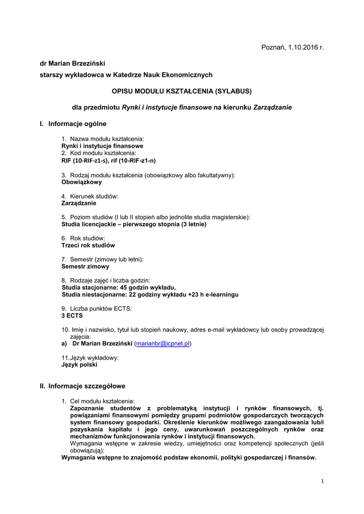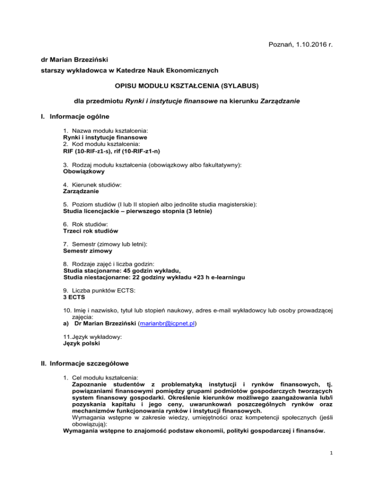 Poznań, 1.10.2016 r. dr Marian Brzeziński starszy wykładowca w Katedrze Nauk Ekonomicznych OPISU MODUŁU KSZTAŁCENIA (SYLABUS) dla przedmiotu Rynki i instytucje finansowe na kierunku Zarządzanie I. Informacje ogólne 1. Nazwa modułu kształcenia: Rynki i instytucje finansowe 2. Kod modułu kształcenia: RIF (10-RIF-z1-s), rif (10-RIF-z1-n) 3. Rodzaj modułu kształcenia (obowiązkowy albo fakultatywny): Obowiązkowy 4. Kierunek studiów: Zarządzanie 5. Poziom studiów (I lub II stopień albo jednolite studia magisterskie): Studia licencjackie – pierwszego stopnia (3 letnie) 6. Rok studiów: Trzeci rok studiów 7. Semestr (zimowy lub letni): Semestr zimowy 8. Rodzaje zajęć i liczba godzin: Studia stacjonarne: 45 godzin wykładu, Studia niestacjonarne: 22 godziny wykładu +23 h e-learningu 9. Liczba punktów ECTS: 3 ECTS 10. Imię i nazwisko, tytuł lub stopień naukowy, adres e-mail wykładowcy lub osoby prowadzącej zajęcia: a) Dr Marian Brzeziński ([email protected]) 11. Język wykładowy: Język polski II. Informacje szczegółowe 1. Cel modułu kształcenia: Zapoznanie studentów z problematyką instytucji i rynków finansowych, tj. powiązaniami finansowymi pomiędzy grupami podmiotów gospodarczych tworzących system finansowy gospodarki. Określenie kierunków możliwego zaangażowania lub/i pozyskania kapitału i jego ceny, uwarunkowań poszczególnych rynków oraz mechanizmów funkcjonowania rynków i instytucji finansowych. Wymagania wstępne w zakresie wiedzy, umiejętności oraz kompetencji społecznych (jeśli obowiązują): Wymagania wstępne to znajomość podstaw ekonomii, polityki gospodarczej i finansów. 1 2. Efekty kształcenia w zakresie wiedzy, umiejętności oraz kompetencji społecznych dla modułu kształcenia i odniesienie do efektów kształcenia dla kierunku studiów: Symbol efektów kształcenia Odniesienie do efektów Po zakończeniu modułu (przedmiotu) i potwierdzeniu kształcenia dla kierunku osiągnięcia efektów kształcenia student potrafi: studiów RIF_01 Zna zasady funkcjonowania podstawowych podmiotów rynku finansowego. K_W01, K_W02-03 RIF _02 Zna specyfikę rynków finansowych. KW_06-07, K-U01-04 RIF _03 Odpowiednio dobierać dane, tworzyć informacje i kształtować wiedzę niezbędną dla podejmowania decyzji dotyczących pozyskaniu kapitału. K_W01, K_W02-03, KW_0809, K-U01-04 RIF _04 Podejmować optymalne decyzje dotyczące pozyskania źródeł pozyskania kapitału i jego kosztu. K_W01, K_W06-07, K-U0104 RIF_05 Właściwie dobierać i stosować narzędzia realizacji celu ekonomicznego przy uwzględnieniu uwarunkowań funkcjonowania instytucji rynku finansowego. K_W04, K_W06-09, K-U0104 RIF _06 Rozumieć i wykorzystywać uwarunkowania wybranych instrumentów rynków finansowych. K_W01, K_W02-04, K_W0609, K-U01-04, K_U07 3. Treści kształcenia: Nazwa modułu kształcenia: Rynki i instytucje finansowe (RIF) Symbol treści kształcenia Opis treści kształcenia Odniesienie do efektów kształcenia modułu TK_01 1. Pieniądz (funkcje i definicje, formy pieniądza, podaż pieniądza w gospodarce) RIF _01 TK_02 2. Niepieniężne instrumenty finansowe. Stopy procentowe i dyskontowe RIF _01-02 TK_03 3. Struktura podmiotowa systemu finansowego gospodarki. RIF _01-03 TK_04 TK_05 TK_06 TK_07 TK_08 4. Dwuszczeblowy sektor bankowy – bankowość centralna. Usługi komercyjne banków depozytowokredytowych. Instytucje pożyczkowe (parabanki). Niedepozytowe instytucje pośrednictwa finansowego 5. Rynki finansowe – podmioty, klasyfikacja. 6. Rynki pieniężne. 7. Rynki kapitałowe 8. Rynek terminowych instrumentów finansowych – zagadnienia wybrane. RIF _03-05 RIF _01-05 RIF _01-05 RIF _01-06 RIF _01-06 4. Zalecana literatura: 2 Marian Górski, Rynkowy System finansowy, Państwowe Wydawnictwo Ekonomiczne, Warszawa 2009. Dodatkowo: materiały pomocnicze przekazane słuchaczom w trakcie wykładów). 5. Informacja o przewidywanej możliwości wykorzystania b-learningu: Brak 6. Informacja o tym, gdzie można zapoznać się z materiałami do zajęć, instrukcjami, itp.: Ewentualne informacje o charakterze i dostępności materiałów potrzebnych do zajęć przekazują prowadzący zajęcia na początku roku akademickiego. III. Informacje dodatkowe 1. Odniesienie efektów kształcenia i treści kształcenia do sposobów prowadzenia zajęć i metod oceniania: Symbol efektu kształcenia dla modułu ZP_01 Nazwa modułu (przedmiotu): Rynki i instytucje finansowe (RIF) Sposoby prowadzenia zajęć Metody oceniania Symbol treści kształcenia umożliwiające osiągnięcie stopnia osiągnięcia realizowanych w trakcie założonych efektów założonego efektu zajęć kształcenia kształcenia Multimedialny wykład oraz ćwiczenia polegające na rozwiązywaniu określonych TK_01-08 Egzamin pisemny problemów z zakresu zarządzania systemami informacji ZP_02 TK_01-02, TK_04-08 J.w. J.w. ZP_03 TK_01-08 J.w. J.w. ZP_04 TK_01-08 J.w. J.w. ZP_05 TK_01-08 J.w. J.w. ZP_06 TK_01-08 J.w. J.w. Przykładowe podstawowe pytania poszczególnych treści kształcenia. egzaminacyjne są identyczne jak ww. opisy 2. Obciążenie pracą studenta (punkty ECTS): Nazwa modułu (przedmiotu): Rynki i instytucje finansowe (RIF) Forma aktywności Godziny zajęć (wg planu studiów) z nauczycielem Praca własna studenta Suma godzin Sumaryczna liczba punktów ECTS dla modułu (przedmiotu) Średnia liczba godzin na zrealizowanie aktywności Studia stacjonarne: 45 godzin wykładu, Studia niestacjonarne: 22 godzin wykładu 45 h na studiach stacjonarnych 45 h na studiach niestacjonarnych, w tym 23 h e-learningu 90 3 3. Sumaryczne wskaźniki ilościowe: Liczba punktów ECTS, którą student uzyskuje na zajęciach wymagających bezpośredniego udziału nauczycieli akademickich: 3 3 punkty ECTS Student otrzymuje wszystkie ww. punkty ECTS za zaliczenie całego modułu Rynki i instytucje finansowe, tzn. za ostateczne zaliczenie z oceną pozytywną egzaminu pisemnego z tego przedmiotu. 4. Kryteri