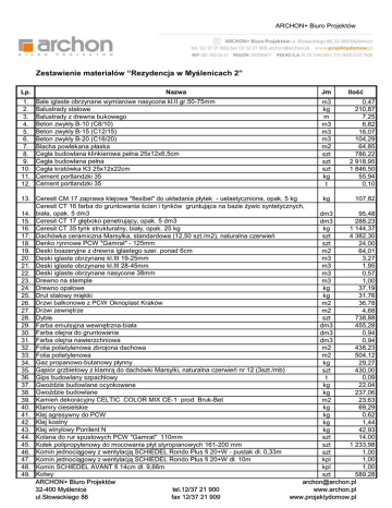 ARCHON+ Biuro Projektów Zestawienie materiałów “Rezydencja w Myślenicach 2” Lp. 1. 2. 3. 4. 5. 6. 7. 8. 9. 10. 11. 12. Nazwa Bale iglaste obrzynane wymiarowe nasycone kl.II gr.50-75mm Balustrady stalowe Balustrady z drewna bukowego Beton zwykły B-10 (C8/10) Beton zwykły B-15 (C12/15) Beton zwykły B-20 (C16/20) Blacha powlekana płaska Cegła budowlana klinkierowa pełna 25x12x6,5cm Cegła budowlana pełna Cegła kratówka K3 25x12x22cm Cement portlandzki 35 Cement portlandzki 35 Jm Ilość m3 kg m m3 m3 m3 m2 szt szt szt kg t 0,47 210,87 7,25 6,82 16,07 104,29 64,85 786,22 2 918,95 1 846,50 55,94 0,10 13. Ceresit CM 17 zaprawa klejowa "flexibel" do układania płytek - uelastyczniona, opak. 5 kg kg 107,82 Ceresit CT 16 farba do gruntowania ścian i tynków gruntująca na bazie żywic syntetycznych, 14. biała, opak. 5 dm3 dm3 95,48 15. Ceresit CT 17 głęboko penetrujący, opak. 5 dm3 dm3 288,23 kg 1 144,37 16. Ceresit CT 35 tynk strukturalny, biały, opak. 25 kg 17. Dachówka ceramiczna Marsylka, standardowa (12,50 szt./m2), naturalna czerwień szt 4 382,30 szt 24,00 18. Denko rynnowe PCW "Gamrat" - 125mm 19. Deski boazeryjne z drewna iglastego szer. ponad 6cm m2 64,01 m3 3,27 20. Deski iglaste obrzynane kl.III 19-25mm 21. Deski iglaste obrzynane kl.III 28-45mm m3 1,95 22. Deski iglaste obrzynane nasycone 38mm m3 0,57 m3 1,00 23. Drewno na stemple 24. Drewno opałowe kg 37,19 25. Drut stalowy miękki kg 31,76 26. Drzwi balkonowe z PCW Oknoplast Kraków m2 36,78 27. Drzwi zewnętrze m2 4,68 28. Dyble szt 738,88 29. Farba emulsyjna wewnętrzna-biała dm3 455,28 30. Farba olejna do gruntowania dm3 0,94 31. Farba olejna nawierzchniowa dm3 0,94 Folia polietylenowa zbrojona dachowa 32. m2 438,23 33. Folia polietylenowa m2 504,12 kg 29,27 34. Gaz propanowo-butanowy płynny 35. Gąsior grzbietowy z klamrą do dachówki Marsylki, naturalna czerwień nr 12 (3szt./mb) szt 430,00 t 0,09 36. Gips budowlany szpachlowy 37. Gwoździe budowlane ocynkowane kg 22,04 38. Gwoździe budowlane kg 237,06 39. Kamień dekoracyjny CELTIC COLOR MIX CE-1 prod. Bruk-Bet m2 23,63 kg 69,29 40. Klamry ciesielskie 41. Klej agresywny do PCW kg 0,62 42. Klej kostny kg 1,44 Klej winylowy Ponilent N 43. kg 42,93 44. Kolana do rur spustowych PCW "Gamrat" 110mm szt 14,00 45. Kołek polipropylenowy do mocowania płyt styropianowych 161-200 mm szt 1 233,98 szt 1,00 46. Komin jednociągowy z wentylacją SCHIEDEL Rondo Plus fi 20+W - pustak dł. 0,33m 47. Komin jednociągowy z wentylacją SCHIEDEL Rondo Plus fi 20+W dł. 10m kpl 1,00 48. Komin SCHIEDEL AVANT fi 14cm dł. 9,66m kpl 1,00 49. Kotwy szt 589,28 ARCHON+ Biuro Projektów [email protected] 32-400 Myślenice tel.12/37 21 900 www.archon.pl ul.Słowackiego 86 fax 12/37 21 909 www.projektydomow.pl ARCHON+ Biuro Projektów 50. 51. 52. 53. 54. 55. 56. 57. 58. 59. 60. 61. 62. 63. 64. 65. 66. 67. 68. 69. 70. 71. 72. 73. 74. 75. 76. 77. 78. 79. 80. 81. 82. 83. 84. 85. 86. 87. 88. 89. 90. 91. 92. 93. 94. 95. 96. 97. 98. 99. 100. 101. 102. 103. 104. 105. 106. 107. 108. Kratki wentylacyjne z PCW 14x14cm bez żaluzji Kratki wentylacyjne z PCW 14x21cm z żaluzją Krawędziaki iglaste wymiarowe nasycone kl.II Ksylamit popularny Kształtowniki profilowane CD-60/27 Kształtowniki profilowane UD-28/27 Lakier do drewna XYLADEKORM Leje spustowe z PCV "Gamrat" - 125mm Listewki iglaste 10x15mm kl.II Listwy przyścienne z drewna Łaty iglaste wymiarowe nasycone kl.II Ławka kominiarska 1,00m ze wspornikami i kołyskami Łączniki krzyżowe lj 60/60 Łączniki wzdłużne lw 60/110 Masa asfaltowa stos. na zimno do izolacji Masa szpachlowa Rigidur, opak. 5 kg Masa uszczelniająca SUPERFLEX-10 Mieszanka żwirowo-piaskowa Nadproża POROTHERM 11,5 o dł. belki 125 cm Nadproża POROTHERM 11,5 o dł. belki 200cm Narożnik rynnowy PCW "Gamrat" - 125mm Obrzeże trawnikowe o wym. 6x25x100 cm, kolor szary Okapy z blachy powlekanej Okna z PCW Oknoplast Kraków Ościeżnice drzwiowe fabr.wykończone Panele podłogowe z płyty HDF, kl. AC4 Papa asfaltowa na tekturze izolacyjna 400 Papa polimerowo-asfaltowa zgrzewalna na osnowie z włókniny poliestrowej Parapety z płyty wiórowej wodoodp. frezowane szer. 25cm Pianka podpodłogowa gr. 3mm Pianka poliuretanowa Piasek Płytki ceramiczne lub terakotowe 15x15cm Płytki ceramiczne lub terakotowe 20x20cm gat.I Płytki ceramiczne lub terakotowe 30x30cm gat.I Płytki kamionkowe GRES 30x30cm Płyty gipsowo-kartonowe ognioochronne 12,5mm Płyty MFP Pfleiderer gr.25mm Płyty styropianowe EPS 100-038 Termo Organika Płyty styropianowe EPS 70-040 Termo Organika Płyty styropianowe EPS T Termo Organika Płyty z polistyrenu ekstrudowanego odm.300 Płyty z wełny mineralnej - poddasza 12cm Isover Uni-Mata Płyty z wełny mineralnej - poddasza 15cm Isover Uni-Mata 0,039 W/mK Płyty z wełny mineralnej - poddasza 5cm Isover Super-Mata 0,033 W/mK Płyty z wełny mineralnej grub.20cm Preparat gruntujący CERESIT CT 17 Pręty mocujące Pręty zbrojeniowe gładkie 8mm S235JR Pręty zbrojeniowe gładkie 6mm S235JR Pręty zbrojeniowe żebrowane 10mm B500SP Pręty zbrojeniowe żebrowane 12mm B500SP Pręty zbrojeniowe żebrowane 16mm B500SP Pręty zbrojeniowe żebrowane 20mm B500SP Pręty zbrojeniowe żebrowane 8mm B500SP Pustak wentylacyjny Schiedel 2x12/17 Pustaki ceramiczne POROTHERM 25 P+W 250x375x238mm Rozcieńczalnik Roztwór asfaltowy do izolacji fundamentów Izolbet S ARCHON+ Biuro Projektów 32-400 Myślenice ul.Słowackiego 86 tel.12/37 21 900 fax 12/37 21 909 szt szt m3 kg m m dm3 szt m m m3 kpl szt szt kg kg dm3 m3 szt szt szt m m m2 m m2 m2 m2 m m2 dm3 m3 m2 m2 m2 m2 m2 m2 m3 m3 m3 m3 m2 m2 m2 m2 dm3 szt t t t t t t t szt szt dm3 kg 9,00 10,00 15,34 2,33 548,78 115,54 12,19 21,00 62,68 248,82 2,15 3,00 237,26 109,75 21,70 866,49 120,13 33,70 10,00 4,00 30,00 66,85 132,77 46,16 85,36 223,08 43,40 337,42 23,40 225,23 31,73 0,54 10,55 63,32 83,84 13,78 303,27 121,40 17,01 41,16 6,15 11,25 33,56 130,34 130,34 83,84 62,31 201,76 0,23 0,45 3,42 2,07 0,15 0,42 0,74 6