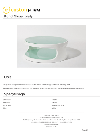 Rond Glass, biały Opis Elegancki okrągły stolik kawowy Rond Glass o finezyjnej podstawie, szklany blat. Sprawdzi się również jako stolik do recepcji, stolik do poczekalni, stolik do pokoju młodzieżowego. Specyfikacja Wysokość 38 cm Średnica 89 cm Podstawa włókno szklane Blat szkło ----------------------------------------------------------------------------------------------------------------------------------LARB Sp. z o.o. S.K.A. 40-862 Katowice, ul. Gliwicka 275 Sąd Rejonowy dla Katowice-Wschód w Katowicach, VIII Wydział Gospodarczy KRS NIP: 6342817919 | REGON: 243235887 | KRS: 0000457871 www.customform.pl (32) 700 18 01 Page 1/2 Dodatkowe zdjęcia ----------------------------------------------------------------------------------------------------------------------------------LARB Sp. z o.o. S.K.A. 40-862 Katowice, ul. Gliwicka 275 Sąd Rejonowy dla Katowice-Wschód w Katowicach, VIII Wydział Gospodarczy KRS NIP: 6342817919 | REGON: 243235887 | KRS: 0000457871 www.customform.pl (32) 700 18 01 Page 2/2 Powered by TCPDF (www.tcpdf.org)