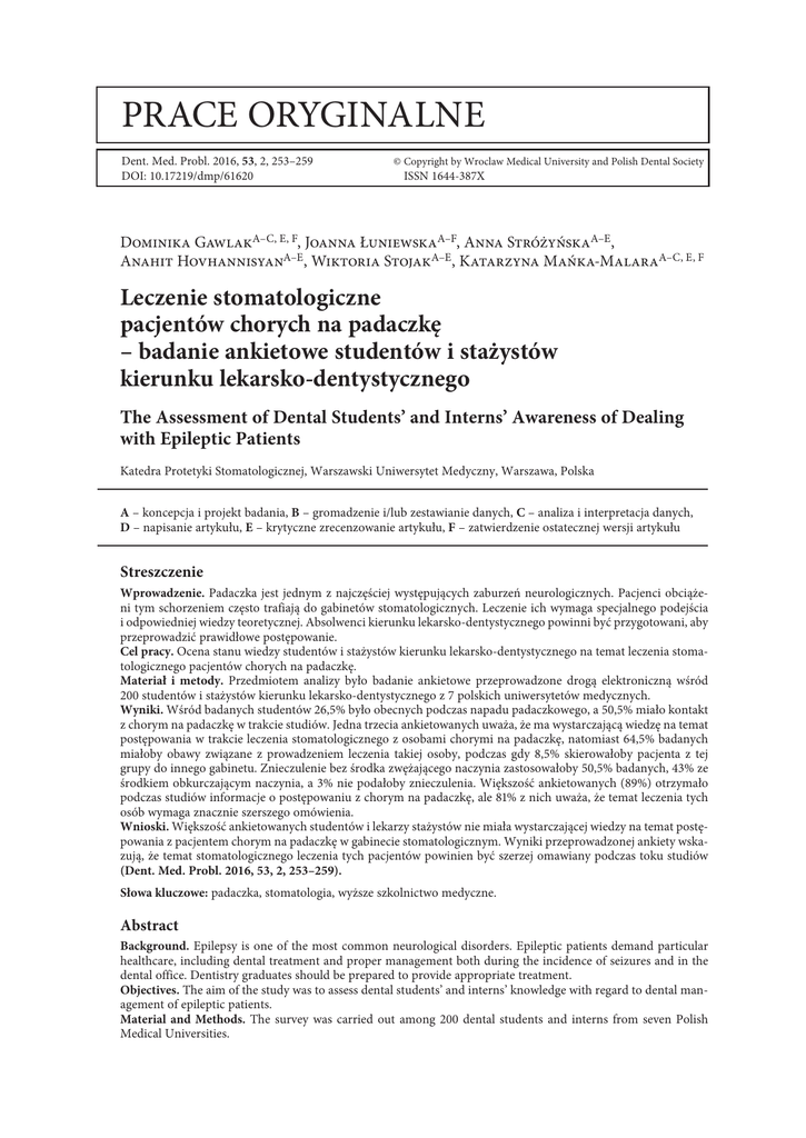 PRACE ORYGINALNE Dent. Med. Probl. 2016, 53, 2, 253–259 DOI: 10.17219/dmp/61620 © Copyright by Wroclaw Medical University and Polish Dental Society ISSN 1644-387X Dominika GawlakA–C, E, F, Joanna ŁuniewskaA–F, Anna StróżyńskaA–E, Anahit HovhannisyanA–E, Wiktoria StojakA–E, Katarzyna Mańka-MalaraA–C, E, F Leczenie stomatologiczne pacjentów chorych na padaczkę – badanie ankietowe studentów i stażystów kierunku lekarsko-dentystycznego The Assessment of Dental Students’ and Interns’ Awareness of Dealing with Epileptic Patients Katedra Protetyki Stomatologicznej, Warszawski Uniwersytet Medyczny, Warszawa, Polska A – koncepcja i projekt badania, B – gromadzenie i/lub zestawianie danych, C – analiza i interpretacja danych, D – napisanie artykułu, E – krytyczne zrecenzowanie artykułu, F – zatwierdzenie ostatecznej wersji artykułu Streszczenie Wprowadzenie. Padaczka jest jednym z najczęściej występujących zaburzeń neurologicznych. Pacjenci obciążeni tym schorzeniem często trafiają do gabinetów stomatologicznych. Leczenie ich wymaga specjalnego podejścia i odpowiedniej wiedzy teoretycznej. Absolwenci kierunku lekarsko-dentystycznego powinni być przygotowani, aby przeprowadzić prawidłowe postępowanie. Cel pracy. Ocena stanu wiedzy studentów i stażystów kierunku lekarsko-dentystycznego na temat leczenia stomatologicznego pacjentów chorych na padaczkę. Materiał i metody. Przedmiotem analizy było badanie ankietowe przeprowadzone drogą elektroniczną wśród 200 studentów i stażystów kierunku lekarsko-dentystycznego z 7 polskich uniwersytetów medycznych. Wyniki. Wśród badanych studentów 26,5% było obecnych podczas napadu padaczkowego, a 50,5% miało kontakt z chorym na padaczkę w trakcie studiów. Jedna trzecia ankietowanych uważa, że ma wystarczającą wiedzę na temat postępowania w trakcie leczenia stomatologicznego z osobami chorymi na padaczkę, natomiast 64,5% badanych miałoby obawy związane z prowadzeniem leczenia takiej osoby, podczas gdy 8,5% skierowałoby pacjenta z tej grupy do innego gabinetu. Znieczulenie bez środka zwężającego naczynia zastosowałoby 50,5% badanych, 43% ze środkiem obkurczającym naczynia, a 3% nie podałoby znieczulenia. Większość ankietowanych (89%) otrzymało podczas studiów informacje o postępowaniu z chorym na padaczkę, ale 81% z nich uważa, że temat leczenia tych osób wymaga znacznie szerszego omówienia. Wnioski. Większość ankietowanych studentów i lekarzy stażystów nie miała wystarczającej wiedzy na temat postępowania z pacjentem chorym na padaczkę w gabinecie stomatologicznym. Wyniki przeprowadzonej ankiety wskazują, że temat stomatologicznego leczenia tych pacjentów powinien być szerzej omawiany podczas toku studiów (Dent. Med. Probl. 2016, 53, 2, 253–259). Słowa kluczowe: padaczka, stomatologia, wyższe szkolnictwo medyczne. Abstract Background. Epilepsy is one of the most common neurological disorders. Epileptic patients demand particular healthcare, including dental treatment and proper management both during the incidence of seizures and in the dental office. Dentistry graduates should be prepared to provide appropriate treatment. Objectives. The aim of the study was to assess dental students’ and interns’ knowledge with regard to dental management of epileptic patients. Material and Methods. The survey was carried out among 200 dental students and interns from seven Polish Medical Universities. 254 D. Gawlak et al. Results. Twenty six point five percent of students witnessed epileptic seizures, 50.5% faced an epileptic patient during the studies. One-third of subjects admitted that they were aware of how to provide proper dental care. Sixty four point five percent of respondents would be afraid to perform dental treatment in epileptic patients, while 8.5% would refer patient to another clinic. Sexteen percent of students would not undertake prosthetic treatment in this group of patients. Fifty point five percent of respondents would administer anesthetics without vasoconstrictor, 43% with vasoconstrictor, 3% would not anesthetize at all, and 2.5% would perform all dental procedures under general anesthesia. Most of respondents (89%) reported that this topic was discussed during the course of their studies, whereas 81% of them expressed the necessity for the wider discussion on treating patients with special needs. Conclusions. The majority of examined dental students and interns did not have appropriate knowledge on how to deal with patients with epilepsy in dental office. The results of this survey indicate that issues connected with dental treatment of epileptic patients should be raised in broader dimension during the course of studies (Dent. Med. Probl. 2016, 53, 2, 253–259). Key words: epilepsy, dentistry, medical education, graduate. Padaczka jest jednym z najczęściej występujących zaburzeń układu nerwowego. Terminem tym obejmuje się grupę przewlekłych schorzeń neurologicznych, objawiających się występowaniem uogólnionych drgawek mięśni szkieletowych określanych mianem napadów padaczkowych, będących wyrazem nagłych i gwałtownych wyładowań komórek nerwowych istoty szarej, charakteryzujących się przerywanym, stereotypowym zaburzeniem świadomości, zachowania, emocji, czynności ruchowej, postrzegania lub czucia [1–4]. Obecnie zachorowalność dotyczy około 1% populacji [3, 4]. Liczba chorych w Polsce wynosi natomiast w przybliżeniu 400 tysięcy osób [5]. Jako główne przyczyny choroby podaje się urazy głowy, w tym okołoporodowe, naczyniowe choroby mózgu, zabiegi neurochirurgiczne, choroby zwyrodnieniowe i zanikowe, nowotwory pierwotne lub przerzutowe umiejscowione w mózgu, zapalenie mózgu bądź opon mózgowo-rdzeniowych oraz powikłania toksyczno-metaboliczne (m.in. alkoholizm) [6]. Prawdopodobieństwo wystąpienia napadu drgawkowego wśród ogółu populacji bez stwierdzonej epilepsji może os