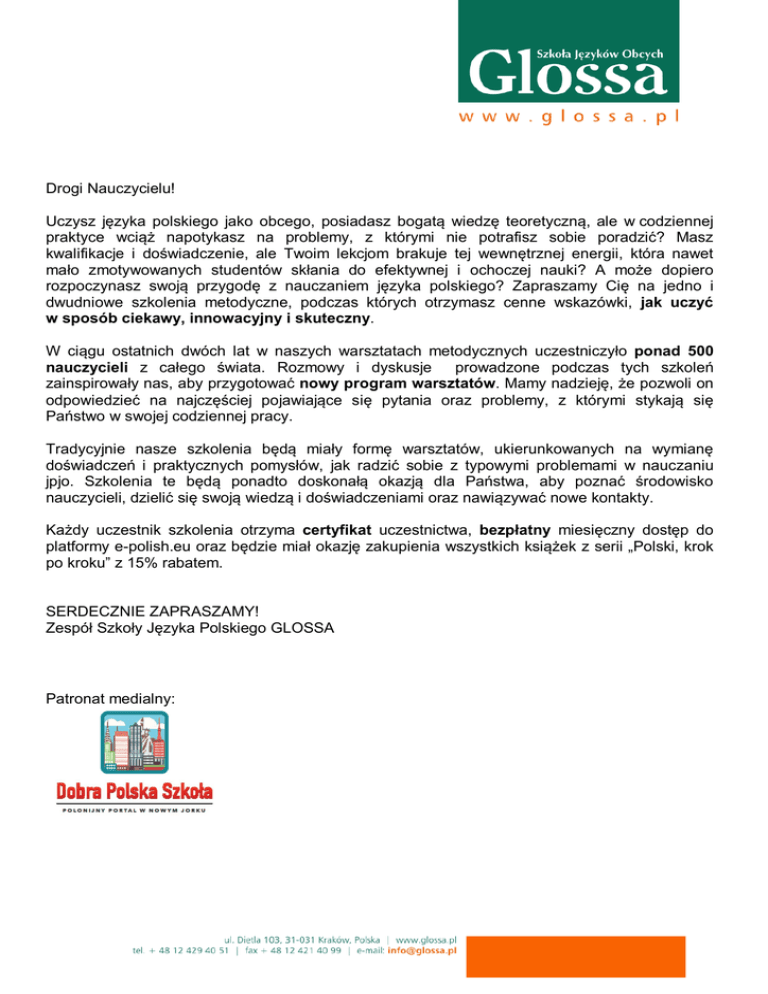 Drogi Nauczycielu! Uczysz języka polskiego jako obcego, posiadasz bogatą wiedzę teoretyczną, ale w codziennej praktyce wciąż napotykasz na problemy, z którymi nie potrafisz sobie poradzić? Masz kwalifikacje i doświadczenie, ale Twoim lekcjom brakuje tej wewnętrznej energii, która nawet mało zmotywowanych studentów skłania do efektywnej i ochoczej nauki? A może dopiero rozpoczynasz swoją przygodę z nauczaniem języka polskiego? Zapraszamy Cię na jedno i dwudniowe szkolenia metodyczne, podczas których otrzymasz cenne wskazówki, jak uczyć w sposób ciekawy, innowacyjny i skuteczny. W ciągu ostatnich dwóch lat w naszych warsztatach metodycznych uczestniczyło ponad 500 nauczycieli z całego świata. Rozmowy i dyskusje prowadzone podczas tych szkoleń zainspirowały nas, aby przygotować nowy program warsztatów. Mamy nadzieję, że pozwoli on odpowiedzieć na najczęściej pojawiające się pytania oraz problemy, z którymi stykają się Państwo w swojej codziennej pracy. Tradycyjnie nasze szkolenia będą miały formę warsztatów, ukierunkowanych na wymianę doświadczeń i praktycznych pomysłów, jak radzić sobie z typowymi problemami w nauczaniu jpjo. Szkolenia te będą ponadto doskonałą okazją dla Państwa, aby poznać środowisko nauczycieli, dzielić się swoją wiedzą i doświadczeniami oraz nawiązywać nowe kontakty. Każdy uczestnik szkolenia otrzyma certyfikat uczestnictwa, bezpłatny miesięczny dostęp do platformy e-polish.eu oraz będzie miał okazję zakupienia wszystkich książek z serii „Polski, krok po kroku” z 15% rabatem. SERDECZNIE ZAPRASZAMY! Zespół Szkoły Języka Polskiego GLOSSA Patronat medialny: PROGRAM SZKOLENIA NOWY JORK 26.09.2015 13:30-14:00 REJESTRACJA I POWITANIE UCZESTNIKÓW 14:00-15:15 KREATYWNE GRY I ZABAWY ZACHĘCAJĄCE DO MÓWIENIA PO POLSKU - warsztat (Iwona Stempek) Praktyczne pomysły na aktywizowanie kursantów w czasie zajęć. Jak zintegrować grupę. Jak przełamywać bariery utrudniające komunikację i stymulować do mówienia. Jak w sposób atrakcyjny wprowadzać, utrwalać i powtarzać zrealizowany materiał. 15:15-15:30 Przerwa 15:30-17:00 POLSKI PO POLSKU - warsztat (Iwona Stempek) Jak radzić sobie już od pierwszych zajęć z tłumaczeniem słownictwa bez użycia języka pośredniego. Jak powinno wyglądać przygotowanie nauczyciela do lekcji na poziomie podstawowym. Jak włączać kursantów w proces wyjaśniania leksyki. Kluczowe a problematyczne słownictwo („dlaczego”, „jaki”, „czy”…) – jak je wyjaśniać. 17:00-17:15 Przerwa 17:15-18:00 GRAMATYKA KOMUNIKACYJNIE I PO POLSKU - warsztat (Iwona Stempek) Jak w sposób ciekawy i zabawny wprowadzać i utrwalać gramatykę. Jak przekonać studenta, że nauczanie jej w sposób komunikacyjny i wyłącznie po polsku jest skuteczniejszą metodą niż koncentrowanie się na tłumaczeniu reguł i dyskutowaniu w języku pośrednim o różnych aspektach danego problemu gramatycznego. Jak z omawianego zagadnienia wyodrębnić to, co jest ważne na danym etapie nauczania, a co można pominąć, żeby ułatwić studentom zrozumienie nowego materiału. 18:00-18:30 Przerwa 18:30-20:00 E-POLISH.EU – wykorzystanie platformy na zajęciach tradycyjnych lub online – warsztat (Tomasz Stempek) Nawet najlepszy podręcznik do nauki polskiego czasami wymaga, aby sięgnąć do innych materiałów lub stworzyć własne. Każdy nauczyciel stara się urozmaicić lekcje i dobrać ćwiczenia, teksty, nagrania do konkretnych problemów i potrzeb swoich uczniów. Warsztat ten zaprezentuje jak korzystać z bogatych zasobów e-polish.eu oraz błyskawicznie tworzyć własne materiały zarówno na potrzeby tradycyjnych lekcji w klasie, jak i lekcji z tablicą interaktywną lub też lekcji prowadzonych online z uczniami z dowolnego zakątka świata. 20:15-21:00 Prezentacja nowości wydawniczej – serii podręczników Polski, krok po kroku JUNIOR (Iwona Stempek) PROWADZĄCY SZKOLENIA Iwona Stempek – absolwentka Filologii Polskiej UJ. Od 1995 r. zajmuje się nauczaniem języka polskiego jako obcego i od 1997 dyrektor ds. metodycznych Szkoły Języka Polskiego GLOSSA. Współautor i redaktor serii podręczników „Polski, krok po kroku”. Tomasz Stempek – absolwent fizyki UJ. Od 1997 r. prowadzi Szkołę Języka Polskiego GLOSSA. Twórca koncepcji i projektu portalu e-polish.eu. MIEJSCE SZKOLENIA Szkolny Punkt Konsultacyjny przy Konsulacie Generalnym RP w Nowym Jorku 184 Metropolitan Ave., Brooklyn, NY 11211 KOSZT SZKOLENIA Szkolenie jest bezpłatne - nie jest pobierana opłata za udział w szkoleniu, natomiast uczestnicy we własnym zakresie pokrywają koszty dojazdu oraz ewentualnego zakwaterowania. Każdy uczestnik szkoleń bezpłatnych otrzyma: - dostęp do platformy e-polish.eu na okres 1 miesiąca - certyfikat uczestnictwa w szkoleniu - materiały szkoleniowe ZGŁOSZENIA 1. Aby dokonać rezerwacji na szkolenie należy przesłać na adres [email protected] następujące dane: a) imię i nazwisko uczestnika b) e-mail c) telefon kontaktowy d) datę i miejsce szkolenia 2. Rezerwacja miejsca na szkoleniu odbywa się na zasadzie kolejności zgłoszeń. Zgłoszenia przyjmowane są - w miarę dostępności miejsc - najpóźniej do 14 dni przed datą rozpoczęcia szkolenia. Seria „Polski, krok po kroku” obejmuje: Podręcznik studenta 1 [A1/A2] Zeszyt ćwiczeń 1 [A1/A2] Gry i zabawy językowe 1 [A1/A2] Podręcznik studenta 2 [A2/B1] Zeszyt ćwiczeń 2 [A2/B1] Tablice gramatyczne [A1-B1] W przygotowaniu: Gry i zabawy językowe 2 [A2/B1] Podręcznik nauczyciela 1 [A1/A2] Polski, krok po kroku JUNIOR 1 [A1] „Polski, krok po kroku”, jest w chwili obecnej najbardziej nowoczesną i uniwersalną publikacją na rynku. Pisany tylko po polsku, by od pierwszej lekcji zanurzyć studentów w nowym języku i zmobilizować do jego używania. Podręcznik doskonale sprawdza się tak w grupach międzynarodowych, jak i na zajęciach indywidualnych. Z powodzeniem może być wykor