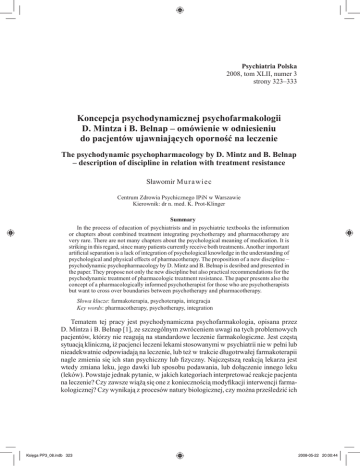 Psychiatria Polska 2008, tom XLII, numer 3 strony 323–333 Koncepcja psychodynamicznej psychofarmakologii D. Mintza i B. Belnap – omówienie w odniesieniu do pacjentów ujawniających oporność na leczenie The psychodynamic psychopharmacology by D. Mintz and B. Belnap – description of discipline in relation with treatment resistance Sławomir M u r a w i e c Centrum Zdrowia Psychicznego IPiN w Warszawie Kierownik: dr n. med. K. Prot-Klinger Summary In the process of education of psychiatrists and in psychiatric textbooks the information or chapters about combined treatment integrating psychotherapy and pharmacotherapy are very rare. There are not many chapters about the psychological meaning of medication. It is striking in this regard, since many patients currently receive both treatments. Another important artificial separation is a lack of integration of psychological knowledge in the understanding of psychological and physical effects of pharmacotherapy. The proposition of a new discipline – psychodynamic psychopharmacology by D. Mintz and B. Belnap is desribed and presented in the paper. They propose not only the new discipline but also practical recommendations for the psychodynamic treatment of pharmacologic treatment resistance. The paper presents also the concept of a pharmacologically informed psychotherapist for those who are psychotherapists but want to cross over boundaries between psychotherapy and pharmacotherapy. Słowa klucze: farmakoterapia, psychoterapia, integracja Key words: pharmacotherapy, psychotherapy, integration Tematem tej pracy jest psychodynamiczna psychofarmakologia, opisana przez D. Mintza i B. Belnap [1], ze szczególnym zwróceniem uwagi na tych problemowych pacjentów, którzy nie reagują na standardowe leczenie farmakologiczne. Jest częstą sytuacją kliniczną, iż pacjenci leczeni lekami stosowanymi w psychiatrii nie w pełni lub nieadekwatnie odpowiadają na leczenie, lub też w trakcie długotrwałej farmakoterapii nagle zmienia się ich stan psychiczny lub fizyczny. Najczęstszą reakcją lekarza jest wtedy zmiana leku, jego dawki lub sposobu podawania, lub dołączenie innego leku (leków). Powstaje jednak pytanie, w jakich kategoriach interpretować reakcje pacjenta na leczenie? Czy zawsze wiążą się one z koniecznością modyfikacji interwencji farmakologicznej? Czy wynikają z procesów natury biologicznej, czy można prześledzić ich Księga PP3_08.indb 323 2008-05-22 20:00:44 324 Sławomir Murawiec psychologiczne, społeczne i życiowe uwarunkowania?. Wydaje się, że proponowana przez Mintza i Belnap psychodynamiczna psychofarmakologia może być skutecznym narzędziem pozwalającym na poznawcze podejście do tych zagadnień. G. O. Gabbard i J. Kay [2] piszą o zanikaniu czy też zamieraniu biopsychologicznego modelu psychiatry. Uważają, że najbardziej dramatyczną ilustracją tej tendencji jest zmniejszanie się nacisku na integrację farmakoterapii i psychoterapii w codziennej praktyce klinicznej. Przytaczają dane, z których wynika, że 55% pacjentów jest leczonych jednocześnie psychoterapeutycznie i farmakologicznie (dane te pochodzą z USA i nie muszą się pokrywać z polskimi). Zauważają jednak, że podręczniki psychiatrii rzadko zawierają rozdziały na temat łączonego leczenia tymi dwiema metodami, co oczywiście nie oznacza, że takie prace nie powstawały. Autorem znaczących opracowań w tej dziedzinie jest Gabbard [3, 4]. Ponadto farmakoterapia i psychiatria psychospołeczna są oddzielnymi przedmiotami nauczania. W związku z tym, jak może następować integracja obu tych dziedzin, skoro są one przedstawione jako dwie odrębne modalności leczenia – pytają cytowani autorzy [2]. Zwracają uwagę, że jeszcze do lat 70. XX wieku uważano psychoterapię i farmakoterapię za wykluczające się wzajemnie (w Polsce takie opinie można słyszeć do dziś, na szczęście coraz rzadziej). Bardziej współczesne badania wskazują, że jednoczesne leczenie obiema metodami jest najbardziej skuteczne. Przykładowo, w schizofrenii stosowanie opartej na psychoedukacji terapii rodzinnej i leczenia przeciwpsychotycznego zdecydowanie zmniejsza liczbę nawrotów choroby, w porównaniu ze stosowaniem każdej z tych metod oddzielnie [2]. Gabbard i Kay odnoszą się także do kolejnej fundamentalnej kwestii, która bywa przedmiotem licznych kontrowersji. Czy oba rodzaje oddziaływań powinny być prowadzone przez różne osoby? Ich zdaniem promuje to kartezjański dualizm i umowny podział pacjenta na „umysł”, leczony przez psychoterapeutę, i „mózg”, leczony przez psychiatrę. Natomiast prowadzenie obu sposobów leczenia przez jedną osobę bardziej sprzyja akceptacji integracji umysłu i mózgu – zarówno przez psychiatrę, jak i przez pacjenta. Model leczenia przez jednego psychiatrę obiema modalnościami wymaga, aby potrafił on myśleć o tym samym pacjencie zarówno kategoriami dysfunkcji mózgu (z obiektywnego punktu widzenia), jak i kategoriami empatii skierowanej ku cierpiącej istocie ludzkiej. Ten dwutorowy sposób odnoszenia się (bimodal relatedness) bywa porównywany do myślenia fizyków, którzy muszą jednocześnie myśleć kategoriami fal i cząsteczek o tych samych zjawiskach [2, 5]. Psychodynamiczna psychofarmakologia David Mintz i Barri Belnap [1] proponują stosowanie psychodynamicznej psychofarmakologii. Psychodynamiczna psychofarmakologia jest dyscypliną, która uznaje ważność i rolę znaczeń i czynników interpersonalnych w leczeniu farmakologicznym. Nie jest ona w konflikcie z tradycyjną obiektywno-opisową farmakologią. Raczej ma na względzie wzbogacenie biologicznych ram farmakologii o odniesienia psychodynamiczne i ich wzajemne uzupełnianie się. Prowadzi to do pełniejszego rozumienia pacjenta i zwiększenia skuteczności leczenia. Księga PP3_08.indb 324 2008-05-22 20:00:44 Koncepcja psychodynamicznej psychofarmakologii 325 Tradycyjne podejście, oparte na rozpoznawa