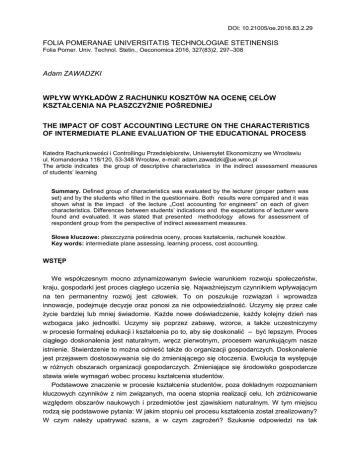 DOI: 10.21005/oe.2016.83.2.29 FOLIA POMERANAE UNIVERSITATIS TECHNOLOGIAE STETINENSIS Folia Pomer. Univ. Technol. Stetin., Oeconomica 2016, 327(83)2, 297–308 Adam ZAWADZKI WPŁYW WYKŁADÓW Z RACHUNKU KOSZTÓW NA OCENĘ CELÓW KSZTAŁCENIA NA PŁASZCZYŹNIE POŚREDNIEJ THE IMPACT OF COST ACCOUNTING LECTURE ON THE CHARACTERISTICS OF INTERMEDIATE PLANE EVALUATION OF THE EDUCATIONAL PROCESS Katedra Rachunkowości i Controllingu Przedsiębiorstw, Uniwersytet Ekonomiczny we Wrocławiu ul. Komandorska 118/120, 53-348 Wrocław, e-mail: [email protected] The article indicates the group of descriptive characteristics in the indirect assessment measures of students’ learning Summary. Defined group of characteristics was evaluated by the lecturer (proper pattern was set) and by the students who filled in the questionnaire. Both results were compared and it was shown what is the impact of the lecture „Cost accounting for engineers” on each of given characteristics. Differences between students’ indications and the expectations of lecturer were found and evaluated. It was stated that presented methodology allows for assessment of respondent group from the perspective of indirect assessment measures. Słowa kluczowe: płaszczyzna pośrednia oceny, proces kształcenia, rachunek kosztów. Key words: intermediate plane assessing, learning process, cost accounting. WSTĘP We współczesnym mocno zdynamizowanym świecie warunkiem rozwoju społeczeństw, kraju, gospodarki jest proces ciągłego uczenia się. Najważniejszym czynnikiem wpływającym na ten permanentny rozwój jest człowiek. To on poszukuje rozwiązań i wprowadza innowacje, podejmuje decyzje oraz ponosi za nie odpowiedzialność. Uczymy się przez całe życie bardziej lub mniej świadomie. Każde nowe doświadczenie, każdy kolejny dzień nas wzbogaca jako jednostki. Uczymy się poprzez zabawę, wzorce, a także uczestniczymy w procesie formalnej edukacji i kształcenia po to, aby się doskonalić – być lepszym. Proces ciągłego doskonalenia jest naturalnym, wręcz pierwotnym, procesem warunkującym nasze istnienie. Stwierdzenie to można odnieść także do organizacji gospodarczych. Doskonalenie jest przejawem dostosowywania się do zmieniającego się otoczenia. Ewolucja ta występuje w różnych obszarach organizacji gospodarczych. Zmieniające się środowisko gospodarcze stawia wiele wymagań wobec procesu kształcenia studentów. Podstawowe znaczenie w procesie kształcenia studentów, poza dokładnym rozpoznaniem kluczowych czynników z nim związanych, ma ocena stopnia realizacji celu. Ich zróżnicowanie względem obszarów naukowych i przedmiotów jest zjawiskiem naturalnym. W tym miejscu rodzą się podstawowe pytania: W jakim stopniu cel procesu kształcenia został zrealizowany? W czym należy upatrywać szans, a w czym zagrożeń? Szukanie odpowiedzi na tak 298 A. Zawadzki postawione pytania wymaga przeprowadzenia szczegółowej analizy, którą można przeprowadzić w odniesieniu do konkretnego przedmiotu. W związku z tym rozważania w tym artykule będą poświęcone przedmiotowi rachunek kosztów dla inżynierów. Celem artykułu jest identyfikacja cech opisowych procesu kształcenia w ramach tego przedmiotu – czy różnią się one w ocenach kształconych i oczekiwaniach kształcących (standardach wyznaczonych przez prowadzącego). Cel ten został zrealizowany za pomocą metod badawczych, z wykorzystaniem badań ankietowych. PRZEDMIOT BADAŃ Rachunek kosztów zorientowany jest na zaspokajanie potrzeb informacyjnych wynikających albo ze sprawozdawczości zewnętrznej (z systematycznego rachunku kosztów), albo z konieczności rozwiązania problemu (z problemowych rachunków kosztów). W przypadku, gdy odbiorcami tych informacji są użytkownicy zewnętrzni zasady, reguły funkcjonowania rachunku kosztów określają odpowiednie akty normatywne. Natomiast w przypadku, gdy odbiorcami informacji kosztowych są użytkownicy wewnętrzni, głównymi determinantami, poza wspomnianymi regulacjami prawnymi, funkcjonowania rachunku kosztów są zależności przyczynowo-skutkowe oraz logika i ekonomika podejmowanych działań (zob. więcej: Jarugowa i in. 1990; Drury 1996; Sołtys 2014). Warto zauważyć, że w tym drugim przypadku duże znaczenie będzie odgrywać też kreatywność w poszukiwaniu rozwiązania oraz jego wariantowość. Proces kształcenia w ramach przedmiotu rachunek kosztów dla inżynierów realizowany jest w formie wykładów i ćwiczeń audytoryjnych, podczas których przedstawiane są informacje oraz realizowane ćwiczenia pozwalające na osiągnięcie określonego poziomu wiedzy, zdobycie odpowiednich umiejętności i kompetencji. Zakłada się, że każda z przywołanych form zajęć ma się przyczynić do realizacji procesu kształcenia. Ocena procesu kształcenia może przebiegać na: − płaszczyźnie bezpośredniej (merytorycznej), − płaszczyźnie pośredniej. Ocena procesu kształcenia oparta na płaszczyźnie merytorycznej jest stosunkowo prosta; polega na weryfikacji zdobytej wiedzy, nabytych kompetencji i umiejętności. Jest ona najczęściej przeprowadzana podczas wykładu w postaci egzaminu, a na ćwiczeniach audytoryjnych na podstawie kolokwium, aktywności oraz indywidulanych odpowiedzi studenta. Gorzej jest w przypadku płaszczyzny pośredniej. Płaszczyzna pośrednia, jak już sama nazwa wskazuje, nie oddziałuje bezpośrednio na zdobytą wiedzę, nabyte umiejętności i kompetencję, ale mimo to w istotnym stopniu przyczynia się do osiągnięcia przez studenta efektów kształcenia. W odróżnieniu od oceny na płaszczyźnie bezpośredniej płaszczyzna pośrednia nie ocenia merytorycznych efektów kształcenia, tylko wskazuje przyczyny braku tych efektów (zob. więcej: Why is direct evidence of student learning required?, https://manoa.hawaii.edu/ /assessment/howto/methods.htm). Z uwagi na obszerność zagadnienia oraz materiału badawczego rozważania zostaną ogranic