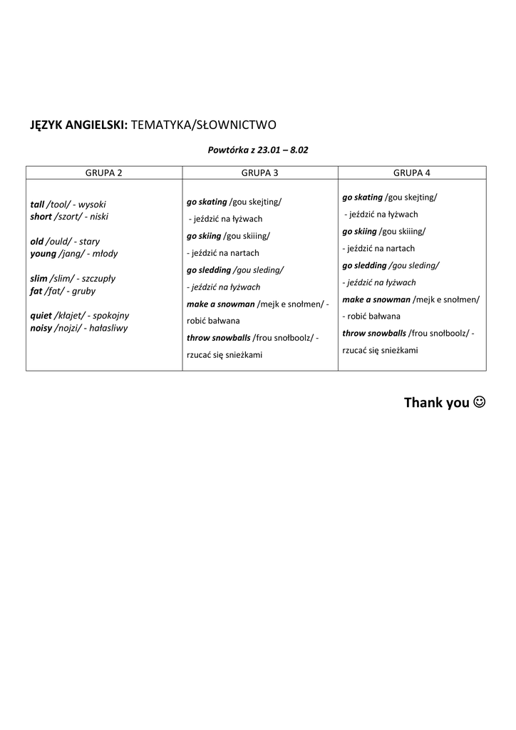 JĘZYK ANGIELSKI: TEMATYKA/SŁOWNICTWO Powtórka z 23.01 – 8.02 GRUPA 2 tall /tool/ - wysoki short /szort/ - niski old /ould/ - stary young /jang/ - młody slim /slim/ - szczupły fat /fat/ - gruby quiet /kłajet/ - spokojny noisy /nojzi/ - hałasliwy GRUPA 3 GRUPA 4 go skating /gou skejting/ go skating /gou skejting/ - jeździć na łyżwach - jeździć na łyżwach go skiing /gou skiiing/ - jeździć na nartach go sledding /gou sleding/ - jeździć na łyżwach go skiing /gou skiiing/ - jeździć na nartach go sledding /gou sleding/ - jeździć na łyżwach make a snowman /mejk e snołmen/ - make a snowman /mejk e snołmen/ robić bałwana - robić bałwana throw snowballs /frou snołboolz/ - throw snowballs /frou snołboolz/ - rzucać się snieżkami rzucać się snieżkami Thank you ☺