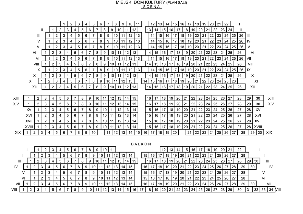 MIEJSKI DOM KULTURY (PLAN SALI) -SCENA- I II 1 1 2 2 3 3 4 4 5 5 6 6 7 7 8 8 9 9 10 11 10 11 12 12 13 14 15 16 17 18 19 20 21 22 13 14 15 16 17 18 19 20 21 22 23 24 I II III 1 2 3 4 5 6 7 8 9 10 11 12 13 14 15 16 17 18 19 20 21 22 23 24 25 26 III IV 1 2 3 4 5 6 7 8 9 10 11 12 13 14 15 16 17 18 19 20 21 22 23 24 25 26 IV V 1 2 3 4 5 6 7 8 9 10 11 12 13 14 15 16 17 18 19 20 21 22 23 24 25 26 V VI 1 VII 2 1 VIII 1 IX 2 1 XI 2 1 X 1 XII 3 3 3 2 2 2 4 4 4 3 3 3 5 5 5 4 4 4 6 6 6 5 5 5 7 7 6 8 7 9 8 8 10 11 12 13 9 8 7 7 9 8 7 6 6 8 10 11 12 13 9 9 9 10 11 12 13 10 11 12 13 10 11 12 13 10 11 12 13 9 14 15 16 17 18 19 20 21 22 23 24 25 26 VI 14 15 16 17 18 19 20 21 22 23 24 25 26 VII 14 15 16 17 18 19 20 21 22 23 24 25 26 14 15 16 17 18 19 20 21 22 23 24 25 26 14 15 16 17 18 19 20 21 22 23 24 25 VIII IX 26 X 14 15 16 17 18 19 20 21 22 23 24 25 26 XI 1 2 3 4 5 6 7 8 10 11 12 13 14 15 16 17 18 19 20 21 22 23 24 25 26 XII XIII 1 2 3 4 5 6 7 8 9 10 11 12 13 14 15 16 17 18 19 20 21 22 23 24 25 26 27 28 29 30 XIII XIV 1 2 3 4 5 6 7 8 9 10 11 12 13 14 15 16 17 18 19 20 21 22 23 24 25 26 27 28 29 30 XIV XV 1 2 3 4 5 6 7 8 9 10 11 12 13 14 15 16 17 18 19 20 21 22 23 24 25 26 27 28 XV XVI 1 2 3 4 5 6 7 8 9 10 11 12 13 14 15 16 17 18 19 20 21 22 23 24 25 26 27 28 XVI XVII 1 2 3 4 5 6 7 8 9 10 11 12 13 14 15 16 17 18 19 20 21 22 23 24 25 26 27 28 XVII XVIII 1 2 3 4 5 6 7 8 9 10 11 12 13 14 15 16 17 18 19 20 21 22 23 24 25 26 27 28 XVIII XIX 1 2 3 4 5 6 7 8 9 10 11 12 13 14 15 16 17 18 19 20 21 22 23 24 25 26 27 28 29 30 XIX BALKON I 1 II 1 III 1 IV 1 2 3 3 3 4 4 4 5 5 5 6 6 6 7 7 7 8 8 8 9 9 9 10 11 12 13 14 15 16 17 18 19 20 21 10 11 12 13 14 15 16 17 18 19 20 21 22 23 24 25 26 27 10 11 12 13 14 15 16 17 18 19 20 21 22 23 24 25 26 27 22 I 28 28 II 29 30 III 2 3 4 5 6 7 8 9 10 11 12 13 14 15 16 17 18 19 20 21 22 23 24 25 26 27 28 29 V 1 2 3 4 5 6 7 8 9 10 11 12 13 14 15 16 17 18 19 20 21 22 23 24 25 26 27 28 V VI 1 2 3 4 5 6 7 8 9 10 11 12 13 14 15 16 17 18 19 20 21 22 23 24 25 26 27 28 VI 2 3 4 5 6 7 8 9 10 11 12 13 14 15 16 17 18 19 20 21 22 23 24 25 26 27 28 29 VII VIII 2 2 1 1 2 3 4 5 6 7 8 9 10 11 12 13 14 15 16 17 18 19 20 21 22 23 24 25 26 27 28 29 30 30 30 IV VII 31 32 33 34 VIII