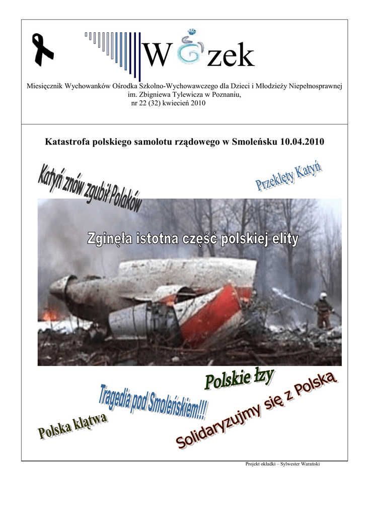 W zek Miesięcznik Wychowanków Ośrodka Szkolno-Wychowawczego dla Dzieci i Młodzieży Niepełnosprawnej im. Zbigniewa Tylewicza w Poznaniu, nr 22 (32) kwiecień 2010 Katastrofa polskiego samolotu rządowego w Smoleńsku 10.04.2010 Projekt okładki – Sylwester Warański SMOLEŃSK 10.04.2010r. Dnia 10.04.2010 roku o godzinie 8:56 doszło do najtragiczniejszego w skutkach wypadku Polskiego samolotu Tu 154. Wydarzyło się to w Smoleńsku 1,5 kilometra od płyty lotniska, na której miała wylądować maszyna. Najważniejsze osoby państwa Polskiego zmierzały na obchody 70 rocznicy zbrodni katyńskiej. Na pokładzie znajdowali się między innymi: prezydent Lech Kaczyński, jego żona Maria Kaczyńska, Ryszard Kaczorowski i wielu innych zasłużonych dla Polski generałów, księży, polityków. Wszystkie osoby, które leciały na uroczystości - z ginęły. Bronisław Komorowski, który pełni obowiązki prezydenta RP, ogłosił tygodniową żałobę narodową. Pogrzeb Lecha i Marii Kaczyńskich odbył się w niedzielę 18.04.2010 roku. Para prezydencka została pochowana na Krakowskim Wawelu. Z powodu tak tragicznej katastrofy w naszej szkole odbył się uroczysty apel. Uczniowie uczcili pamięć osób poległych w dwiema minutami ciszy. Tomasz Wojewoda i Wojciech Niemyt Ostatni dzień życia W ostatnim dniu życie, gdy słońce zajdzie już na zawsze, a ja wchodzić będę w noc śmierci, chcę powiedzieć: Wszystko jest dobre. Wszystko jest w porządku. Nie jestem martwy. Idę jedynie na drugi brzeg. Życie się zmienia. Ono będzie pełniejsze, intensywniejsze, nieograniczone. Nie będzie już więcej ciemności i smutku. Tylko powiew boskiego życia, przez który zostanę łagodnie wchłonięty. Wszystko będzie światłem. Wszystko będzie miłością. Ziemia nie jest w stanie niczego mi uczynić. W Bogu spełnią się wszelkie marzenia. Mogę być tylko wdzięczny. Moje szczęście jest pełne. Żyję. Jestem spokojny, ponieważ znajduję się w ramionach nieskończonego miłującego Boga. Phil Bosmans 1. Kaczyński Lech, Prezydent RP Lech Kaczyński urodził się 18 czerwca 1949 roku w Warszawie. Był synem Jadwigi z domu Jasiewicz i Rajmunda Kaczyńskiego oraz bratem bliźniakiem Jarosława Kaczyńskiego, prezesa Prawa i Sprawiedliwości. Przez wiele lat pełnił ważne funkcje państwowe, by w końcu niespełna pięć lat temu objąć tę najważniejszą - prezydenta Polski. Wcześniej Lech Kaczyński służył krajowi jako aktywny działacz opozycji. 2. Kaczyńska Maria, Małżonka Prezydenta RP Maria Kaczyńska urodziła się w Machowie, według mediów - w 1943 r.; była córką Lidii i Czesława Mackiewiczów. Jej matka była nauczycielką, a ojciec leśniczym. Rodzina przybyła na teren dzisiejszej Polski z Wilna. Ojciec walczył w wileńskiej partyzantce, jeden z jego braci w szeregach Korpusu gen. Andersa pod Monte Cassino. Drugi brat zginął w Katyniu. 3. Kaczorowski Ryszard, były Prezydent RP na uchodźstwie Ryszard Kaczorowski urodził się 26 listopada 1919 roku w Białymstoku w rodzinie szlacheckiej pieczętującej się herbem Jelita. Jako 14-latek wstąpił do harcerstwa, gdzie należał do drużyn Andrzeja Małkowskiego, jednego z twórców polskiego skautingu. 4. Agacka-Indecka Joanna, Przewodniczący Naczelnej Rady Adwokackiej 5. Bąkowska Ewa, wnuczka Gen. bryg. Mieczysława Smorawińskiego 6. Błasik Andrzej, Dowódca Sił Powietrznych RP 7. Bochenek Krystyna, wicemarszałek Senatu RP 8. Borowska Anna Maria, przedstawiciel Rodzin Katyńskich i innych organizacji 9. Borowski Bartosz, przedstawiciel Rodzin Katyńskich i innych organizacji 10. Buk Tadeusz, Dowódca Wojsk Lądowych RP 11. Chodakowski Miron, Prawosławny Ordynariusz Wojska Polskiego 12. Cywiński Czesław, Przewodniczący Światowego Związku Żołnierzy AK 13. Deptuła Leszek, przedstawiciel Parlamentu RP (PSL) 14. Dębski Zbigniew, członek Kapituły Orderu Wojennego Virtutti Militari 15. Dolniak Grzegorz, przedstawiciel Parlamentu RP (PO) 16. Doraczyńska Katarzyna, biuro prasowe Kancelarii Prezydenta 17. Duchnowski Edward, Sekretarz Generalny Związku Sybiraków 18. Fedorowicz Aleksander, tłumacz prezydenta RP 19. Fetlińska Janina, senator RP 20. Florczak Jarosław, funkcjonariusz BOR 21. Francuz Artur, funkcjonariusz BOR 22. Gągor Franciszek, Szef Sztabu Generalnego Wojska Polskiego 23. Gęsicka Grażyna, przedstawiciel Parlamentu RP (PIS) 24. Gilarski Kazimierz, Dowódca Garnizonu Warszawa 25. Gosiewski Przemysław, przedstawiciel Parlamentu RP (poseł PiS) 26. Gostomski Bronisław, ks. prałat 27. Handzlik Mariusz, Podsekretarz Stanu w Kancelarii Prezydenta RP 28. Indrzejczyk Roman, Kapelan Prezydenta RP 29. Janeczek Paweł, funkcjonariusz BOR 30. Jankowski Dariusz, Biuro Obsługi Kancelarii Prezydenta RP 31. Jaruga-Nowacka Izabela, przedstawiciel Parlamentu RP (SLD) 32. Joniec Józef, Prezes Stowarzyszenia Parafiada 33. Karpiniuk Sebastian, przedstawiciel Parlamentu RP (PO) 34. Karweta Andrzej, Dowódca Marynarki Wojennej RP 35. Kazana Mariusz, Dyrektor Protokołu Dyplomatycznego MSZ 36. Kochanowski Janusz, Rzecznik Praw Obywatelskich 37. Komornicki Stanisław, Przedstawiciel Kapituły Orderu Virtutti Militari 38. Komorowski Stanisław Jerzy, Podsekretarz Stanu w MON 39. Krajewski Paweł, funkcjonariusz BOR 40. Kremer Andrzej, Podsekretarz Stanu w Ministerstwie Spraw Zagranicznych 41. Król Zdzisław, Kapelan Warszawskiej Rodziny Katyńskiej 1987-2007 42. Krupski Janusz, Kierownik Urzędu do Spraw Kombatantów i Osób Represjonowanych 43. Kurtyka Janusz, Prezes Instytutu Pamięci Narodowej 44. Kwaśnik Andrzej, Kapelan Federacji Rodzin Katyńskich 45. Kwiatkowski Bronisław, Dowódca Operacyjny Sił Zbrojnych RP 46. Lubiński Wojciech, lekarz prezydenta RP 47. Lutoborski Tadeusz, przedstawiciel Rodzin Katyńskich i innych organizacji 48. Mamińska Barbara, Dyrektor w Kancelarii Prezydenta RP 49. Mamontowicz-Łojek Zenona, przedstawiciel Rodzin Katyńskich i innych organizacji 50. Mel