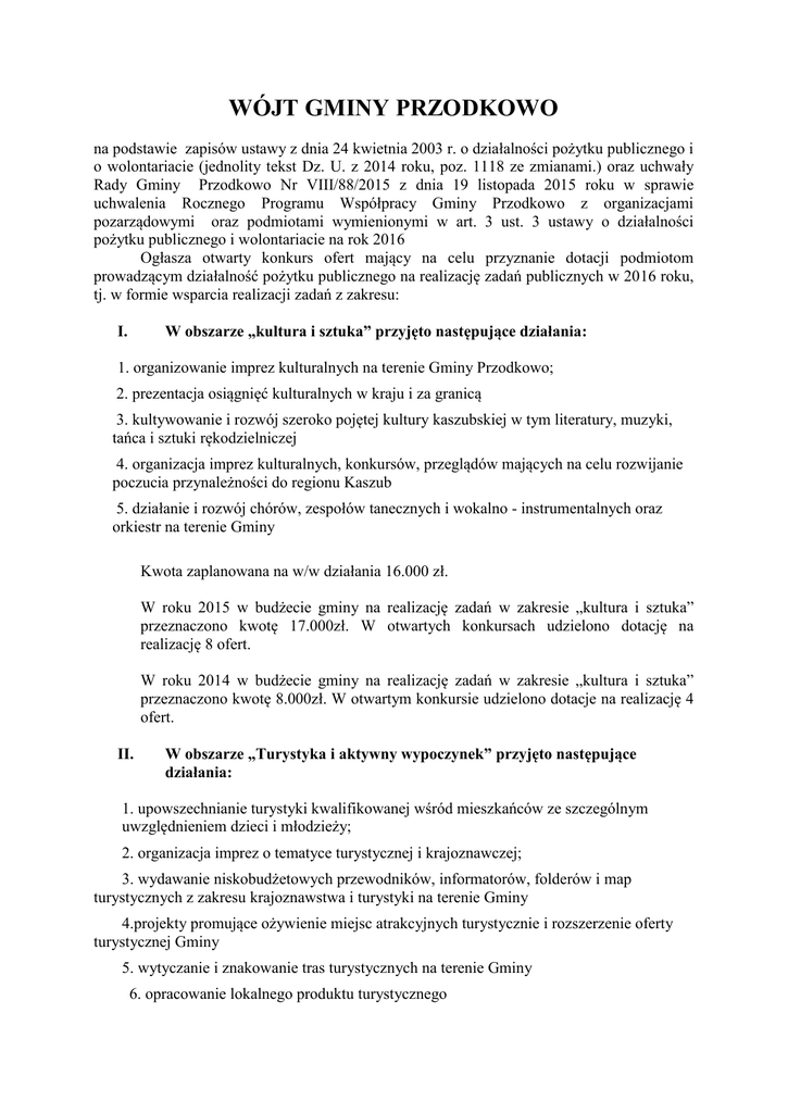 WÓJT GMINY PRZODKOWO na podstawie zapisów ustawy z dnia 24 kwietnia 2003 r. o działalności pożytku publicznego i o wolontariacie (jednolity tekst Dz. U. z 2014 roku, poz. 1118 ze zmianami.) oraz uchwały Rady Gminy Przodkowo Nr VIII/88/2015 z dnia 19 listopada 2015 roku w sprawie uchwalenia Rocznego Programu Współpracy Gminy Przodkowo z organizacjami pozarządowymi oraz podmiotami wymienionymi w art. 3 ust. 3 ustawy o działalności pożytku publicznego i wolontariacie na rok 2016 Ogłasza otwarty konkurs ofert mający na celu przyznanie dotacji podmiotom prowadzącym działalność pożytku publicznego na realizację zadań publicznych w 2016 roku, tj. w formie wsparcia realizacji zadań z zakresu: W obszarze „kultura i sztuka” przyjęto następujące działania: I. 1. organizowanie imprez kulturalnych na terenie Gminy Przodkowo; 2. prezentacja osiągnięć kulturalnych w kraju i za granicą 3. kultywowanie i rozwój szeroko pojętej kultury kaszubskiej w tym literatury, muzyki, tańca i sztuki rękodzielniczej 4. organizacja imprez kulturalnych, konkursów, przeglądów mających na celu rozwijanie poczucia przynależności do regionu Kaszub 5. działanie i rozwój chórów, zespołów tanecznych i wokalno - instrumentalnych oraz orkiestr na terenie Gminy Kwota zaplanowana na w/w działania 16.000 zł. W roku 2015 w budżecie gminy na realizację zadań w zakresie „kultura i sztuka” przeznaczono kwotę 17.000zł. W otwartych konkursach udzielono dotację na realizację 8 ofert. W roku 2014 w budżecie gminy na realizację zadań w zakresie „kultura i sztuka” przeznaczono kwotę 8.000zł. W otwartym konkursie udzielono dotacje na realizację 4 ofert. II. W obszarze „Turystyka i aktywny wypoczynek” przyjęto następujące działania: 1. upowszechnianie turystyki kwalifikowanej wśród mieszkańców ze szczególnym uwzględnieniem dzieci i młodzieży; 2. organizacja imprez o tematyce turystycznej i krajoznawczej; 3. wydawanie niskobudżetowych przewodników, informatorów, folderów i map turystycznych z zakresu krajoznawstwa i turystyki na terenie Gminy 4.projekty promujące ożywienie miejsc atrakcyjnych turystycznie i rozszerzenie oferty turystycznej Gminy 5. wytyczanie i znakowanie tras turystycznych na terenie Gminy 6. opracowanie lokalnego produktu turystycznego Kwota zaplanowana na w/w działanie: 16.000 zł. W roku 2015 w budżecie gminy na realizację zadań w zakresie „turystyka i aktywny wypoczynek” przeznaczono kwotę 16.000zł. W otwartych konkursach udzielono dotację na realizację 8 ofert. W roku 2014 w budżecie gminy na realizację zadań w zakresie „turystyka i aktywny wypoczynek” przeznaczono kwotę 8.000zł. W otwartym konkursie udzielono dotacje na realizację 5 ofert. III. „Kultura fizyczna, sport i rekreacja”, w którym przyjęto następujące działania priorytetowe: 1. upowszechnianie kultury fizycznej , sportu i rekreacji, realizowane przez organizowanie imprez rekreacyjnych i sportowych o zasięgu lokalnym i ponadlokalnym, w tym dla osób niepełnosprawnych; 2. wypoczynek dzieci i młodzieży w tym organizowanie aktywnych form wypoczynku dla dzieci i młodzieży podczas ferii szkolnych i w czasie wolnym od zajęć; 3. szkolenie i współzawodnictwo sportowe dzieci i młodzieży, 4. szkolenie i współzawodnictwo sportowe osób niepełnosprawnych Kwota zaplanowana na w/w działanie: 16.000 zł. W roku 2015 w budżecie gminy na realizację zadań w zakresie „kultura fizyczna, sport i rekreacja” przeznaczono kwotę 17.000zł. W otwartym konkursie udzielono dotacje na realizację 9 ofert. W roku 2014 w budżecie gminy na realizację zadań w zakresie „kultura fizyczna, sport i rekreacja” przeznaczono kwotę 8.000zł. W otwartym konkursie udzielono dotacje na realizację 5 ofert. Miejsce i termin składania ofert: Urząd Gminy Przodkowo, ul. Kartuska 21 do dnia 12.02.2016 r. do godz. 14.30 Osoba upoważniona do kontaktów z wnioskodawcami: Katarzyna Markowska tel. 685 14 25, e-mail: [email protected] Termin rozpatrzenia ofert nastąpi nie później niż do dnia 11.03.2016 r. Termin realizacji zadań od dnia podpisania umowy do dnia 25.11.2016 r. Zasady przyznawania dotacji: 1. Złożona oferta musi być zgodna ze wzorem określonym w rozporządzeniu Ministra Gospodarki, Pracy i Polityki Społecznej z dnia 15 grudnia 2010 r. w sprawie wzoru oferty realizacji zadania publicznego i wzoru sprawozdania z wykonania tego zadania (Dz. U. z 2011 Nr 6, poz. 25). 2. Ofertę należy złożyć w zamkniętej kopercie. Na wniosku oferty winna być informacja jakiego zadania oferta dotyczy (podać obszar także numer); 3. Do oferty należy dołączyć oświadczenie o nie prowadzeniu działalności gospodarczej w rozumieniu art. 9 ustawy o działalności pożytku publicznego i o wolontariacie; 4. Do oferty należy również dołączyć: aktualny wyciąg z Krajowego Rejestru Sądowego lub innego rejestru oraz potwierdzoną kopię statutu; 5. Oferty niekompletne i nieprawidłowo wypełnione albo złożone po terminie oraz oferty, których wartość planowanej dotacji z budżetu Gminy, będzie wynosiła powyżej 90% nie będą rozpatrywane. W przypadku nadesłania oferty pocztą, liczy się data jej wpływu do Urzędu Gminy w Przodkowie; 6. Złożenie oferty nie jest równoznaczne z przyznaniem dotacji; 7. Organizacja, która składa kilka ofert w konkursie – składa każdą ofertę oddzielnie; 8. Organizacje, które pozyskały partnerów do realizacji przedłożonego projektu zobowiązane są dołączyć 1 kopię porozumienia partnerskiego; 9. Poszczególnym podmiotom możne być przyznana więcej niż jedna dotacja. Wysokość przyznanej dotacji może być niższa, niż wnioskowana w ofercie. W takim przypadku wnioskodawca może przyjąć zmniejszenie kosztorysu lub wycofać swoją ofertę; 10. Ostateczną decyzję o przyznaniu dotacji po zapoznaniu się z opinią Komisji Konkursowej podejmuje Wójt Gminy. Informacja o przyznaniu dotacji 