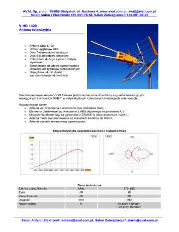 AVAL Sp. z o.o., 15-868 Białystok, ul. Kozłowa 4, www.aval.com.pl, [email protected] Salon Anten i Elektroniki +85-651-76-56, Salon Zabezpieczeń +85-651-49-99 V-HD 1490 Antena telewizyjna • • • • • • • Antena typu YAGI Odbiór sygnałów UHF Dwa 7-elementowe direktory Dwa 5-elementowe reflektory Połączenie dużego zysku z małymi wymiarami Ekranowana obudowa symetryzatora izolująca od sygnałów niepożądanych Najwyższa jakość dzięki zautomatyzowanej produkcji Szerokopasmowa antena V-HD Televes jest przeznaczona do odbiory sygnałów telewizyjnych analogowych i cyfrowych DVB-T w indywidualnych i zbiorowych instalacjach antenowych. Najważniejsze zalety: • Antena jest wykonana z aluminium (bez dodatków stali). • Elementy plastykowe są wykonane z ABS odpornego na promienie UV. • Mocowania elementów są wykonane z ZAMAK ’u (stop aluminium i cynku). • Antena może być montowana na masztach średnicy do 80mm. • Antena posiada ekranowany symetryzator. Charakterystyka częstotliwościowa i kierunkowość Zakres częstotliwości Zysk Kierunkowość Długość Napór wiatru Dane techniczne MHz dB dB mm N 470-862 15 22 890 93 przy 130km/h 128 przy 150km/h Salon Anten i Elektroniki [email protected], Salon Zabezpieczeń [email protected]