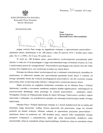 I Warszawa, 2 września 2013 roku RZECZPOSPOLITA POLSKA Rzecznik Praw Dziecka Marek Michalak ZSS!500!29/20 1 3JMW Pani Irena Lipowicz Rzecznik Praw Obywatelskich fl H JI L L) pragnę zwrócić Pani uwagę na zagadnienie związane z uprawnieniami pracowników — opiekunów dzieci, określonymi w art. 188 ustawy z dnia 26 czerwca 1974 r. Kodeks pracy (tekst jedn.: Dz. U. z 1998 r,, Nr 21 poz. 94 z późn. zm.). W myśl art. 188 Kodeksu pracy „pracownikowi wychowującemu przynajnmiej jedno dziecko w wieku do 14 lat przysługuje w ciągu roku kalendarzowego zwolnienie od pracy na 2 dni, z zachowaniem prawa do wynagrodzenia”. Pracownikowi przysługują więc jedynie dwa dni wolne od pracy bez względu na to, czy wychowuje on jedno czy więcej dzieci. Kierując się dobrem dzieci wychowujących się w rodzinach wielodzietnych, doszedłem do przekonania, że całkowicie zasadne jest wprowadzenie przedziału liczby dzieci w rodzinie, od którego zależałaby liczba dni wolnych przysługuj ących pracownikowi, tak aby rozróżnić sytuację pracownika, który wychowuje jedno dziecko, i takiego który wychowuje pięcioro dzieci. Mając powyższe na względzie dwukrotnie zwracałem się do Ministra Pracy i Polityki Społecznej, z prośbą o rozważenie zasadności podjęcia działań legislacyjnych, zmierzających do przystosowania aktuaLnego stanu prawnego do potrzeb pracowników — opiekunów dzieci. Wystąpiłem również do Pełnomocnika Rządu do Spraw Równego Traktowania z prośbą o zajęcie stanowiska i wskazanie, czy przedmiotowe przepisy nie naruszają konstytucyjnej zasady równego traktowania. Minister Pracy i Polityki Społecznej wskazał, że z dwóch dodatkowych dni na opiekę nad dzieckiem mogą skorzystać, według wyboru pracownik lub pracownica, mogą oni również podzielić się dniami wolnymi. Minister wskazał, że uprawnienie przyznane pracownikom — opiekunom dzieci na podstawie art. 188 Kodeksu pracy, stanowi tylko uzupełnienie szeregu przepisów związanych z rodzicielstwem, takich jak: urlop macierzyński, dodatkowy urlop macierzyński, urlop na warunkach urlopu macierzyńskiego, dodatkowy urlop na warunkach urlopu macierzyńskiego, przerwy w pracy na karmienie piersią, szeregu norm ochronnych dla pracowników w obszarze czasu pracy i organizacji procesu pracy, oraz przepisów umożliwiających elastyczne dostosowanie systemu pracy do potrzeb pracownika — opiekuna dziecka lub dzieci. Zwrócono także uwagę na skutki finansowe, jakie rodziłoby wprowadzenie proponowanej zmiany dla pracodawców, są to bowiem dni wolne z zachowaniem prawa do wynagrodzenia wypłacanego przez pracodawcę. Pełnomocnik Rządu do Spraw Równego Traktowania wskazała, że dla celów określenia, czy nie została naruszona zasada równego traktowania, a także zasada sprawiedliwości społecznej w kontekście art. 71 ust 1 Konstytucji, zasadne będzie zbadanie zagadnienie konstytucyjności przepisu przez Trybunał Konstytucyjny. Problem zgodności art. 188 Kodeksu pracy z konstytucyjną zasadą równości wobec prawa dostrzegł również, w skierowanym do mnie 4 kwietnia 2013 r. liście Prezes Naczelnej Rady Adwokackiej. Zwrócił on uwagę, że przepis w swoim obecnym brzmieniu dyskryminuje dzieci z rodzin wielodzietnych. W związku z powyższym, na podstawie art. 9 pkt 2a ustawy z 15 lipca 1987 r. o Rzeczniku Praw Obywatelskich (tekstjedn.: Dz.U z 2001 r., Nr 14, poz. 147 z późn. zm.), zwracam się do Pani Rzecznik z prośbą o rozważenie możliwości złożenia do Trybunału Konstytucyjnego wniosku o stwierdzenie niezgodności w art. 188 ustawy z dnia 26 czerwca 1974 r. Kodeks pracy (tekst jedn.: Dz. U. z 1998 r., Nr 21 poz. 94 z późn. zm.) z Konstytucją Rzeczypospolitej Polskiej w części wskazującej na przyznanie dwóch dni na opiekę nad dzieckiem bez względu na to, czy w rodzinie wychowuje się jedno czy więcej dzieci. j) „kJk) (7( ty (J W załączeniu: Wystąpienie generalne do Ministra Pracy i Polityki Społecznej Władysława Kosiniaka-Kamysza z 29 kwietnia 2013 r. Odpowiedź z 6 czerwca 2013 r. udzielona na wystąpienie generalne Rzecznika Praw Dziecka do Ministra Pracy i Polityki Społecznej. Wystąpienie do Pełnomocnika Rządu do Spraw Równego Traktowania Agnieszki Kozłowskiej Rajewicz z 30 lipca 2013 r. Odpowiedź na wystąpienie skierowane do Pełnomocnika Rządu do Spraw Równego Traktowania z 10 września 2013 r. Pismo skierowane do Rzecznika Praw Dziecka przez Prezesa Naczelnej Rady Adwokackiej Andrzeja Zwarę 4 kwietnia 2013 r. - - - - - 9 / Warszawa, RZECZPOSPOLITA POLSKA Rzecznik Praw Obywatelskich . y9ł(2 ż (-„ A. Irena LIPOWICZ RPO-749835-IlI/13/LN OO-090 Warszawa Al. Solidarności 77 Tel. centr. 22 551 77 OO Fax 22 827 64 53 Pan 1\”larek Michalak Rzecznik Praw Dziecka 5y W odpowiei na wniosek Pana Rzecznika, złożony na podstawie art. 9 pkt 2a ustawy z dnia 15 lipca 1987 r. o Rzeczniku Praw Obywatelskich (Dz. U. z 2001 r. Nr 14, poz. 147 ze zm.), uprzejmie wyjaśniam, co następuje. Wniosek dotyczy stwierdzenia niekonstytucyjności art. 188 ustawy z dnia Kodeks pracy (Dz. U. z 1998 r. Nr 21, poz. 94 ze zm.). 26 czerwca 1974 r. Z nadesłanej dokumentacji, dotyczącej korespondencji z Ministrem Pracy i Polityki Społecznej i Pełnomocnikiem Rządu do Spraw Równego Traktowania oraz wystąpienia Prezesa Naczelnej Rady Adwokackiej wynika, że zarzuty niekonstytucyjności art. 188 k.p. mogą dotyczyć naruszenia zasady równości wobec prawa oraz zakazu dyskryminacji jednostki oraz zasady sprawiedliwości społecznej w związku z art. 71 ust. 1 Konstytucji. — W związku z powyższym uprzejmie informuję, że podjęte zostały w moim Biurze prace nad zbadaniem możliwości skutecznego zakwestionowania konstytucyjności art. 188 Kodeksu pracy. W szczególności przeprowadzona zostanie analiza możliwości stwierdzenia naruszenia przez ten przepis zasady równości i sprawiedliwości społecznej w związku z prawem rodzin wielodzietnych do szc