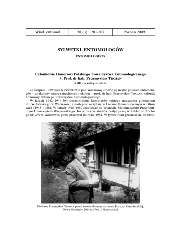Wiad. entomol. 28 (3): 201-207 Poznań 2009 SYLWETKI ENTOMOLOGÓW ENTOMOLOGISTS Członkowie Honorowi Polskiego Towarzystwa Entomologicznego 4. Prof. dr hab. Przemysław TROJAN w 80. rocznicę urodzin 22 sierpnia 1929 roku w Pruszkowie pod Warszawą urodził się nestor polskich entomologów – znakomity znawca muchówek i ekolog – prof. dr hab. Przemysław T ROJAN, członek honorowy Polskiego Towarzystwa Entomologicznego. W latach 1942–1944 był uczestnikiem kompletów tajnego nauczania gimnazjum im. W. Górskiego w Warszawie, a następnie uczył się w Liceum Humanistycznym w Gliwicach (1945–1948). W latach 1948–1952 studiował na Wydziale Matematyczno-Przyrodniczym Uniwersytetu Warszawskiego. Już w trakcie studiów podjął pracę w Zakładzie Zoologii SGGW w Warszawie, gdzie pracował do roku 1954. W tymże roku przenosi się do Insty- Profesor Przemysław TROJAN przed swoim domem na skraju Puszczy Kampinoskiej, Nowe Grochale 2004 r. [Fot. J. BANASZAK] 202 SYLWETKI ENTOMOLOGÓW tutu Zoologii PAN w Warszawie, gdzie pracuje do roku 1958, organizując i pełniąc funkcję kierownika Pracowni Dipterologicznej. Jednocześnie podejmuje studia doktoranckie na Wydziale Biologii UW, rozpoczynając badania nad muchówkami Polski. Doktorat z zakresu nauk biologicznych broni na Wydziale Biologii UW w roku 1958 na podstawie rozprawy pt. „Nisze ekologiczne ślepaków w Puszczy Kampinoskiej”. Prace naukową kontynuuje w szeregu kolejnych placówek badawczych. Po doktoracie pracuje na stanowisku adiunkta w Instytucie Ekologii PAN w Warszawie, pełniąc funkcję kierownika Stacji w Dziekanowie Leśnym. Miejsce pracy i sąsiedztwo Puszczy Kampinoskiej sprzyja podjęciu badań nad ekologią populacji zwierząt. Koniec lat 50. i początek 60. XX wieku to początek świetności Instytutu Ekologii PAN i powstawanie Polskiej Szkoły Ekologicznej, pod kierunkiem znakomitych nauczycieli – profesorów Kazimierza PETRUSEWICZA i Kazimierza TARWIDA, z której wyszło całe pokolenie polskich ekologów, m. in. rówieśników profesora TROJANA, żeby wymienić profesorów: Romana ANDRZEJEWSKIEGO, Alicję BREYMEYER, Gabrielę BUJALSKĄ-GRÜM, Elizę D ĄBROWSKĄ-PROT, Joannę GLIWICZ, Leszka GRÜMA, Zdzisława KAJAKA i wielu innych. Habilituje się w roku 1963 na Wydziale Biologii UW w oparciu o rozprawę „Koncepcja gatunku w rodzaju Tabanus L. W świetle praktyki taksonomicznej”, tytuł profesora nadzwyczajnego uzyskuje w roku 1971, a profesora zwyczajnego w roku 1982. W latach 1963–1968 zostaje kierownikiem Zakładu Agroekologii PAN w Turwi, w dawnym woj. Leszczyńskim (obecnie Stacja Badawcza Instytutu Badań środowiska Rolniczego i Leśnego PAN). W tym czasie kieruje badaniami nad ochroną środowiska pól uprawnych, produkcją ekologiczną oraz redukcją naturalną szkodników w agrocenozach. Kolejne wyzwanie w pracy organizacyjnej i dydaktycznej podejmuje w roku 1972, organizując Wydział Biologii oraz studia ekologiczne oraz studia z zakresu ochrony środowiska na Uniwersytecie Śląskim w Katowicach. W latach 1972–1981 pełni funkcję zastępcy dyrektora ds. naukowych w Instytucie Zoologii PAN w Warszawie, aktywnie uczestnicząc w nowych programach badawczych, tj. jako organizator badań nad regulacją liczebności szkodników w agrocenozach i jako organizator programu badań nad zwierzętami z zakresu ekologii miasta. W tym bardzo aktywnym okresie życia profesor Trojan pełni odpowiedzialne i absorbujące funkcje członka Państwowej Rady Ochrony Przyrody, Państwowej Rady Ochrony Środowiska i Rady Ekologicznej przy MON. Równocześnie w latach 1973–1976 pracuje na etacie profesora w Wyższej Szkole Rolniczo-Pedagogicznej w Siedlcach, a w latach 1976–1982 pełni funkcję zastępcy Sekretarza Wydziału Nauk Biologicznych PAN. W latach 1982–1988 profesor Trojan przechodzi ponownie do pracy w Instytucie Ekologii PAN w Dziekanowie Leśnym, tym razem obejmując funkcję dyrektora tej wielce zasłużonej dla nauki polskiej placówki. Koordynuje badaniami ekologicznymi w Polsce, czemu sprzyja przewodniczenie Komitetowi Ekologii PAN. Prace badawcze prowadzi również poza granicami kraju: w latach 1982–1999 był stypendystą Museum für Naturkunde Uniwersytetu im. A. Humboldta w Berlinie i Musem National d’Historie Naturelle w Paryżu, gdzie prowadził badania nad systematyką i ewolucją muchówek pijących krew. W roku 1991 kolejny raz wraca do pracy w Instytucie Zoologii PAN w Warszawie, gdzie na stanowisku kierownika Pracowni Faunistyki pracuje do roku 1999. W tym czasie prowadzi badania nad różnorodnością struktury i sukcesją ekologiczną fauny. Ukazują się liczne prace z zakresu systematyki i ewolucji Tabanidae. Dodajmy, że w okresie 1991–1999 jest równocześnie wykładowcą na Studium Doktoranckim Wydziału Leśnego SGGW w Warszawie. Od roku 2000 profesor emerytowany w Muzeum i Instytucie Zoologii PAN w Warszawie. CZŁONKOWIE HONOROWI PTEnt. 4. PROF. DR HAB. PRZEMYSŁAW TROJAN 203 Profesor Przemysław TROJAN jest autorem 255 publikacji, w tym kilku książek, żeby w tym miejscu wymienić chociażby pierwszy polski podręcznik akademicki „Ekologia ogólna”, którego cztery wydania ukazały się w latach 70. Wydał 15 pozycji z serii „Klucze do oznaczania owadów Polski” i „Fauna Polski”, nieocenione dla badaczy Diptera. Działalność Profesora obejmowała dotychczas trzy główne grupy zagadnień, tj. systematykę i zoogeografię Diptera, faunistykę i ekologię. Przedstawmy krótko główne osiągnięcia profesora. W grupie zagadnień dotyczących s y s t e m a t y k i i z o o g e o g r a f i i d w u s k r z y d ł y c h były to badania nad muchówkami Polski, które objęły rewizje taksonomiczne i opracowania monograficzne muchówek występujących w faunie Polski, opublikowane w „Kluczach do oznaczania owadów Polski” i w „Faunie Polski”, łącznie 17 monografii. Analiza zmian koncepcji gatunku biologicznego w systematyce owadów na p