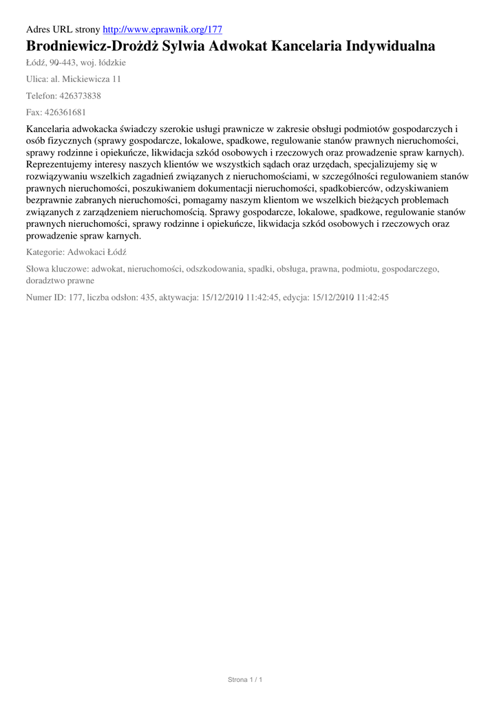 Adres URL strony http://www.eprawnik.org/177 Brodniewicz-Drożdż Sylwia Adwokat Kancelaria Indywidualna Łódź, 90-443, woj. łódzkie Ulica: al. Mickiewicza 11 Telefon: 426373838 Fax: 426361681 Kancelaria adwokacka świadczy szerokie usługi prawnicze w zakresie obsługi podmiotów gospodarczych i osób fizycznych (sprawy gospodarcze, lokalowe, spadkowe, regulowanie stanów prawnych nieruchomości, sprawy rodzinne i opiekuńcze, likwidacja szkód osobowych i rzeczowych oraz prowadzenie spraw karnych). Reprezentujemy interesy naszych klientów we wszystkich sądach oraz urzędach, specjalizujemy się w rozwiązywaniu wszelkich zagadnień związanych z nieruchomościami, w szczególności regulowaniem stanów prawnych nieruchomości, poszukiwaniem dokumentacji nieruchomości, spadkobierców, odzyskiwaniem bezprawnie zabranych nieruchomości, pomagamy naszym klientom we wszelkich bieżących problemach związanych z zarządzeniem nieruchomością. Sprawy gospodarcze, lokalowe, spadkowe, regulowanie stanów prawnych nieruchomości, sprawy rodzinne i opiekuńcze, likwidacja szkód osobowych i rzeczowych oraz prowadzenie spraw karnych. Kategorie: Adwokaci Łódź Słowa kluczowe: adwokat, nieruchomości, odszkodowania, spadki, obsługa, prawna, podmiotu, gospodarczego, doradztwo prawne Numer ID: 177, liczba odsłon: 435, aktywacja: 15/12/2010 11:42:45, edycja: 15/12/2010 11:42:45 Strona 1 / 1