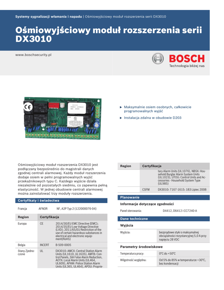 Systemy sygnalizacji włamania i napadu | Ośmiowyjściowy moduł rozszerzenia serii DX3010 Ośmiowyjściowy moduł rozszerzenia serii DX3010 www.boschsecurity.pl Ośmiowyjściowy moduł rozszerzenia DX3010 jest podłączany bezpośrednio do magistrali danych zgodnej centrali alarmowej. Każdy moduł rozszerzenia dodaje osiem w pełni programowalnych wyjść przekaźnikowych typu C. Każdego wyjście działa niezależnie od pozostałych siedmiu, co zapewnia pełną elastyczność. W jednej obudowie centrali alarmowej można zainstalować trzy moduły rozszerzenia. Certyfikaty i świadectwa Francja AFNOR NF, A2P Typ 2 (122000076-04) Region Certyfikacja Europa CE 2014/30/EU EMC Directive (EMC); 2014/35/EU Low-Voltage Directive (LVD); 2011/65/EU Restriction of the use of certain hazardous substances in electrical and electronic equipment(RoHS) Belgia INCERT B-509-0005 Stany Zjednoczone UL DX3010: AMCX: Central Station Alarm Units (UL1610, UL1635), AMTB: Control Panels, SIA False Alarm Reduction, AOTX: Local Alarm Units (UL464, UL609), APAW: Police Station Alarm Units (UL365, UL464), APOU: Proprie- u Maksymalnie osiem osobnych, całkowicie programowalnych wyjść u Instalacja zdalna w obudowie D203 Region Certyfikacja tary Alarm Units (UL1076), NBSX: Household Burglar Alarm System Units (UL1023), UTOU: Control Units and Accessories - Household System Type (UL985) CSFM DX3010: 7167-1615: 183 Lipiec 2008 Planowanie Informacje dotyczące zgodności Panel sterowania: D4412, D6412 i CC7240-A Dane techniczne Wyjścia Wyjścia: bezprądowe styki o maksymalnej obciążalności rezystancyjnej 5,0 A przy napięciu 28 VDC Parametry środowiskowe Temperatura pracy: 0°C do +50°C Wilgotność względna: Od 5% do 85% w temperaturze +30°C, bez kondensacji 2 | Ośmiowyjściowy moduł rozszerzenia serii DX3010 Linia Grubość kabla terminalu: 1,8 mm (AWG 14) do 0,8 mm (AWG 22) Zasilanie Pobór prądu (maks.): 10 mA, + 40 mA na każdy zasilany przekaźnik Napięcie robocze: 8 do 14 VDC Reprezentowana przez: Poland Robert Bosch Sp. z o.o. Jutrzenki 105 str. 02-231 Warszawa Phone: +48 22 715 4101 Fax: +48 22 715 4105 [email protected] www.boschsecurity.pl © Robert Bosch Sp. z o.o./ Security Systems 2014 | Zastrzega się możliwość wprowadzania zmian 2543634699 | pl, V3, 24. Lip 2014
