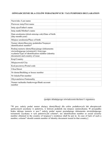 OŚWIADCZENIE DLA CELÓW PODATKOWYCH / TAX PURPOSES DECLARATION Nazwisko /Last name Pierwsze imię/First name Imię ojca/Father's name Imię matki/Mother's name Data urodzenia (dzień-miesiąc-rok)/Date of birth (day-month-year) Miejsce urodzenia/Place of birth Numer identyfikacyjny podatnika/Taxpayer identification number* Rodzaj numeru identyfikacyjnego (dokumentu stwierdzającego tożsamość) i kraj jego wydania/Type of identification number (identity document) and country of issue Kraj/Country Miejscowość/City Kod pocztowy/Postal code Ulica/Street Nr domu/Building or house number Nr lokalu/Flat number Obywatelstwo/Nationality Numer rachunku bankowego/Bank account number ____________________________________________ (podpis składającego oświadczenie/declarer’s signature) *W poz. należy podać numer służący identyfikacji dla celów podatkowych lub ubezpieczeń społecznych uzyskany w państwie, w którym podatnik ma miejsce zamieszkania. W przypadku braku takiego numeru w poz.* należy podać numer posiadanego dokumentu stwierdzającego tożsamość uzyskany w tym państwie.[In column*, tax identification number or social security number obtained in the country of taxpayer’s residence shall be put in. In case of lack of such a number, column* should contain number of identity document issued in that country.]