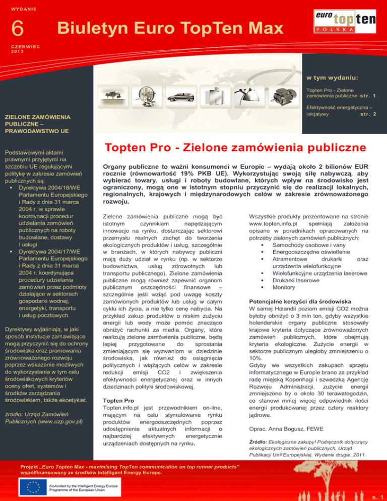 WY D AN I E 6 Biuletyn Euro TopTen Max CZER WI EC 2013 w tym wydaniu: Topten Pro - Zielone zamówienia publiczne s t r . 1 Efektywność energetyczna – inicjatywy str . 2 ZIELONE ZAMÓWIENIA PUBLICZNE – PRAWODAWSTWO UE Podstawowymi aktami prawnymi przyjętymi na szczeblu UE regulującymi politykę w zakresie zamówień publicznych są: Dyrektywa 2004/18/WE Parlamentu Europejskiego i Rady z dnia 31 marca 2004 r. w sprawie koordynacji procedur udzielania zamówień publicznych na roboty budowlane, dostawy i usługi Dyrektywa 2004/17/WE Parlamentu Europejskiego i Rady z dnia 31 marca 2004 r. koordynująca procedury udzielania zamówień przez podmioty działające w sektorach gospodarki wodnej, energetyki, transportu i usług pocztowych. Dyrektywy wyjaśniają, w jaki sposób instytucje zamawiające mogą przyczynić się do ochrony środowiska oraz promowania zrównoważonego rozwoju poprzez wskazanie możliwych do wykorzystania w tym celu środowiskowych kryteriów oceny ofert, systemów i środków zarządzania środowiskiem, także ekoetykiet. źródło: Urząd Zamówień Publicznych (www.uzp.gov.pl) Topten Pro - Zielone zamówienia publiczne Organy publiczne to ważni konsumenci w Europie – wydają około 2 bilionów EUR rocznie (równowartość 19% PKB UE). Wykorzystując swoją siłę nabywczą, aby wybierać towary, usługi i roboty budowlane, których wpływ na środowisko jest ograniczony, mogą one w istotnym stopniu przyczynić się do realizacji lokalnych, regionalnych, krajowych i międzynarodowych celów w zakresie zrównoważonego rozwoju. Zielone zamówienia publiczne mogą być istotnym czynnikiem napędzającym innowacje na rynku, dostarczając sektorowi przemysłu realnych zachęt do tworzenia ekologicznych produktów i usług, szczególnie w branżach, w których nabywcy publiczni mają duży udział w rynku (np. w sektorze budownictwa, usług zdrowotnych lub transportu publicznego). Zielone zamówienia publiczne mogą również zapewnić organom publicznym oszczędności finansowe – szczególnie jeśli wziąć pod uwagę koszty zamówionych produktów lub usług w całym cyklu ich życia, a nie tylko cenę nabycia. Na przykład zakup produktów o niskim zużyciu energii lub wody może pomóc znacząco obniżyć rachunki za media. Organy, które realizują zielone zamówienia publiczne, będą lepiej przygotowane do sprostania zmieniającym się wyzwaniom w dziedzinie środowiska, jak również do osiągnięcia politycznych i wiążących celów w zakresie redukcji emisji CO2 i zwiększenia efektywności energetycznej oraz w innych dziedzinach polityki środowiskowej. Topten Pro Topten.info.pl jest przewodnikiem on-line, mającym na celu stymulowanie rynku produktów energooszczędnych poprzez udostępnienie aktualnych informacji o najbardziej efektywnych energetycznie urządzeniach dostępnych na rynku. Wszystkie produkty prezentowane na stronie www.topten.info.pl spełniają założenia opisane w poradnikach opracowanych na potrzeby zielonych zamówień publicznych: Samochody osobowe i vany Energooszczędne oświetlenie Atramentowe drukarki oraz urządzenia wielofunkcyjne Wielofunkcyjne urządzenia laserowe Drukarki laserowe Monitory Potencjalne korzyści dla środowiska W samej Holandii poziom emisji CO2 można byłoby obniżyć o 3 mln ton, gdyby wszystkie holenderskie organy publiczne stosowały krajowe kryteria dotyczące zrównoważonych zamówień publicznych, które obejmują kryteria ekologiczne. Zużycie energii w sektorze publicznym uległoby zmniejszeniu o 10%. Gdyby we wszystkich zakupach sprzętu informatycznego w Europie brano za przykład radę miejską Kopenhagi i szwedzką Agencję Rozwoju Administracji, zużycie energii zmniejszono by o około 30 terawatogodzin, co stanowi mniej więcej odpowiednik ilości energii produkowanej przez cztery reaktory jądrowe. Oprac. Anna Bogusz, FEWE Źródło: Ekologiczne zakupy! Podręcznik dotyczący ekologicznych zamówień publicznych, Urząd Publikacji Unii Europejskiej, Wydanie drugie, 2011. Projekt „Euro Topten Max - maximising TopTen communication on top runner products” współfinansowany ze środków Intelligent Energy Europe. s. 1 DRUGI KRAJOWY PLAN DZIAŁAŃ DOTYCZĄCY EFEKTYWNOŚCI ENERGETYCZNEJ Drugi Krajowy Plan Działań dotyczący efektywności energetycznej został przygotowany w związku z obowiązkiem przekazywania Komisji Europejskiej sprawozdań na podstawie dyrektywy 2006/32/WE w sprawie efektywności końcowego wykorzystania energii i usług energetycznych. Dokument ten zawiera opis planowanych środków poprawy efektywności energetycznej ukierunkowanych na końcowe wykorzystanie energii w poszczególnych sektorach gospodarki. Krajowy Plan Działań przedstawia również informację o postępie w realizacji krajowego celu w zakresie oszczędnego gospodarowania energią i podjętych działaniach mających na celu usuniecie przeszkód w realizacji tego celu. Cel ten wyznacza uzyskanie do 2016 roku oszczędności energii finalnej, w ilości nie mniejszej niż 9% średniego krajowego zużycia tej energii w ciągu roku (tj. 53452 GWh oszczędności energii do 2016 roku). Drugi Krajowy Plan Działań dotyczący efektywności energetycznej został przyjęty przez Radę Ministrów w dniu 17 kwietnia 2012 r. źródło: Ministerstwo Gospodarki (www.mg.gov.pl) WYDAWCA: Fundacja na rzecz Efektywnego Wykorzystania Energii ul. Rymera 3/4; 40-048 Katowice tel./fax.+48 32 203 51 14 e-mail: [email protected] Kierownik projektu: Anna Bogusz e-mail: [email protected] www.topten.info.pl Efektywność energetyczna – inicjatywy Fundacja na rzecz Efektywnego Wykorzystania Energii realizuje projekty podobne do Topten Max, których celem jest zwiększenie efektywności energetycznej, a tym samym zaoszczędzenie energii oraz pieniędzy. Są one finansowane ze środków Intelligent Energy-Europe. Projekt Efficiency 2.1. jest realizowany we współpracy z 12 partnerami reprezentującymi 10 europejskich kra