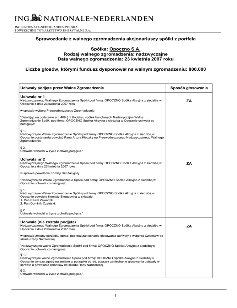 ING NATIONALE-NEDERLANDEN POLSKA POWSZECHNE TOWARZYSTWO EMERYTALNE S.A. Sprawozdanie z walnego zgromadzenia akcjonariuszy spółki z portfela Spółka: Opoczno S.A. Rodzaj walnego zgromadzenia: nadzwyczajne Data walnego zgromadzenia: 23 kwietnia 2007 roku Liczba głosów, którymi fundusz dysponował na walnym zgromadzeniu: 800.000 Uchwały podjęte przez Walne Zgromadzenie Sposób głosowania Uchwała nr 1 Nadzwyczajnego Walnego Zgromadzenia Spółki pod firmą: OPOCZNO Spółka Akcyjna z siedzibą w Opocznie z dnia 23 kwietnia 2007 roku ZA w sprawie wyboru Przewodniczącego Zgromadzenia "Działając na podstawie art. 409 § 1 Kodeksu spółek handlowych Nadzwyczajne Walne Zgromadzenie Spółki pod firmą: OPOCZNO Spółka Akcyjna z siedzibą w Opocznie uchwala co następuje: § 1. Nadzwyczajne Walne Zgromadzenie Spółki pod firmą: OPOCZNO Spółka Akcyjna z siedzibą w Opocznie postanawia powołać Pana Artura Kłoczkę na Przewodniczącego Nadzwyczajnego Walnego Zgromadzenia. § 2. Uchwała wchodzi w życie z chwilą podjęcia." Uchwała nr 2 Nadzwyczajnego Walnego Zgromadzenia Spółki pod firmą: OPOCZNO Spółka Akcyjna z siedzibą w Opocznie z dnia 23 kwietnia 2007 roku ZA w sprawie powołania Komisji Skrutacyjnej "Nadzwyczajne Walne Zgromadzenie Spółki pod firmą: OPOCZNO Spółka Akcyjna z siedzibą w Opocznie uchwala co następuje: § 1. Nadzwyczajne Walne Zgromadzenie Spółki pod firmą: OPOCZNO Spółka Akcyjna z siedzibą w Opocznie powołuje Komisję Skrutacyjną w składzie: 1. Pan Paweł Zawadzki, 2. Pan Dominik Czaiński. § 2. Uchwała wchodzi w życie z chwilą podjęcia." Uchwała (nie została podjęta) Nadzwyczajnego Walnego Zgromadzenia Spółki pod firmą: OPOCZNO Spółka Akcyjna z siedzibą w Opocznie z dnia 23 kwietnia 2007 roku w sprawie zmiany porządku obrad, poprzez zaniechanie głosowania uchwały o wyborze Członków do składu Rady Nadzorczej ”Nadzwyczajne walne Zgromadzenie Spółki pod firmą: OPOCZNO Spółka Akcyjna z siedzibą w Opocznie uchwala co następuje: § 1. Nadzwyczajne walne Zgromadzenie Spółki pod firmą: OPOCZNO Spółka Akcyjna z siedzibą w Opocznie wyraża zgodę na zmianę w porządku obrad, poprzez zaniechanie głosowania uchwały w sprawie o powołanie członków do składu Rady Nadzorczej. § 2. Uchwała wchodzi w życie z chwilą podjęcia." 1 ZA ING NATIONALE-NEDERLANDEN POLSKA POWSZECHNE TOWARZYSTWO EMERYTALNE S.A. WSTRZYMANO SIĘ Uchwała nr 3 Nadzwyczajnego Walnego Zgromadzenia Spółki pod firmą: OPOCZNO Spółka Akcyjna z siedzibą w Opocznie z dnia 23 kwietnia 2007 roku w sprawie przyjęcia porządku obrad "Nadzwyczajne Walne Zgromadzenie Spółki pod firmą: OPOCZNO Spółka Akcyjna z siedzibą w Opocznie uchwala co następuje: § 1. Nadzwyczajne Walne Zgromadzenie Spółki pod firmą: OPOCZNO Spółka Akcyjna z siedzibą w Opocznie postanawia przyjąć porządek obrad w następującym brzmieniu: 1. Otwarcie Walnego Zgromadzenia. 2. Wybór Przewodniczącego i Komisji Skrutacyjnej Walnego Zgromadzenia. 3. Stwierdzenie ważności zwołania Walnego Zgromadzenia oraz jego zdolności do podejmowania uchwał. 4. Przyjęcie porządku obrad. 5. Podjęcie uchwały w przedmiocie powołania Członków Rady Nadzorczej w związku z wygaśnięciem z dniem 21 kwietnia 2007 roku wspólnej kadencji dotychczasowego składu Rady Nadzorczej Spółki 6. Podjęcie uchwały w przedmiocie zmian w Statucie Spółki. 7. Podjęcie uchwały w sprawie wyrażenia zgody na wniesienie przez Spółkę aportem do spółki celowej w 100% zależnej od OPOCZNO S.A. zorganizowanej części przedsiębiorstwa, w skład której będzie wchodzić zespół składników materialnych i niematerialnych w rozumieniu art. 55 Kodeksu Cywilnego, przeznaczonych do prowadzenia działalności produkcyjnej. 8. Wolne wnioski. 9. Zamknięcie Walnego Zgromadzenia. § 2. Uchwała wchodzi w życie z chwilą podjęcia." Uchwała (nie została podjęta) Nadzwyczajnego Walnego Zgromadzenia Spółki pod firmą: OPOCZNO Spółka Akcyjna z siedzibą w Opocznie z dnia 23 kwietnia 2007 roku PRZECIW "Nadzwyczajne Walne Zgromadzenie Spółki pod firmą: OPOCZNO Spółka Akcyjna z siedzibą w Opocznie uchwala co następuje: § 1. Zarządza się przerwę w obradach Walnego Zgromadzenia celem zapoznania się z osobą Grzegorza Szamańskiego – kandydata na członka Rady Nadzorczej. § 2. Uchwała wchodzi w życie z chwilą podjęcia." Uchwała (nie została podjęta) Nadzwyczajnego Walnego Zgromadzenia Spółki pod firmą: OPOCZNO Spółka Akcyjna z siedzibą w Opocznie z dnia 23 kwietnia 2007 roku WSTRZYMANO SIĘ w sprawie powołania Grzegorza Szamańskiego do składu Rady Nadzorczej OPOCZNO S.A. Działając na podstawie art. 385 § 1 kodeksu spółek handlowych oraz § 14 ust. 3 Statutu Spółki, Nadzwyczajne Walne Zgromadzenie OPOCZNO S.A. uchwala co następuje: § 1. Powołuje się Grzegorza Szamańskiego do składu Rady Nadzorczej OPOCZNO S.A. § 2. Uchwała wchodzi w życie z chwilą podjęcia." Uchwała (nie została podjęta) Nadzwyczajnego Walnego Zgromadzenia OPOCZNO S.A. z dnia 23 kwietnia 2007 r. w sprawie zmian w Statucie Spółki §1 Nadzwyczajne Walne Zgromadzenie OPOCZNO S.A. z siedzibą w Opocznie, działając na podstawie art. 430 § 1 Kodeksu spółek handlowych uchwala wprowadzenie do Statutu Spółki zmian, w ten sposób, że: 2 PRZECIW ING NATIONALE-NEDERLANDEN POLSKA POWSZECHNE TOWARZYSTWO EMERYTALNE S.A. § 14 ust. 1 Statutu Spółki otrzymuje nowe następujące brzmienie: §1 Nadzwyczajne Walne Zgromadzenie OPOCZNO S.A. z siedzibą w Opocznie, działając na podstawie art. 430 § 1 Kodeksu spółek handlowych postanawia wprowadzić do Statutu Spółki następującą zmianę: zapis § 14 ust. 1 Statutu w dotychczasowym brzmieniu, obowiązującym według stanu przed 19 lutego 2007 r.: Rada Nadzorcza składa się z 5 do 12 członków. Liczbę członków Rady Nadzorczej ustala Walne Zgromadzenie. Tak długo jak Credit Suisse First Boston Ceramic Partners (Polan