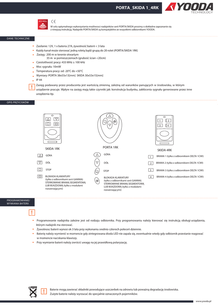 PORTA_SKIDA 1_4RK 433 MHz W celu optymalnego wykorzystania możliwosci nadajników serii PORTA/SKIDA prosimy o dokładne zapoznanie się z ninejszą instrukcją. Nadajniki PORTA/SKIDA są kompatybilne ze wszystkimi odbiornikami YOODA. DANE TECHNICZNE Zasilanie: 12V, 1 x bateria 27A, żywotność baterii < 3 lata Każdy kanał może sterować jedną roletą bądź grupą do 20 rolet (PORTA/SKIDA 1RK) Zasięg : 200 m w terenie otwartym 35 m w pomieszczeniach (grubość ścian <20cm) Czestotliwość pracy: 433 MHz ± 100 kHz Moc sygnału: 10mW Temperatura pracy: od -20°C do +50°C Wymiary: PORTA 38x55x13[mm] SKIDA 30x53x15[mm] IP 44 Zasięg podawany przez producenta jest wartością zmienną, zależną od warunków panujących w środowisku, w którym urządzenie pracuje. Wpływ na zasięg mają takie czynniki jak: konstrukcja budynku, zakłócenia sygnału generowane przez inne urządzenia itp. OPIS PRZYCISKÓW SKIDA 1RK PORTA 1RK GÓRA GÓRA DÓŁ STOP BLOKADA KLAWIATURY (tylko z odbiornikami serii GAMMA) STERROWANIE BRAMĄ SEGMENTOWĄ LUB WJAZDOWĄ (tylko z modułami rozszerzającymi) 1 2 3 4 SKIDA 4RK 1 BRAMA 1 (tylko z odbiornikiem DELTA 1CWI) DÓŁ 2 BRAMA 2 (tylko z odbiornikiem DELTA 1CWI) STOP 3 BRAMA 3 (tylko z odbiornikiem DELTA 1CWI) BLOKADA KLAWIATURY (tylko z odbiornikami serii GAMMA) STERROWANIE BRAMĄ SEGMENTOWĄ LUB WJAZDOWĄ (tylko z modułami rozszerzającymi) 4 BRAMA 4 (tylko z odbiornikiem DELTA 1CWI) PROGRAMOWANIE/ WYMIANA BATERII Programowanie nadajnika zależne jest od rodzaju odbiornika. Przy programowaniu należy kierować się instrukcją obsługi urządzenia, którym nadajnik ma sterować. Żywotnosc baterii wynosi ok 3 lata przy wykonaniu srednio czterech poleceń dziennie. Baterię należy wymienić w momencie gdy zintegrowana dioda LED nie zapala się, ewentualnie wtedy gdy odbiornik przestanie reagować w momencie naciskania klawiszy. Przy wymianie baterii należy zwrócić uwagę na jej prawidłową polaryzację. Baterie mogą zawierać składniki powodujące uszczerbek na zdrowiu lub poważną degradację środowiska. Zużyte baterie należy wyrzucać do specjalnie oznaczonych pojemników. www.yooda.pl