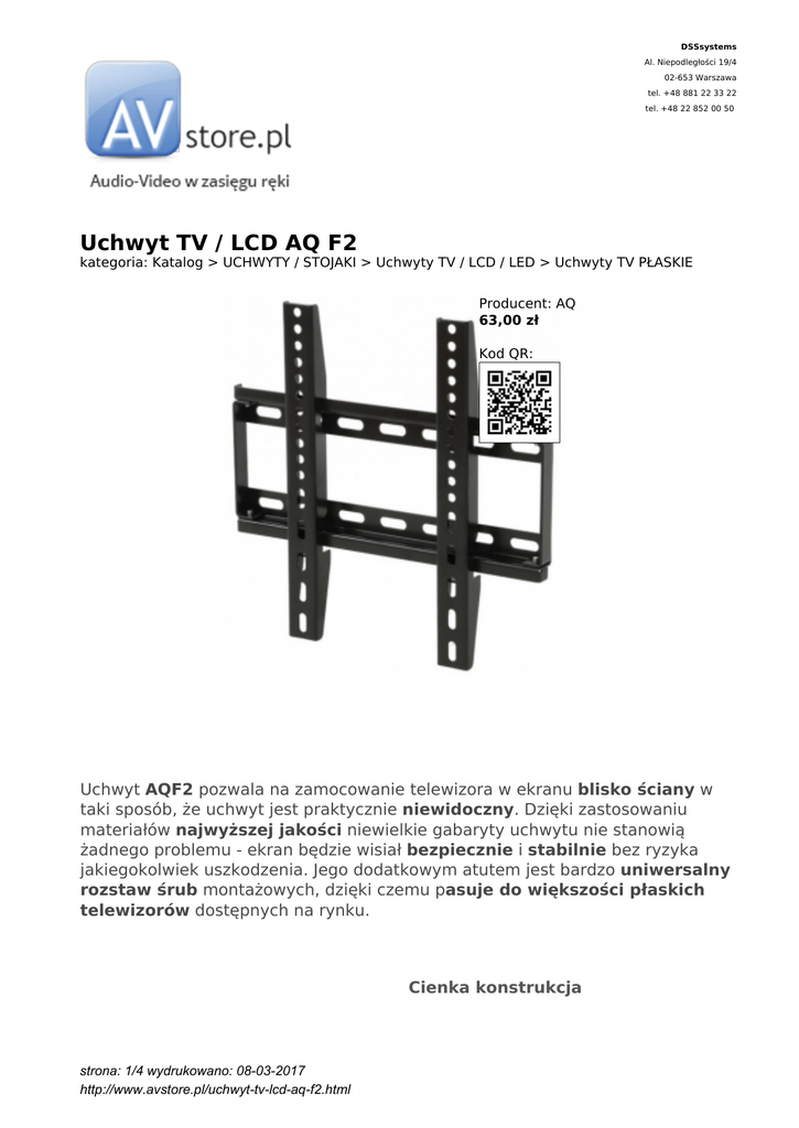 DSSsystems Al. Niepodległości 19/4 02-653 Warszawa tel. +48 881 22 33 22 tel. +48 22 852 00 50 Uchwyt TV / LCD AQ F2 kategoria: Katalog > UCHWYTY / STOJAKI > Uchwyty TV / LCD / LED > Uchwyty TV PŁASKIE Producent: AQ 63,00 zł Kod QR: Uchwyt AQF2 pozwala na zamocowanie telewizora w ekranu blisko ściany w taki sposób, że uchwyt jest praktycznie niewidoczny. Dzięki zastosowaniu materiałów najwyższej jakości niewielkie gabaryty uchwytu nie stanowią żadnego problemu - ekran będzie wisiał bezpiecznie i stabilnie bez ryzyka jakiegokolwiek uszkodzenia. Jego dodatkowym atutem jest bardzo uniwersalny rozstaw śrub montażowych, dzięki czemu pasuje do większości płaskich telewizorów dostępnych na rynku. Cienka konstrukcja strona: 1/4 wydrukowano: 08-03-2017 http://www.avstore.pl/uchwyt-tv-lcd-aq-f2.html Uchwyt AQF2 charakteryzuje się cienką konstrukcją - zaledwie 4cm. Dzięki temu idealnie zamaskuje się za Twoim telewizorem i będzie praktycznie niewidoczny. Pozwoli to na zachowanie pełnej estetyki pomieszczenia w którym będzie wisiał Twój ekran. Mimo tak niewielkich gabarytów uchwyt gwarantuje stabilny i bezpieczny montaż sprzętu, ponieważ został wykonany z najwyższej jakości materiałów z olbrzymią dbałością o najmniejsze detale jego wykonania. strona: 2/4 wydrukowano: 08-03-2017 http://www.avstore.pl/uchwyt-tv-lcd-aq-f2.html strona: 3/4 wydrukowano: 08-03-2017 http://www.avstore.pl/uchwyt-tv-lcd-aq-f2.html Dane techniczne Marka: Acoustique Quality Model: AQF2 Przeznaczony do TV LCD o przekątnej ekranu od 17" do 42" Odległość uchwytu od ściany 4cm Maksymalne obciążenie uchwytu 75kg Mocowanie VESA: 75mm x 75mm, 100mm x 100mm, 100mm x 200mm, 200mm x 200mm, 300mm x 200mm, 300mm x 300mm Uchwyt posiada zabezpieczenie w postaci śrub uniemożliwiających strącenie ekranu Bardzo solidnie i precyzyjnie wykonany W zestawie: Śruby montażowe ekranu oraz śruby zabezpieczające, Kołki rozporowe, Wkręty, Instrukcję obsługi Kolor: czarny strona: 4/4 wydrukowano: 08-03-2017 http://www.avstore.pl/uchwyt-tv-lcd-aq-f2.html