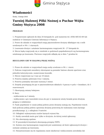 Wiadomości Środa, 3 lutego 2016 Turniej Halowej Piłki Nożnej o Puchar Wójta Gminy Stężyca 2008 PROGRAM 1. Przyjmowanie zgłoszeń do dnia 24 listopada br. pod numerem tel. (058) 685-63-49 lub osobiście w Gminnym Centrum Informacji w Stężycy. 2. Prawo do udziału w rozgrywkach mają pięcioosobowe drużyny składające się z osób urodzonych w 94 r. i starszych. 3. Losowanie drużyn i ustalenie harmonogramu rozgrywek 26 - 27 listopada br. 4. Mecze będą rozgrywały się w niedziele w godzinach popołudniowych wg harmonogramu ustalonego po losowaniu. Pierwsze rozgrywki odbędą się w dniu 7 grudnia br. REGULAMIN GRY W HALOWĄ PIŁKĘ NOŻNĄ 1. Prawo do udziału w rozgrywkach mają osoby urodzone w 94 r. i starsi. 2. Podczas rozgrywek zawodnicy obowiązani są posiadać halowe obuwie sportowe oraz jednolite kolorystycznie, numerowane koszulki. 3. Mecze rozgrywane są 2 razy po 10 minut. 4. Przerwa między połowami trwa 1 minutę. 5. Przerwy pomiędzy meczami wynoszą 5 minut. 6. Zespoły przystępują do gry w pięcioosobowym składach: 4 graczy w polu + bramkarz, do 5 rezerwowych. 7. Obowiązują zmiany hokejowe. 8. Kary: - wykluczenie na 2 minuty, - wykluczenie z gry (zawodnik wraca do gry w momencie utraty bramki przez drużynę grającą w osłabieniu). 9. Faule popełnione w czasie jednej połowy przez drużynę sumują się. Popełnienie trzech fauli podczas jednej połowy uprawnia drużynę przeciwną do wykonania rzutu karnego przedłużanego, tj. z odległości 9 metrów. 10. Odległość wykonywania rzutów karnych wynosi 6m. 11. Każdy zawodnik może grać tylko w drużynie, do której został zgłoszony. 12. Nie obowiązują spalone. 13. W pozostałych kwestiach obowiązują przepisy PZPN. 14. System oraz harmonogram rozgrywek jest uzależniony od ilości zgłoszonych drużyn i zostanie ustalony po losowaniu. 15. Niezastosowanie się do regulaminu może skutkować wykluczeniem zawodnika lub drużyny z gry. UZUPEŁNIENIE DO REGULAMINU ROZGRYWEK - z grupy wychodzą 2 najlepsze drużyny, - punktacja przebiega w następujący sposób: wygrana 3 pkt, remis 1 pkt, przegrana 0 pkt, - w przypadku jednakowej ilości punktów decyduje różnica bramek strzelonych i straconych, - w przypadku jednakowej różnicy bramek 2 drużyn decyduje wynik bezpośredniego spotkania, - w przypadku remisowego wyniku spotkania bezpośredniego lub jednakowej różnicy bramek więcej niż 2 drużyn decydują rzuty karne (5 rzutów karnych, w przypadku remisu do uzyskania przewagi). - drużyna musi być gotowa do gry na 5 minut przed planowanym wg. terminarza rozpoczęciem meczu. Niestawienie się spowoduje walkower z wynikiem 3:0. UWAGA!!! 1. Drużyny, które zgłoszą się udziału w turnieju są zobowiązane do bieżącego monitorowania harmonogramu rozgrywek we własnym zakresie, począwszy od 27 listopada i zaznajamiania się z terminami własnych meczy. Harmonogram będzie zamieszczony na stronie głównej www.gminastezyca.pl (dział Aktualności 2008). 2. Organizatorzy zastrzegają sobie prawo do zmiany regulaminu oraz harmonogramu rozgrywek. 3. Za zagubione lub pozostawione rzeczy osobiste podczas turnieju organizator nie ponosi odpowiedzialności. PODZIAŁ NA GRUPY W wyniku komisyjnego losowania w składzie - Bogusław Darsznik - Sekretarz Gminy Stężyca, - Ewa Borzestowska - pracownik UG - Łukasz Wolny - pracownik UG dokonano podziału zgłoszonych drużyn na następujące grupy: Grupa A - gra w Klukowej Hucie 1. Gościniec Orzeł Gołubie 2. UKS Kaszub 3. Stężycka Huta 4. KS Klukowa Huta 5. Amigos Grupa B - gra w Klukowej Hucie 1. DDD Klukowa Huta 2. Gimnazjum Klukowa Huta 3. Wicher Czaple 4. 69 Team 5. Gołubie Stowarzyszenie SERCE KASZUB Grupa C - gra w Kamienicy Szlacheckiej 1. Dream Team 2. Pasteam 3. Szmacianka 4. Borucino 5. Orliki Grupa D - gra w Kamienicy Szlacheckiej 1. Bajer Zgorzałe 2. FC Kamienica 3. Sprite 4. Gladiator Potuły 5. KS Sulmin Mecze będą rozgrywać się na dwóch halach sportowych: grupy A i B grają w Klukowej Hucie, grupy C i D w Kamienicy Szlacheckiej. Rozgrywki będą odbywały się nie od 30 listopada, lecz w dniach 7 i 14 grudnia na obu halach oraz finał w dniu 28 grudnia br. w Klukowej Hucie. TERMINARZ ROZGRYWEK FAZY GRUPOWEJ Dla grup A i B w Klukowej Hucie dnia 07.12.2008 r. 1. Gościniec Orzeł Gołubie - UKS Kaszub - 14:00 2. Stężycka Huta - KS Klukowa Huta - 14:25 3. Gościniec Orzeł Gołubie - Amigos - 14:50 4. UKS Kaszub - Stężycka Huta - 15:15 5. KS Klukowa Huta - Amigos - 15:40 6. DDD Klukowa Huta - Gimnazjum Klukowa Huta - 16:05 7. Wicher Czaple - 69 Team - 16:30 8. DDD Klukowa Huta - Gołubie Stowarzyszenie SERCE KASZUB - 16:55 9. Gimnazjum Klukowa Huta - Wicher Czaple - 17:20 10. 69 Team - Gołubie Stowarzyszenie SERCE KASZUB - 17:45 dnia 14.12.2008 r. 1. Gimnazjum Klukowa Huta - Gołubie Stowarzyszenie SERCE KASZUB - 14:00 2. DDD Klukowa Huta - Wicher Czaple - 14:25 3. Gimnazjum Klukowa Huta - 69 Team - 14:50 4. Wicher Czaple - Gołubie Stowarzyszenie SERCE KASZUB - 15:15 5. DDD Klukowa Huta - 69 Team - 15:40 6. UKS Kaszub - Amigos - 16:05 7. Gościniec Orzeł Gołubie - Stężycka Huta - 16:30 8. UKS Kaszub - KS Klukowa Huta - 16:55 9. Stężycka Huta - Amigos - 17:20 10. Gościniec Orzeł Gołubie - KS Klukowa Huta - 17:45 Dla grup C i D w Kamienicy Szlacheckiej dnia 07.12.2008 r. 1. Dream Team - Pasteam - 14:00 2. Szmacianka - Borucino - 14.25 3. Dream Team - Orliki - 14:50 4. Pasteam - Szmacianka - 15:15 5. Borucino - Orliki - 15:40 6. Bajer Zgorzałe - FC Kamienica - 16:05 7. Sprite - Gladiator Potuły - 16:30 8. Bajer Zgorzałe - KS Sulmin - 16:55 9. FC Kamienica - Sprite - 17:20 10. Gladiator Potuły - KS Sulmin - 17:45 dnia 14.12.2008 r. 1. FC Kamienica - KS Sulmin - 14:00 2. Bajer Zgorzałe - Sprite - 14:25 3. FC Kamienica - Gladiator Potuły - 14:50 4. Sprite - KS Sulmin - 15:15 5. Bajer Zgorzałe - Gladiator Potuły - 15:40 6. Pasteam - Orliki - 16:05 7. Dream Team - Szmacianka - 16:30 8. Pasteam - Borucino - 16:55
