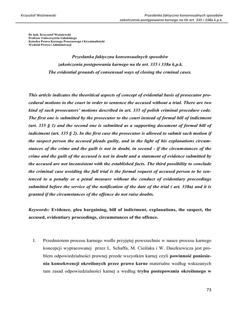 Krzysztof Woźniewski Przesłanka faktyczna konsensualnych sposobów zakończenia postępowania karnego na tle art. 335 i 338a k.p.k. Dr hab. Krzysztof Woźniewski Profesor Uniwersytetu Gdańskiego Katedra Prawa Karnego Procesowego i Kryminalistyki Wydział Prawa i Administracji Przesłanka faktyczna konsensualnych sposobów zakończenia postępowania karnego na tle art. 335 i 338a k.p.k. The evidential grounds of consensual ways of closing the crminal cases. This article indicates the theoritical aspects of concept of evidential basis of prosecutor procedural motions to the court in order to sentence the accused without a trial. There are two kind of such prosecutors’ motions described in art. 335 of polish criminal procedure code. The first one is submitted by the prosecutor to the court instead of formal bill of indictment (art. 335 § 1) and the second one is submitted as a supporting document of formal bill of indictment (art. 335 § 2). In the first case the prosecutor is allowed to submit such motion if the suspect person the accused pleads guilty, and in the light of his explanations circumstances of the crime and the guilt is not in doubt, in second - if the circumstances of the crime and the guilt of the accused is not in doubt and a statement of evidence submitted by the accused are not inconsistent with the established facts. The third possibility to conclude the criminal case avoiding the full trial is the formal request of accused person to be sentenced to a penalty or a penal measure without the conduct of evidentiary proceedings submitted before the service of the notification of the date of the trial ( art. 338a) and it is granted if the circumstances of the offence do not raise doubts. Keywords: Evidence, plea bargaining, bill of indictment, explanations, the suspect, the accused, evidentiary proceedings, circumstances of the offence. I. Przedmiotem procesu karnego wedle przyjętej powszechnie w nauce procesu karnego koncepcji wypracowanej przez L. Schaffa, M. Cieślaka i W. Daszkiewicza jest problem odpowiedzialności prawnej przede wszystkim karnej czyli powinność poniesienia konsekwencji określonych przez prawo karne materialne według wskazanych tam zasad odpowiedzialności karnej a według trybu postepowania określonego w 73 Krzysztof Woźniewski Przesłanka faktyczna konsensualnych sposobów zakończenia postępowania karnego na tle art. 335 i 338a k.p.k. prawie karnym procesowym.1 Jak słusznie zauważa i z mocą podkreśla S. Waltoś „ wiadomość o przestępstwie jest powodem a nie przedmiotem procesu”. 2 Innymi słowy w procesie karnym chodzi o to aby osoba trafnie ustalona przez organy postępowania przygotowawczego jako sprawca przestępstwa poniosła trafne czyli adekwatne z punktu widzenia wymogów sprawiedliwości materialnej konsekwencje karne w ustawowych granicach albowiem jak stwierdza T. Grzegorczyk za M. Cieślakiem trafna reakcja to nie tylko wymóg, aby niewinny nie ponosił odpowiedzialności, a winny był zawsze do niej pociągnięty, ale także to, by osoba winna ponosiła odpowiedzialność nie mniejszą niż tę, na którą zasłużyła, i nie większą od tej, którą ponieść powinna, dopiero wówczas taka reakcja nosi przymiot sprawiedliwej.3 II. Po ustaleniu przedmiotu procesu karnego oraz przyjęciu przez ustawodawcę dyrektywy w myśl, której sprawca przestępstwa został wykryty i pociągnięty do odpowiedzialności karnej, a osoba niewinna nie poniosła tej odpowiedzialności ( art. 2 § 1 pkt 1 k.p.k.) nieuchronnie pojawić się musi pytanie w jaki sposób załatwić kwestię owego przedmiotu procesu karnego oraz doprowadzić do zrealizowania wspomnianej trafnej reakcji karnej z uwzględnieniem ponadto dyrektywy prawdy materialnej (art. 2 § 2 k.p.k.). Do chwili pojawienia się w 1997 r. polskim procesie karnym instytucji związanych z konsensualnym sposobem rozstrzygania kwestii przedmiotu procesu karnego a wraz z tym faktem pojawienia się alternatywy w postaci konsensualizmu zasadniczym sposobem rozstrzygania tej kwestii był model imperatywny kształtowany wprost skodyfikowanymi lub wynikającymi z ogółu norm procesowych nieskodyfikowanymi funkcjonalnymi zasadami procesowymi przykrojonymi odpowiednio dla aktualnego stanu rozwoju procesu karnego w Polsce. W imperatywnym modelu rozstrzygania sporów zawiązujących się na podstawie prawa karnego kwestia odpowiedzialności zostaje rozstrzygnięta dopiero po przeprowadzeniu uruchomionego w wyniku wniesienia skargi zasadniczej postępowania sądowego a ściślej mówiąc po przeprowadzeniu - w jego ramach - przewodu sądowego. Niezależnie jednak od wyboru imperatywnego czy konsensualnego modelu rozstrzygnięcia kwestii odpowiedzialności karnej w obu przypadkach konieczne jest ustalenie tzw. faktu 1 Zob. L.Schaff, Wszczęcie postepowania karnego a problematyka podstawy i przedmiotu procesu, PiP 1959, nr 2, s. 246-260; M. Cieślak, O pojęciu przedmiotu procesu karnego i w sprawie tzw. podstawy procesu, PiP 1959, s. 93; W. Daszkiewicz, Proces karny. Część ogólna, t. I Toruń 1985, s. 33 i n. 2 S. Waltoś, P. Hofmański, Proces karny. Zarys systemu, Warszawa 2016, s. 26 3 Por. T. Grzegorczyk, KPK. Komentarz, Warszawa 2016, s. 51). 74 Krzysztof Woźniewski Przesłanka faktyczna konsensualnych sposobów zakończenia postępowania karnego na tle art. 335 i 338a k.p.k. głównego w postaci zestawu znamion czynu zabronionego stanowiącego podstawę do wyprowadzania konsekwencji karnoprawnych. Specyfiką konsensualnych sposobów zakończenia postepowania karnego wskazanych w art. 335 § 1 i 2 k.p.k. jest sformułowanie propozycji rozstrzygnięcia kwestii odpowiedzialności prawnej sprawcy za zarzucane mu przestępstwo przez organ postępowania przygotowawczego. Propozycja ta stanowi co do zasady postulujące oświadczenie woli organu postępowania przygotowawczego składające się z dwóch podstawowych elementów tj. oświadczenia wiedzy dotyczących faktów sprawy ustala