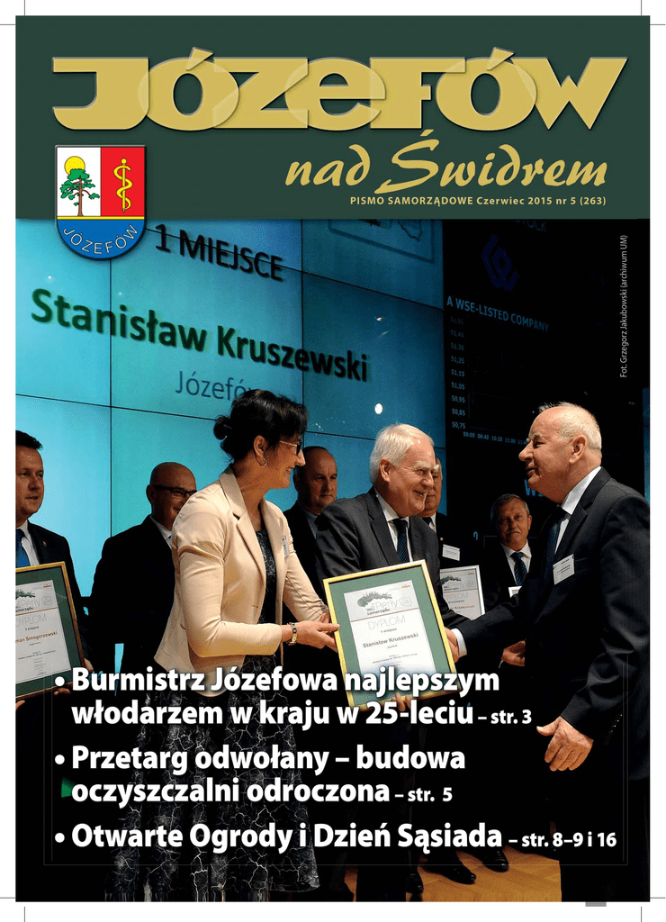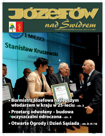 Fot. Grzegorz Jakubowski (archiwum UM) PISMO SAMORZĄDOWE Czerwiec 2015 nr 5 (263) • Burmistrz Józefowa najlepszym włodarzem w kraju w 25-leciu – str. 3 • Przetarg odwołany – budowa oczyszczalni odroczona – str. 5 • Otwarte Ogrody i Dzień Sąsiada – str. 8–9 i 16 PISMO SAMORZĄDOWE Czerwiec 2015 nr 5 (263) 1 Ludzie mówią, że… W maju, jak co roku, obchodzimy „miesiąc z książką”. Jaka jest Pana/Pani ulubiona lektura? Czy korzysta Pan(i) z miejskiej biblioteki i jak ocenia Pan(i) jej ofertę? Rodzina Dembczyńskich z ul. Armii Krajowej Tomek: Moją ulubioną książką jest „Wilk morski” Jacka Londona. Z miejskiej biblioteki nie korzystam, ale moja żona owszem. Ania: Dopiero sprowadzamy się ponownie do Józefowa. Już tu mieszkaliśmy, ale musieliśmy się przenieść do Otwocka. Myśleliśmy, że skoro to tak blisko, sosny takie same, to będzie równie przyjemnie. Myliliśmy się i teraz wracamy. W otwockiej bibliotece panie zachwalały józefowską. Mówiły, że tutaj wiele się dzieje, są spotkania i wystawy, a zbiory są pełne ciekawostek. Z pewnością przekonam się sama. Wypożyczam przede wszystkim książki dla dzieci. Tego, co ja czytam, przeważnie nie ma w bibliotekach. Jednak zdarza mi się szukać materiałów o historii Józefowa czy Otwocka i te znajduję. Amelka najbardziej lubi „Biuro detektywistyczne Lassego i Mai” a nasz synek Daniel uwielbia kiedy mu czytamy „Mądrą Mysz”. To taka seria książeczek, które „objaśniają dzieciom świat”, jak pisze wydawnictwo. Dla mnie zaś niezwykle ważnym tytułem jest „Ramtha – biała księga”. Ala Michalska z ul. Spacerowej W bibliotece szukam głównie lektur. Chodzę do tej w Michalinie, ale zdarza mi się sprawdzać w Józefowie, bo mam po drodze do szkoły – na szczęście wystarczy być zapisanym w jednym miejscu, a korzystać można z obydwu. Właściwie większość tytułów mamy w szkolnych zbiorach. Uwielbiam konie, więc czasem wypożyczam jakieś książki o tych zwierzętach. A moja ulubiona powieść to „Tajemniczy ogród”. Izabela Frankowska z ul. Wiślanej Wypożyczam głównie książki dla dzieci – w michalińskiej filii. Tutaj jest wszystko czego potrzebuję – nie tylko odpowiednie tytuły, ale też przyjemna atmosfera i miłe panie. Moja czternastoletnia córka też tu przychodzi. Bardzo lubi czytać, ostatnio widziałam u niej „Mikołajka”. Pamiętam, że w dzieciństwie kochałam „Tajemniczy ogród”. No i oczywiście wiersze Brzechwy – najbardziej „Na straganie”. Teraz popularne stają się audiobooki – można je znaleźć w bibliotekach. Młodzież często idzie na łatwiznę i częściej słucha lektur zamiast brnąć przez wielostronicowe powieści. Lucyna Nowaczyk, mieszkanka Michalina od 1960 roku Nie mam tej jednej najbardziej ulubionej książki. Najchętniej czytam biografie, właśnie skończyłam Zbyszka Buczkowskiego „Pisz pan książkę” i wspomnienia o Wojciechu Siemionie. To prawdziwe opowieści o życiu prawdziwych ludzi. Bardzo ciekawe. Telewizja jest ogłupiająca, w programach pełno seriali podobnych do siebie, nic nie wnoszą, niczego nie uczą. Dużo jest też filmów, w których cały czas strzelają. Nie chcę tego oglądać, a wieczorem coś trzeba robić, więc czytam. Zawsze dużo czytałam. Korzystam z naszej biblioteki, bo jest tam wspaniały wybór książek, każdy znajdzie coś dla siebie, stale pojawiają się nowości. Przede wszystkim panie w bibliotece są uprzejme, doradzają, przyjemnie się tu przychodzi. Obserwuję też, jak bibliotekarki pracują z dziećmi i młodzieżą. Organizują konkursy z nagrodami, które same fundują, zachęcają młodych ludzi do czytania. To bardzo cenne, bo gdy człowiek jako dziecko nauczy się czytać książki, to jako dorosły będzie czytał. A tacy ludzie są ciekawsi i lepsi. Sondę przeprowadziły Katarzyna i Lidia Dańko 2 PISMO SAMORZĄDOWE Czerwiec 2015 nr 5 (263) Niedziela 21 czerwca Serdecznie zapraszamy do wzięcia udziału w międzypokoleniowym programie kulturalnym przygotowanym w ramach obchodów 25-lecia samorządności w Polsce. Zapraszamy do wspólnego świętowania na Skwerze im. św. Jana Pawła II. DZIECI – godz. 16.00 „KOZIOŁEK MATOŁEK I JEGO PRZYGODY” – spektakl plenerowy. Bajka muzyczna na motywach komiksu Kornela Makuszyńskiego i Mariana Walentynowicza. RODZINY – godz. 17.00 ANIMACJE TANECZNE – zapraszamy na naukę tańca rodzinnego, pokaz baniek oraz plenerowe gry i zabawy dla dzieci. MŁODZIEŻ I RODZINY – godz. 18.00 KONCERT ZESPOŁU „BOMBA KALORYCZNA” DOROŚLI I SENIORZY – godz. 20.00 KONCERT WIECZORU – ZESPÓŁ VOX Zespół koncertuje nieprzerwanie już od 35 lat. W 2013 roku zespół otrzymał nagrodę „Ikona Festiwalu Opole – Nagrodę Honorową Prezesa Zarządu Telewizji Polskiej S.A., Prezydenta Miasta Opole oraz Dyrektora Muzeum Polskiej Piosenki w Opolu”. Koncerty Grupy VOX to wyśmienita zabawa i uczta muzyczna najwyższej próby dla słuchaczy wszystkich pokoleń! Dyżury radnych Przewodniczący Rady Miasta Cezary Łukaszewski – czwartek: 16.30–17.00. Wiceprzewodnicząca Rady Miasta Marianna Jakubowska – środa: 16.30–17.00. Grzegorz Nojszewski 1 czerwca, Damian Podolski 8 czerwca, Adrian Pyra 15 czerwca, Małgorzata Winiarczyk 22 czerwca, Maria Walkiewicz 29 czerwca – godz. 16.30–17.00. Termin spotkania prosimy konsultować telefonicznie: 22 779 00 27 lub e-mailowo: [email protected] W naszym mieście Ranking 25-lecia Perła Samorządu 2015 dla burmistrza Józefowa W 25-lecie samorządności w Polsce redakcja „Dziennika Gazety Prawnej”, w konkursie pod patronatem prezydenta Bronisława Komorowskiego, wręczyła najlepszym w Polsce włodarzom miast i najlepszym samorządom nagrody – „Perły samorządu”. Najlepszym w kraju włodarzem miasta do 100 tys. mieszkańców został długoletni burmistrz Józefowa Stanisław Kruszewski. W kategorii samorządów tylko je