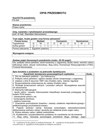 OPIS PRZEDMIOTU Kod ECTS przedmiotu F4-IIIA Nazwa przedmiotu Prawo celne Imię, nazwisko i tytuł/stopień prowadzącego prof. dr hab. Stanisław Naruszewicz Tryb zajęć, liczba godzin oraz forma zaliczenia1 Forma kursu Wykład Ćwiczenia Tygodniowa D W Z D W Z liczba godzin 2 1 1 Forma zaliczenia Egzamin pisemny D Seminarium W Z Wymagania wstępne Zestaw pojęć kluczowych przedmiotu (maks. 25-30 pojęć) Cło; polityka celna państwa; obrót towarowy z zagranicą; taryfa celna; wartość celna; kalkulacja celna; obszar wolnocłowy; dług celny; Konwencja Waszyngtońska CITES; Protokół Montrealski. Spis tematów z podziałem na jednostki dydaktyczne Zawartość tematyczna poszczególnych wykładów Godz. 1. Cło na ziemiach polskich – rys historyczny. 2. Polityka celna państwa i ogólne zasady obrotu towarowego z zagranicą. 3. Ustawa z dnia 9 stycznia 1997 roku Kodeks celny. Zakres regulacji. 4. Rozporządzenia wykonawcze do ustawy Kodeks celny. 5. Rodzaje przeznaczeń celnych i procedur celnych. Szczegółowe warunki ich stosowania. 6. Elementy kalkulacyjne: - taryfa celna i zasady dokonywania klasyfikacji towarowej posługując się kodem PCN towaru, - zawieszenie poboru ceł, - kontyngenty taryfowe, - plafony towarowe. 7. Znaczenie pochodzenia towarów i zasady ustalania niepreferencyjnego i preferencyjnego pochodzenia towaru. 8. Pojęcie wartości celnej. Sytuacje powodujące zakwestionowanie deklarowanej wartości celnej i sposoby jej ustalenia przez organ celny. 9. Wolne obszary celne i składy wolnocłowe. 10. Kodeksowe i pozakodeksowe podstawy do zwolnienia od cła towarów. 11. Dług celny. Sytuacje powodujące powstanie długu celnego. Jego 1 D – tygodniowa liczba godzin na studiach dziennych; W – tygodniowa liczba godzin na studiach wieczorowych; Z- tygodniowa liczba godzin na studiach zaocznych. uiszczenie, zwrot, umorzenie i wygaśnięcie. Zabezpieczenie kwoty wynikającej z długu celnego. 12. Opłaty w sprawach celnych. Depozyty. 13. Kontrola celna – zakres, uprawnienia organu celnego i obowiązki kontrolowanego. 14. Czynności operacyjno-rozpoznawcze i zasady użycia środków przymusu bezpośredniego. 15. Podatki pobierane przez organy celne w związku z przywozem z zagranicy towarów. 16. Wybrane umowy międzynarodowe, obowiązujące w obrocie towarowym z zagranicą ( Konwencja Waszyngtońska CITES, Protokół Montrealski). 17. Zakazy i ograniczenia w obrocie towarowym z zagranicą, ustanowione na podstawie przepisów odrębnych. Razem godzin2 30/16 Literatura obowiązkowa 1. D. Błasiak-Barnuś, D. Pietrusińska-Lipko; Gospodarcze procedury celne; Fundacja Telonarius, Warszawa 1998. 2. D. Błasiak-Barnuś; Zabezpieczenie należności celnych. Materiał szkoleniowy Głównego Urzędu Ceł, Warszawa 2001. 3. D. Błasiak-Barnuś; Wypadki w jakich składa się zabezpieczenie długu celnego; „Monitor Prawa Celnego” nr 10/2001. 4. U. Dyszlewicz, K. Soczyńska; Procedura uproszczona; „Monitor Prawa Celnego” nr 1/2001. 5. A. Drwiło; Wartość celna w obrocie towarowym z zagranicą; „Monitor Prawa Celnego” nr 6/2002. 6. E. Georgie; Tworzenie unii celnych w Europie w XIX i XX wieku; „Monitor Prawa Celnego” nr 1/2001 i 3/2001. 7. Z. Jończyk, R. Makowski; Analiza ryzyka jako narzędzie kontroli celnej. Materiał szkoleniowy Głównego Urzędu Ceł, Warszawa 1996. 8. S. Naruszewicz , M. Laszuk; Prawo celne. Zarys wykładu; LexisNexis, Warszawa 2001. 9. S. Naruszewicz, E. Ruskowski; Polityka i prawo celne i dewizowe; Wyższa Szkoła Finansów i Zarządzania, Siedlce 2002. 10. B. Łuczaj; Prawo celne. Zbiór orzeczeń TK i NSA za lata 1988-1994; Wydawnictwo PARK, Bielko-Biała 1995. Akty prawne: 1. ustawa z dnia 9 stycznia 1997 roku Kodeks celny (Dz.U. 2001 nr 75, poz. 802 – j.t.). 2. rozporządzenie Rady Ministrów z dnia 17 grudnia 2002 roku w sprawie ustanowienia taryfy celnej (Dz.U. 2002, nr 226, poz. 1885). 3. rozporządzenie Ministra Finansów z dnia 15 września 1999 roku wyjaśnienia dotyczące wartości celnej (Dz.U. 1999, nr 80, poz. 908). 4. rozporządzenie Ministra Finansów z dnia 24 sierpnia 1999 roku w sprawie wyjaśnień do Taryfy celnej (Dz.U. 1999, nr 76, poz. 830). 5. rozporządzenie Ministra Finansów z dnia 8 marca 2001 roku w sprawie 2 30/16 – ogólna liczba godzin zajęć dydaktycznych z danego przedmiotu w układzie „studia dzienne / studia wieczorowe i zaoczne”. gospodarczych procedur celnych (Dz.U. 2001, nr 18, poz. 214). 6. rozporządzenie Ministra Finansów z dnia 31 grudnia 2001 roku w sprawie procedur uproszczonych (Dz.U. 2002, nr 5, poz. 48). 7. rozporządzenie Ministra Finansów z dnia 5 marca 2001 roku w sprawie opłat pobieranych przez organy celne (Dz.U. 2001, nr 17, poz. 194). 8. rozporządzenie Rady Ministrów z dnia 15 października 1997 roku w sprawie określenia szczegółowych zasad i trybu ustalania niepreferencyjnego pochodzenia towarów, sposobu jego udokumentowania oraz listy towarów, których pochodzenie musi być udokumentowane świadectwem pochodzenia (Dz.U. 1997, nr 130, poz. 851). 9. rozporządzenie Rady Ministrów z dnia 21 października 1997 roku w sprawie określenia reguł preferencyjnego pochodzenia towarów oraz sposobu jego dokumentowania (Dz.U. 1997, nr 134, poz. 886). Literatura dodatkowa Warunki zaliczenia3 ocena dostateczna (3) ocena dobra (4) ocena bardzo dobra (5) 3 51 – 60 % 75 – 84 % 95 – 100 % Procentowe minimum zaliczeniowe określone tabelą ECTS.