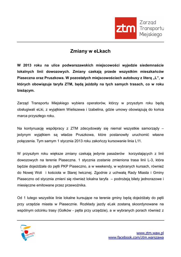Zmiany w eLkach W 2013 roku na ulice podwarszawskich miejscowości wyjedzie siedemnaście lokalnych linii dowozowych. Zmiany czekają przede wszystkim mieszkańców Piaseczna oraz Pruszkowa. W pozostałych miejscowościach autobusy z literą „L”, w których obowiązuje taryfa ZTM, będą jeździły na tych samych trasach, co w roku bieżącym. Zarząd Transportu Miejskiego wybiera operatorów, którzy w przyszłym roku będą obsługiwali eLki, z wyjątkiem Wieliszewa i Izabelina, gdzie umowy obowiązują do końca marca przyszłego roku. Na kontynuację współpracy z ZTM zdecydowały się niemal wszystkie samorządy – jedynym wyjątkiem są władze Pruszkowa, które postanowiły uruchomić własne połączenia. Tym samym 1 stycznia 2013 roku zakończy kursowanie linia L11. W przyszłym roku większe zmiany czekają jedynie pasażerów korzystających z linii dowozowych na terenie Piaseczna. 1 stycznia zostanie zmieniona trasa linii L-3, która będzie dojeżdżała do pętli PKP Piaseczno, a w weekendy, w wybranych kursach, również do Nowej Woli i kościoła w Starej Iwicznej. Zgodnie z uchwałą Rady Miasta i Gminy Piaseczno od stycznia zmieni się również lokalna taryfa – podrożeją bilety jednorazowe i miesięczne emitowane przez przewoźnika. Od 1 lutego wszystkie linie lokalne kursujące na terenie gminy będą dojeżdżały do pętli przy urzędzie miasta w Piasecznie. Rozkłady jazdy eLek zostaną skoordynowane na wspólnym odcinku trasy (Gołków - pętla przy urzędzie), a w wybranych porach również z www.ztm.waw.pl www.facebook.com/ztm.warszawa linią 727. Dzięki temu linie L-2, L-5 oraz L13 w godzinach szczytu będą podjeżdżały na przystanki średnio co 10-20 minut, a w pozostałych porach co pół godziny. W pozostałych gminach ceny biletów (emitowanych przez przewoźników) i trasy pozostają bez zmian. www.ztm.waw.pl www.facebook.com/ztm.warszawa