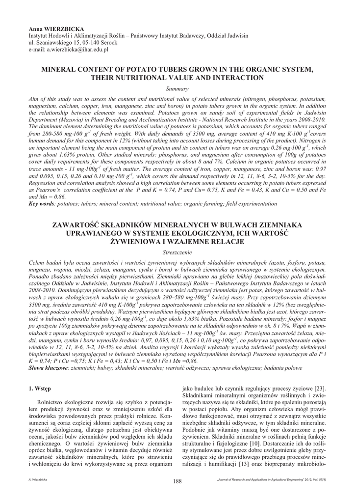 Anna WIERZBICKA Instytut Hodowli i Aklimatyzacji Rolin – Pastwowy Instytut Badawczy, Oddzia Jadwisin ul. Szaniawskiego 15, 05-140 Serock e-mail: [email protected] MINERAL CONTENT OF POTATO TUBERS GROWN IN THE ORGANIC SYSTEM, THEIR NUTRITIONAL VALUE AND INTERACTION Summary Aim of this study was to assess the content and nutritional value of selected minerals (nitrogen, phosphorus, potassium, magnesium, calcium, copper, iron, manganese, zinc and boron) in potato tubers grown in the organic system. In addition the relationship between elements was examined. Potatoes grown on sandy soil of experimental fields in Jadwisin Department (Mazovia) in Plant Breeding and Acclimatization Institute - National Research Institute in the years 2008-2010. The dominant element determining the nutritional value of potatoes is potassium, which accounts for organic tubers ranged from 280-580 mg100 g-1 of fresh weight. With daily demands of 3500 mg, average content of 410 mg K100 g-1covers human demand for this component in 12% (without taking into account losses during processing of the product). Nitrogen is an important element being the main component of protein and its content in tubers was on average 0.26 mg100 g-1, which gives about 1.63% protein. Other studied minerals: phosphorus, and magnesium after consumption of 100g of potatoes cover daily requirements for these components respectively in about 8 and 7%. Calcium in organic potatoes occurred in trace amounts - 11 mg100g-1 of fresh matter. The average content of iron, copper, manganese, zinc and boron was: 0.97 and 0.095, 0.15, 0.26 and 0.10 mg100 g-1, which covers the demand respectively in 12, 11, 8-6, 3-2, 10-5% for the day. Regression and correlation analysis showed a high correlation between some elements occurring in potato tubers expressed as Pearson’s correlation coefficient at the P and K = 0.74, P and Cu= 0.75, K and Fe = 0.43, K and Cu = 0.50 and Fe and Mn = 0.86. Key words: potatoes; tubers; mineral content; nutritional value; organic farming; field experimentation ZAWARTO SKADNIKÓW MINERALNYCH W BULWACH ZIEMNIAKA UPRAWIANEGO W SYSTEMIE EKOLOGICZNYM, ICH WARTO YWIENIOWA I WZAJEMNE RELACJE Streszczenie Celem bada bya ocena zawartoci i wartoci ywieniowej wybranych skadników mineralnych (azotu, fosforu, potasu, magnezu, wapnia, miedzi, elaza, manganu, cynku i boru) w bulwach ziemniaka uprawianego w systemie ekologicznym. Ponadto zbadano zalenoci midzy pierwiastkami. Ziemniaki uprawiano na glebie lekkiej (mazowieckie) pola dowiadczalnego Oddziau w Jadwisinie, Instytutu Hodowli i Aklimatyzacji Rolin – Pastwowego Instytutu Badawczego w latach 2008-2010. Dominujcym pierwiastkiem decydujcym o wartoci odywczej ziemniaka jest potas, którego zawarto w bulwach z upraw ekologicznych wahaa si w granicach 280–580 mg100g-1 wieej masy. Przy zapotrzebowaniu dziennym 3500 mg, rednia zawarto 410 mg K100g-1 pokrywa zapotrzebowanie czowieka na ten skadnik w 12% (bez uwzgldnienia strat podczas obróbki produktu). Wanym pierwiastkiem bdcym gównym skadnikiem biaka jest azot, którego zawarto w bulwach wynosia rednio 0,26 mg100g-1, co daje okoo 1,63% biaka. Pozostae badane mineray: fosfor i magnez po spoyciu 100g ziemniaków pokrywaj dzienne zapotrzebowanie na te skadniki odpowiednio w ok. 8 i 7%. Wap w ziemniakach z upraw ekologicznych wystpi w ladowych ilociach – 11 mg100g-1 w. masy. Przecitna zawarto elaza, miedzi, manganu, cynku i boru wynosia rednio: 0,97, 0,095, 0,15, 0,26 i 0,10 mg100g-1, co pokrywa zapotrzebowanie odpowiednio w 12, 11, 8-6, 3-2, 10-5% na dzie. Analiza regresji i korelacji wykazay wysok zaleno pomidzy niektórymi biopierwiastkami wystpujcymi w bulwach ziemniaka wyraon wspóczynnikiem korelacji Pearsona wynoszcym dla P i K = 0,74; P i Cu =0,75; K i Fe = 0,43; K i Cu = 0,50 i Fe i Mn =0,86. Sowa kluczowe: ziemniaki; bulwy; skadniki mineralne; warto odywcza; uprawa ekologiczna; badania polowe jako budulec lub czynnik regulujcy procesy yciowe [23]. Skadnikami mineralnymi organizmów rolinnych i zwierzcych nazywa si te skadniki, które po spaleniu pozostaj w postaci popiou. Aby organizm czowieka móg prawidowo funkcjonowa, musi otrzyma z zewntrz wszystkie niezbdne skadniki odywcze, w tym skadniki mineralne. Podobnie jak witaminy musz by one dostarczone z poywieniem. Skadniki mineralne w rolinach peni funkcje strukturalne i fizjologiczne [10]. Dostarczanie ich do roliny stymulowane jest przez dobre uwilgotnienie gleby przyczyniajce si do prawidowego przebiegu procesów mineralizacji i humifikacji [13] oraz biopreparaty mikrobiolo- 1. Wstp Rolnictwo ekologiczne rozwija si szybko z potencjaem produkcji ywnoci oraz w zmniejszeniu szkód dla rodowiska powodowanych przez praktyki rolnicze. Konsumenci s coraz czciej skonni zapaci wysz cen za ywno ekologiczn, dlatego potrzebna jest obiektywna ocena, jakoci bulw ziemniaków pod wzgldem ich skadu chemicznego. O wartoci ywieniowej bulw ziemniaka oprócz biaka, wglowodanów i witamin decyduje równie zawarto skadników mineralnych, które po strawieniu i wchoniciu do krwi wykorzystywane s przez organizm A. Wierzbicka 188 „Journal of Research and Applications in Agricultural Engineering” 2012, Vol. 57(4) giczne (zwane te „uyniaczami”), poprawiajce jej yzno, plonowanie i skad chemiczny bulw [21]. Kilku autorów wykazao, du aktywno mikrobiologiczn gleb w warunkach produkcji ekologicznej [6, 7, 12] i wpyw kwanego odczynu gleby pHKCL < 5,5 [2, 18, 19] na zwikszenie dostpnoci w niej cynku, manganu, miedzi i elaza. redni z omiu odmian i czterech kombinacji (liczebno prób, n = 80). Oceniano makroelementy (azot, fosfor, potas, magnez, wap) i mikroelementy (mied, elazo, manganu, cynk, bor). Pierwszym czynnikiem byo nawadnianie za pomoc linii kroplujcych, które polegao na zadawaniu dawek wody w zalenoci od wilgotnoci gleby. Nawadnianie sterowane byo programem komputerowym (DSS), ograniczajcym straty wody spowodowane odpywem jej poza zasig systemu korzeniowego. Drugim czynnikiem byo zastosowanie