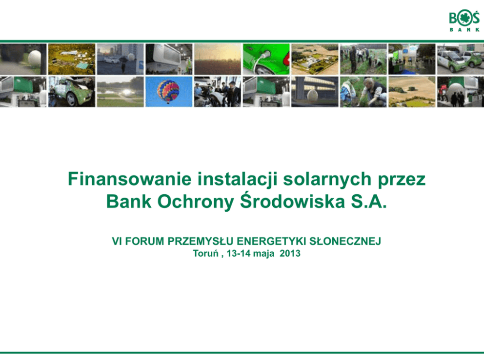 Finansowanie instalacji solarnych przez Bank Ochrony Środowiska S.A. VI FORUM PRZEMYSŁU ENERGETYKI SŁONECZNEJ Toruń , 13-14 maja 2013 Kluczowe fakty Ustawa o odnawialnych źródłach energii Pierwszy projekt ustawy – zamrożenie lub spowolnienie procesów inwestycyjnych z powodu zawieszenia finansowania przez większość banków – spadek cen projektów w stanie deweloperskim i gotowych obiektów Zmiany w projekcie ustawy (wer.2.0.2 z 9.10.2012 r.) – ożywienie na rynku i powrót na ścieżkę rozwoju, głównie dzięki projektom wiatrowym (studzone spadkiem cen zielonych certyfikatów) Nowe, korzystne zapisy współczynników korekcyjnych dla fotowoltaiki – masowe zainteresowanie nową dziedziną OZE przez inwestorów, producentów, dystrybutorów i kooperantów Otwarcie furtki dla rozwoju rynku prosumentów Podstawowe ryzyka związane z procesem legislacyjnym: zmiana już przyjętych parametrów dla poszczególnych OZE brak pewności co do daty wejścia w życie ustawy Ustawa o odnawialnych źródłach energii konieczna dla ustabilizowania sytuacji prawnej i rozwoju rynku odnawialnych źródeł energii 2 Finansowanie inwestycji – doświadczenie Czego wymaga rynek inwestycji proekologicznych? Narzędzi finansowych, które zapewnią start i rozwój projektów Nowatorskiego podejścia banków Elastycznego dostosowania do indywidualnych potrzeb inwestorów Bank Ochrony Środowiska S.A. jest jedynym spośród banków komercyjnych w Polsce, którego misją jest finansowa obsługa przedsięwzięć służących ochronie środowiska Bank Ochrony Środowiska S.A. ma doświadczenie w zakresie finansowania projektów proekologicznych i dostosowuje swoją ofertę do potrzeb klientów Nasi klienci to samorządy, przedsiębiorcy, osoby prywatne 3 Kredyty proekologiczne w BOŚ 1991 – 2012 r. Ochrona atmosfery 60% Ochrona wód i gospodarka wodna 32% Ochrona ziemi 7% Ochrona przyrody 1% Liczba udzielonych kredytów: ok. 58 tys. Kwota udzielonych kredytów: 11 mld PLN 4 Kredyty proekologiczne w BOŚ 2012 r. Efektywność energetyczna 27% Modernizacja procesów 6% Odnawialne źródła enegii 26% Gospodarka wodno-ściekowa 16% Gospodarka odpadami 7% Inne 18% Liczba udzielonych kredytów: 4,8 tys. Kwota udzielonych kredytów: 757 mln PLN 5 Efekty ekologiczne z kredytowanej inwestycji z inwestycji zakończonych w latach 1991 - 2012 Redukcja emisji: Produkcja energii elektrycznej z OZE CO2 SO2 NOx Pył 1.973 tys. Mg/a 481 tys. Mg/a 44 tys. Mg/a 139 tys. Mg/a 948 tys. MWh/a 2012 412,7 tys. Mg/a 5,1 tys. Mg/a 1,0 tys. Mg/a 0,5 tys. Mg/a 233 tys. MWh/a 6 Instrumenty bankowe Kredyty dedykowane Kredyty preferencyjne w ramach systemów wsparcia Kredyty we współpracy z zagranicznymi instytucjami finansowymi Kredyty komercyjne „specjalizowane” Kredyty uniwersalne Inne instrumenty finansowe Obligacje komunalne i korporacyjne Wykup wierzytelności Gwarancje bankowe 7 Kredyty proekologiczne BOŚ Banku Preferencje po stronie cenowej – oprocentowanie kredytów obniżone w stosunku do warunków standardowych Kredyty we współpracy z WFOŚiGW Kredyty we współpracy z NFOŚiGW Preferencje po stronie nakładów na inwestycję – dotacja Kredyty we współpracy z WFOŚiGW Kredyty we współpracy z NFOŚiGW Preferencje po stronie konstrukcji finansowania: – obniżona marża i/lub prowizja w stosunku do standardowej oferty Banku – obniżony wymagany wkład własny – wydłużony okres karencji w spłacie kapitału Kredyt z Dobrą Energią Kredyty we współpracy z zagranicznymi instytucjami finansowymi Ekologiczny kredyt hipoteczny 8 Słoneczny EKOkredyt Kredyt z dopłatą NFOŚiGW w ramach Programu priorytetowego pn. „Program dla przedsięwzięć w zakresie odnawialnych źródeł energii i obiektów wysokosprawnej kogeneracji” (część 3) – Dopłaty na częściowe spłaty kapitału kredytów bankowych przeznaczonych na zakup i montaż kolektorów słonecznych dla osób fizycznych i wspólnot mieszkaniowych Adresaci kredytu: osoby fizyczne posiadające prawo do dysponowania budynkiem mieszkalnym lub budynkiem mieszkalnym w budowie wspólnoty mieszkaniowe instalujące kolektory słoneczne na własnych budynkach wielolokalowych, którym to budynkom mają służyć instalowane kolektory (z wyłączeniem odbiorców ciepła z miejskiej sieci cieplnej do podgrzewania wody użytkowej) ! Możliwość skorzystania z preferencji po stronie nakładów na inwestycję – 45% dotacja ze środków Funduszu 9 Kredyty preferencyjne z WFOŚiGW 1/2 Wsparcie regionalnych programów ochrony środowiska, w tym dotyczących odnawialnych źródeł energii Wykorzystanie dźwigni finansowej ! Mechanizmy kredyty ze środków Funduszu dopłaty do oprocentowania dopłata do kapitału w ramach umów lub decyzji indywidualnych Warunki kredytowe – ustalane przez WFOŚiGW przedmiot finansowania (lista zadań priorytetowych) podmiot uprawniony do ubiegania się o finansowanie kwota kredytu i jej udział w kosztach zadania oprocentowanie/wysokość dopłat okres kredytowania i karencji 10 Kredyty preferencyjne z WFOŚiGW 2/2 przykłady finansowania instalacji solarnych: Województwo kujawsko-pomorskie dopłata do odsetek, oprocentowanie: 1,5% w skali roku kolektory słoneczne, ogniwa PV do 100 kW max. kredyt – 500 tys. zł, do 90% kosztów inwestycji okres kredytowania – do 5 lat Województwo mazowieckie dopłata do oprocentowania lub kapitału (dla osób fizycznych i JST), oprocentowanie WIBOR 3M + 0,5 p.p. lub dopłata do kapitału w wysokości 20% kwoty kredytu kolektory słoneczne, ogniwa PV max. kredyt – do 80% kosztów inwestycji okres kredytowania – do 10 lat Województwo łódzkie dopłata do odsetek dla przedsiębiorców i JST, oprocentowanie: WIBOR 3M - 0,5 p.p. kolektory słoneczne, ogniwa PV max. kredyt – do 99% kosztów kwalifikowanych okres kredytowania – do10 lat Województwo wielkopolskie dopłata do odsetek, oprocentowanie: WIBOR 3M + marża - 3 p.p. dopłaty przez okres nie dłuży niż 60 m-