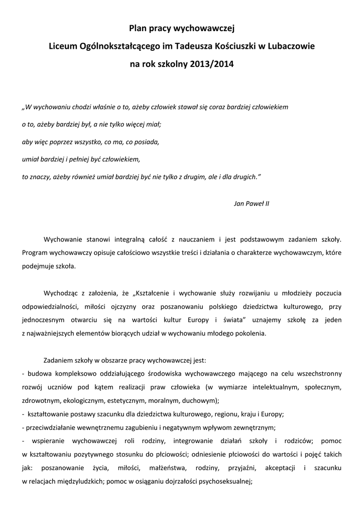 Plan pracy wychowawczej Liceum Ogólnokształcącego im Tadeusza Kościuszki w Lubaczowie na rok szkolny 2013/2014 „W wychowaniu chodzi właśnie o to, ażeby człowiek stawał się coraz bardziej człowiekiem o to, ażeby bardziej był, a nie tylko więcej miał; aby więc poprzez wszystko, co ma, co posiada, umiał bardziej i pełniej być człowiekiem, to znaczy, ażeby również umiał bardziej być nie tylko z drugim, ale i dla drugich.” Jan Paweł II Wychowanie stanowi integralną całość z nauczaniem i jest podstawowym zadaniem szkoły. Program wychowawczy opisuje całościowo wszystkie treści i działania o charakterze wychowawczym, które podejmuje szkoła. Wychodząc z założenia, że „Kształcenie i wychowanie służy rozwijaniu u młodzieży poczucia odpowiedzialności, miłości ojczyzny oraz poszanowaniu polskiego dziedzictwa kulturowego, przy jednoczesnym otwarciu się na wartości kultur Europy i świata” uznajemy szkołę za jeden z najważniejszych elementów biorących udział w wychowaniu młodego pokolenia. Zadaniem szkoły w obszarze pracy wychowawczej jest: - budowa kompleksowo oddziałującego środowiska wychowawczego mającego na celu wszechstronny rozwój uczniów pod kątem realizacji praw człowieka (w wymiarze intelektualnym, społecznym, zdrowotnym, ekologicznym, estetycznym, moralnym, duchowym); - kształtowanie postawy szacunku dla dziedzictwa kulturowego, regionu, kraju i Europy; - przeciwdziałanie wewnętrznemu zagubieniu i negatywnym wpływom zewnętrznym; - wspieranie wychowawczej roli rodziny, integrowanie działań szkoły i rodziców; pomoc w kształtowaniu pozytywnego stosunku do płciowości; odniesienie płciowości do wartości i pojęć takich jak: poszanowanie życia, miłości, małżeństwa, rodziny, przyjaźni, w relacjach międzyludzkich; pomoc w osiąganiu dojrzałości psychoseksualnej; akceptacji i szacunku - uświadomienie roli rodziny w życiu człowieka; promowanie trwałych związków, których podstawą jest więź emocjonalna, efektywne sposoby komunikowania się, wzajemne zrozumienie; przekazywanie rzetelnej, dostosowanej do poziomu rozwoju ucznia, wiedzy na temat zmian biologicznych, psychicznych i społecznych w różnych fazach rozwoju człowieka. - kształtowanie aktywnej postawy wobec własnego życia zawodowego –przygotowanie młodzieży do trafnego wyboru zawodu i drogi dalszego kształcenia. Cele pracy wychowawczej: Uznajemy, że celem naszej pracy wychowawczej jest kształcenie w wychowankach: - motywacji w poszukiwaniu i nabywaniu wiedzy i umiejętności niezbędnych do samodzielnego poszukiwania ważnych dla siebie wartości i dokonywania wyborów w każdej sytuacji; - motywacji, jako podstawy do pracy nad sobą, odkrywania swoich mocnych i słabych stron osobowości; - umiejętności określania osobistych potrzeb i interesów oraz ich zaspokajania na zasadzie godzenia dobra własnego z dobrem innych; - umiejętności brania na siebie odpowiedzialności za podejmowane decyzje i efekty swojego postępowania wobec innych; - umiejętności konstruktywnego, realistycznego określania osobistych celów życiowych, ważnych dla odnalezienia własnego miejsca w świecie; - poszanowania dobra wspólnego społeczności szkoły i innych społeczności, w których będą funkcjonować; - umiejętności umożliwiających rozpoznawanie i wyrażanie osobistych możliwości, potrzeb, zachowań i postaw w sytuacjach społecznych oraz sprawnego komunikowania się z innymi ludźmi i ich rozumienia; - umiejętności niezbędnych do przygotowania się do życia w rodzinie, w społeczności lokalnej i w demokratycznym państwie, zgodnie z przekazem tradycji kulturowej i poczuciem więzi z otoczeniem społecznym (rodzina, środowisko lokalne, region, państwo); - postaw prospołecznych i umiejętności wchodzenia w konstruktywne relacje na terenie szkoły rozumianej jako wspólnota nauczycieli i uczniów; - postaw obywatelsko - patriotycznych. W konsekwencji przyjęcia tak sformułowanych celów globalnych ważnym obszarem pracy wychowawczej jest kształcenie konkretnych umiejętności i dyspozycji, niezbędnych do funkcjonowania w rolach społecznych i zawodowych, wymaganych w warunkach współczesnego świata. Oddziaływania wychowawcze społeczności szkolnej powinny stwarzać uczniom warunki do nabywania następujących umiejętności: - planowania, organizowania i oceniania własnego procesu uczenia się i przyjmowania coraz większej odpowiedzialności za własną naukę; - budowania świadomości związku pomiędzy absencją, wynikami w nauce a własną przyszłością; - skutecznego porozumiewania się w różnych sytuacjach interpersonalnych i społecznych; - prezentacji własnego punktu widzenia i brania pod uwagę poglądów innych ludzi; - poprawnego posługiwania się językiem ojczystym, ze szczególnym uwzględnieniem sytuacji społecznych i wystąpień publicznych; - efektywnego współdziałania w zespole i pracy w grupie; budowania więzi międzyludzkich; - podejmowania indywidualnych i grupowych decyzji; skutecznego działania w granicach obowiązujących norm; - konstruktywnego funkcjonowania w sytuacjach konfliktowych, stosowania metod i technik negocjacyjnego rozwiązywania konfliktów i problemów społecznych we własnych środowiskach; - radzenia sobie w sytuacjach trudnych i problemowych, rozwiązywania problemów w twórczy sposób; - poszukiwania, porządkowania i wykorzystywania informacji z różnych źródeł oraz efektywnego posługiwania się nowoczesnymi technologiami informacyjnymi; - efektywnego zachowania się w sytuacjach decydujących o wyborze dalszej drogi edukacyjnej. Realizacja pracy wychowawczej następuje w obrębie następujących obszarów działania: Lp. 1. Obszar działania Działania organizacyjnowychowawcze Cele i efekty do uzyskania (co chcemy osiągnąć) 1.Prawidłowe funkcjonowanie zespołów klasowych pod względem wychowawczym i organizacyjnym. 2. Umożliwienie poznan