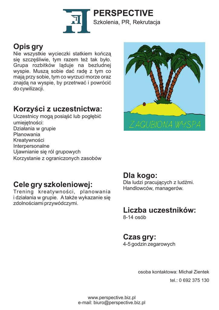 Opis gry Nie wszystkie wycieczki statkiem koñcz¹ siê szczêœliwie, tym razem te¿ tak by³o. Grupa rozbitków l¹duje na bezludnej wyspie. Musz¹ sobie daæ radê z tym co maj¹ przy sobie, tym co wyrzuci morze oraz znajd¹ na wyspie, by przetrwaæ i powróciæ do cywilizacji. Korzyœci z uczestnictwa: Uczestnicy mog¹ posi¹œæ lub pog³êbiæ umiejêtnoœci: Dzia³ania w grupie Planowania Kreatywnoœci Interpersonalne Ujawnianie siê ról grupowych Korzystanie z ograniczonych zasobów Dla kogo: Cele gry szkoleniowej: Trening kreatywnoœci, planowania i dzia³ania w grupie. A tak¿e wykazanie siê zdolnoœciami przywódczymi. Dla ludzi pracuj¹cych z ludŸmi. Handlowców, managerów. Liczba uczestników: 8-14 osób Czas gry: 4-5 godzin zegarowych osoba kontaktowa: Micha³ Zientek tel.: 0 692 375 130 www.perspective.biz.pl e-mail: [email protected]