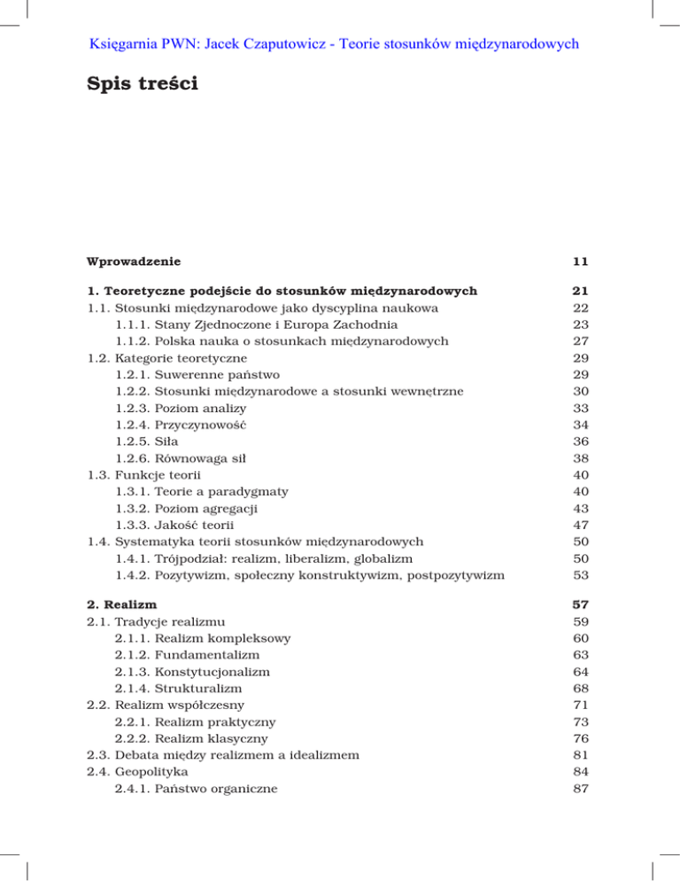 Księgarnia PWN: Jacek Czaputowicz - Teorie stosunków międzynarodowych Spis treści Wprowadzenie 11 1. Teoretyczne podejście do stosunków międzynarodowych 1.1. Stosunki międzynarodowe jako dyscyplina naukowa 1.1.1. Stany Zjednoczone i Europa Zachodnia 1.1.2. Polska nauka o stosunkach międzynarodowych 1.2. Kategorie teoretyczne 1.2.1. Suwerenne państwo 1.2.2. Stosunki międzynarodowe a stosunki wewnętrzne 1.2.3. Poziom analizy 1.2.4. Przyczynowość 1.2.5. Siła 1.2.6. Równowaga sił 1.3. Funkcje teorii 1.3.1. Teorie a paradygmaty 1.3.2. Poziom agregacji 1.3.3. Jakość teorii 1.4. Systematyka teorii stosunków międzynarodowych 1.4.1. Trójpodział: realizm, liberalizm, globalizm 1.4.2. Pozytywizm, społeczny konstruktywizm, postpozytywizm 21 22 23 27 29 29 30 33 34 36 38 40 40 43 47 50 50 53 2. Realizm 2.1. Tradycje realizmu 2.1.1. Realizm kompleksowy 2.1.2. Fundamentalizm 2.1.3. Konstytucjonalizm 2.1.4. Strukturalizm 2.2. Realizm współczesny 2.2.1. Realizm praktyczny 2.2.2. Realizm klasyczny 2.3. Debata między realizmem a idealizmem 2.4. Geopolityka 2.4.1. Państwo organiczne 57 59 60 63 64 68 71 73 76 81 84 87 Spis treści 2.4.2. Teoria sfer wpływów 2.4.3. Geopolityka globalna 2.5. Behawioralizm 2.6. Debata między behawioralizmem a tradycjonalizmem 2.7. Realizm strategiczny 88 89 91 97 100 3. Liberalizm 3.1. Tradycje 3.1.1. Liberalizm kompleksowy 3.1.2. Liberalizm instytucjonalny 3.1.3. Liberalizm ekonomiczny 3.1.4. Idealizm 3.2. Idealizm międzywojenny i powojenny 3.3. Tradycyjne teorie integracji 3.3.1. Funkcjonalizm 3.3.2. Federalizm 3.3.3. Transakcjonizm 3.3.4. Neofunkcjonalizm 3.4. Teorie racjonalnego wyboru 3.4.1. Paradygmat biurokratyczny 3.5. Teoria demokratycznego pokoju 3.6. Teoria bezpieczeństwa zbiorowego 3.6.1. Realistyczna krytyka 103 105 108 109 111 112 113 116 117 120 122 124 128 130 132 137 138 4. Globalizm 4.1. Teorie imperializmu 4.1.1. Teorie liberalne 4.1.2. Marksizm i teoria Lenina 4.1.3. Teorie społeczno-psychologiczne 4.2. Teoria zależności 4.2.1. Model funkcjonowania świata 4.2.2. Teorie zależności a teorie modernizacyjne 4.3. Teoria systemu światowego 4.3.1. Zasady funkcjonowania systemu światowego 4.3.2. Krytyka 4.4. Neogramscianizm 4.5. Marksizm neoklasyczny 4.6. Debata międzyparadygmatyczna 141 143 145 146 149 150 151 154 157 159 161 163 167 170 5. Neorealizm 5.1. Realizm strukturalny 5.1.1. Teorie systemowe a teorie redukcyjne 5.1.2. Struktura systemu międzynarodowego 175 176 177 179 Spis treści 5.1.3. Porównanie realizmu klasycznego i strukturalnego 5.2. Biegunowość a stabilność systemu międzynarodowego 5.3. Realizm defensywny a realizm ofensywny 5.3.1. Teoria równowagi zagrożenia 5.4. Realizm zależny 5.4.1. Znaczenie broni nuklearnej 5.5. Realizm neoklasyczny 5.5.1. Teoria hegemonicznej stabilności 5.5.2. Realizm strukturalny a realizm neoklasyczny 5.6. Realizm kulturowy 5.7. Zdolności eksplanacyjne realizmu 183 185 190 195 197 199 201 203 204 206 208 6. Neoliberalizm 6.1. Kompleksowa współzależność 6.1.1. Zyski relatywne a zyski absolutne 6.2. Teoria gier a współpraca międzynarodowa 6.2.1. Kooperacja (dylemat więźnia) 6.2.2. Koordynacja (walka płci) 6.2.3. Perswazja 6.2.4. Zapewnienie (polowanie na jelenia) 6.3. Organizacje międzynarodowe 6.4. Teoria reżimów 6.4.1. Klasyfikacja reżimów 6.4.2. Multilateralizm 6.5. Debata wewnątrzparadygmatyczna 6.6. Globalizacja 6.6.1. Wpływ na państwo 6.6.2. Stanowiska sceptyków i globalistów 6.7. Teorie końca 6.8. Liberalizm współczesny 213 216 220 222 223 225 225 226 227 229 232 236 238 241 243 245 246 251 7. Szkoła angielska 7.1. Tradycje 7.2. Kategoria społeczności międzynarodowej 7.2.1. Społeczność międzynarodowa w historii 7.2.2. Instytucje społeczności międzynarodowej 7.2.3. Charakter współczesnej społeczności międzynarodowej 7.3. Trialektyka szkoły angielskiej 7.4. Konstruktywizm szkoły angielskiej 7.5. Nurty w ramach szkoły angielskiej 7.5.1. Pluralizm 7.5.2. Solidaryzm 7.5.3. Problem spójności założeń 253 255 259 264 265 267 269 273 276 276 277 279 Spis treści 7.6. Społeczność międzynarodowa Unii Europejskiej 7.6.1. Wyjaśnienie integracji europejskiej 7.6.2. Szkoła angielska a neofunkcjonalizm 7.7. Znaczenie szkoły angielskiej 7.7.1. Program badawczy 8. Konstruktywizm 8.1. Tradycje 8.2. Konstruktywizm a racjonalizm 8.2.1. Klasyfikacje teorii według wpływu struktury i znaczenia idei 8.3. Nurty w ramach konstruktywizmu 8.3.1. Stanowiska epistemologiczne 8.4. Społeczne pochodzenie rzeczywistości 8.4.1. Aktorzy i tożsamości 8.4.2. Struktura systemu międzynarodowego 8.5. Struktura normatywna społeczności międzynarodowej 8.5.1. Transformacja kultury społeczności międzynarodowej 8.5.2. Proces komunikacji 8.5.2. Perspektywa kultury światowej 8.6. Suwerenność jako konstrukcja społeczna 8.6.1. Postrzeganie bezpieczeństwa 282 282 287 289 290 291 293 295 300 301 304 306 306 310 314 316 318 319 321 322 9. Teorie integracji europejskiej 327 9.1. Realizm a integracja europejska 329 9.2. Liberalizm międzyrządowy 333 9.2.1. Porównanie neofunkcjonalizmu i liberalizmu międzyrządowego 338 9.3. Klasyfikacje teorii integracji 342 9.4. Nowy instytucjonalizm 343 9.4.1. Instytucjonalizm racjonalnego wyboru 345 9.4.2. Instytucjonalizm historyczny 346 9.4.3. Instytucjonalizm socjologiczny (konstruktywizm) 348 9.4.4. Porównanie nurtów instytucjonalnych 350 9.5. Spór o istotę Unii Europejskiej 354 9.6. Unia jako system polityczny 359 9.6.1. Studia porównawcze 360 9.6.2. Wielopoziomowe zarządzanie 361 9.6.3. Koncepcja fuzji 363 9.6.4. Państwo regulacyjne 365 9.7. Unia jako aktor 367 10. Feminizm, teorie krytyczne, historyczna socjologia 10.1. Feminizm 10.1.1. Nurty 371 372 374 Spis treści 10.1.2. Zainteresowania badawcze 10.1.3. Druga generacja 10.2. Teorie krytyczne 10.2.2. Postrzeganie stosunków międzynarodowych 10.2.3. Krytyczne studia nad bezpieczeństwem 10.3. Historyczna socjologia 10.3.1. Problematyzacja p