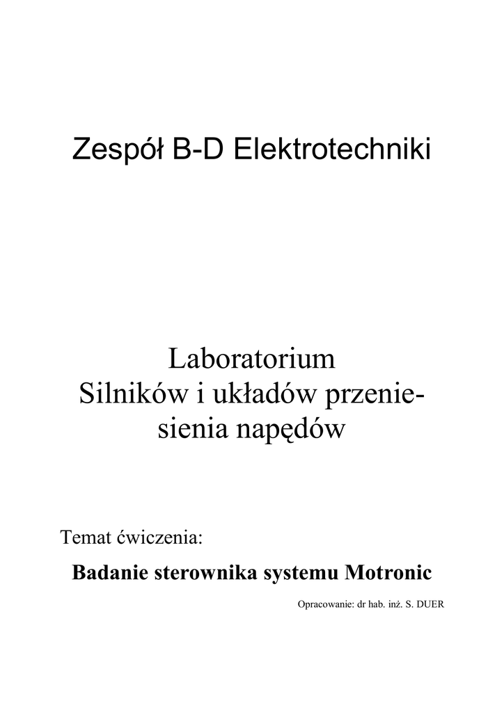 Zespół B-D Elektrotechniki Laboratorium Silników i układów przeniesienia napędów Temat ćwiczenia: Badanie sterownika systemu Motronic Opracowanie: dr hab. inż. S. DUER 2. Instrukcja do ćwiczenia laboratoryjnego 2.1. Zapoznanie się z budową stanowiska laboratoryjnego oraz warunkami jego uruchamiania i ustawiania parametrów pracy a) zapoznać się z instrukcją budowy i użytkowania stanowiska laboratoryjnego MOTRONIC oraz warunkami jego uruchamiania i ustawiania parametrów pracy 2.2. Zidentyfikowanie na stanowisku laboratoryjnym MOTRONIC zasadniczych elementów tego systemu a) wykorzystując schemat funkcjonalny zintegrowanego systemu sterującego Motronic zidentyfikować elementy w układzie zasilania paliwa i je porównać z elementami występującymi na (Rys. 2.1), b) wykorzystując schemat przedstawiony na (Rys. 1.1) narysować schemat układu zasilania paliwem w systemie Motronic. Rys. 2.1. Schemat funkcjonalny zintegrowanego systemu MOTRONIC 2.3. Sprawdzenie stanu technicznego systemu Motronic przy użyciu oscyloskopu 2.3.1. Sprawdzenie stanu technicznego wtryskiwaczy w układzie paliwowym a) wykorzystując schemat funkcjonalny zintegrowanego systemu sterującego Motronic zidentyfikować wtryskiwacz paliwa Rys. 3.1, b) narysować schemat układu pomiarowego w układzie zapłonowym z czujnikiem indukcyjnym położenia wału korbowego, c) zgodnie z instrukcją użytkowania stanowiska laboratoryjnego przygotować MOTRONIC do pracy (wykonuje tylko prowadzący ćwiczenie), 1. Przygotowanie oscyloskopu UTD2082C do pracy: d) Podłączyć przewody oscyloskopu do stanowiska badawczego (masa i sygnałowy), e) Wybrać rodzaj pracy oscyloskopu „AUTO”, f) Na ekranie uzyskuje się zobrazowanie mierzonego sygnału, ustalić podstawowe parametry mierzonego sygnału (amplituda i czas trwania), g) Wybrać rodzaj pracy oscyloskopu „RUN STOP”, ten rodzaj pracy zapisuje mierzony sygnał w pamięci oscyloskopu. h) Ustalić parametry mierzonego sygnału (amplituda i czas trwania) do pomiarów (widoczny jeden okres zmiany sygnału oraz właściwa amplituda), 2. Pomiar parametrów sygnału na oscyloskopie UTD2082C: i) Wybrać rodzaj pracy oscyloskopu „CURSOR”, j) Wykorzystując pokrętło „Position” (pion) przesunąć sygnał na ekranie do linii poziomu dolnego (linia wykropkowana na ekranie u dołu), k) Wykorzystując pokrętło „Cursor” przesunąć „linię kursora” na linię poziomu dolnego (linia wykropkowana na ekranie u dołu) na ekranie odczytamy: ΔV = 0,00[V], l) Pomiaru amplitudy sygnału dokonujemy pokrętłem „Cursor” przesuwając „linię kursora” na ekranie po amplitudzie sygnału, na ekranie odczytamy: ΔV = ……[V], Podobnie dokona się pomiaru parametrów czasowych mierzonego sygnału: m) Wybrać rodzaj pracy oscyloskopu „F1”, n) Wykorzystując pokrętło „Position” (poziom) przesunąć sygnał na ekranie do prawej linii poziomu (linia wykropkowana na ekranie prawa strona), o) Wykorzystując pokrętło „Cursor” przesunąć „linię kursora” na linię poziomu prawego (linia wykropkowana na ekranie prawa strona) na ekranie odczytamy: ΔT = 0,00[ms], p) Pomiaru parametrów czasowych sygnału dokonujemy pokrętłem „Cursor” przesuwając „linię kursora” na ekranie po mierzonym sygnale, każdemu ustawieniu linii kursora na sygnale odpowiada określony czas trwania i odczytamy wówczas: ΔT = ……[ms], 3. Zapisanie parametrów sygnału (ekranu oscyloskopu UTD2082C) do pamięci przenośnej: q) Podłączyć pamięć przenośną do gniazda oscyloskopu UTD2082C, r) Wybrać rodzaj pracy oscyloskopu „STORAGE”, s) Na ekranie oscyloskopu UTD2082C pojawi się pasek menu: Type, Wale, Source CH1, Dest 4, Save ½, t) Zapisu sygnału do pamięci dokonuje się w następujący sposób, nacisnąć (F5) następnie (F1 2 razy) ponownie nacisnąć (F5) oraz (F1 2 razy), u) Po uzyskaniu na pasku menu napisu „Bit Map” dokonać zapisu „Save – F4”, v) Na ekranie oscyloskopu pojawia się napis „saving”. w) zapisać mierzony przebieg do swojego pliku, x) po zakończeniu ćwiczenia zgrać swój plik na dyskietkę, y) wykorzystując uzyskane wyniki pomiarowe obliczyć parametry przebiegu przedstawionego na (Rys. 2.2 i 2.3) i wpisać je do tabeli 2.1. Tabela 2.1. Parametry przebiegu zasilającego wtryskiwacz paliwa Prędkość obrotowa [obr/min] Parametry przebiegu tz [µs] tp [µs] T [ms] Us [V] Ur [ms] f [Hz] z) wykreślić charakterystykę Us = f(n), aa) przedstawić wnioski. Rys. 2.2. Amplituda sygnału napięciowego otwarcia wtryskiwaczy roboczych systemu wtryskowego – obroty silnika 2000 obr./min., silnik gorący, obciążenie około 75%, czas otwarcia około 7,5 ms. Us [V] 40 25 5 t tz tp [ms] T gdzie: tz [µs] - odcinek czasu przejściowy, tp [µs] - odcinek czasu trwania impulsu sterującego (czas wtrysku paliwa we wtryskiwaczu), T [ms] - okres czasu impulsów sterujących, Us [V] – amplituda napięcie sterującego, Rys. 2.3. Parametry napięcia w uzwojeniu wtórnym cewki WN 2.4. Sprawdzenie stanu technicznego systemu Motronic ML 4.1. z wykorzystaniem diagnoskopu Oplescaner 2.4.1. Przygotowanie diagnoskopu Opelscaner do pracy a) wykorzystując schemat funkcjonalny zintegrowanego systemu sterującego Motronic oraz diagnoskop zestawić stanowisko pomiarowe, b) przy wyłączonym zasilaniu stanowiska laboratoryjnego podłączyć interfejs diagnoskopu do linii „K”, „L” „masa” „+” stanowiska oraz interfejs podłączyć do komputera oprogramowanego programem „Opelscaner 1.65”, c) zgodnie z instrukcję użytkowania diagnoskopu przygotować urządzenie do pracy, d) uruchomić program komputerowy Opelscaner, e) na ekranie monitora uzyskamy obraz (Rys. ), f) zidentyfikować typ sterownika samochodowego – „Selekt ECU” oraz rocznik samochodu i jego markę, poprawność wykonanych czynności zaakceptować w okienku programu ”OK.”, g) po właściwym zinterpretowaniu sterownika przez diagnoskop na ekranie moni