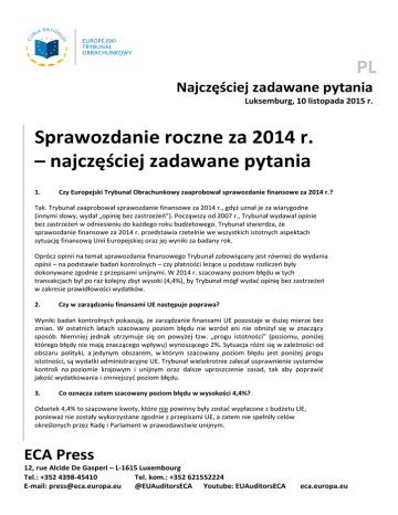 PL Najczęściej zadawane pytania Luksemburg, 10 listopada 2015 r. Sprawozdanie roczne za 2014 r. – najczęściej zadawane pytania 1. Czy Europejski Trybunał Obrachunkowy zaaprobował sprawozdanie finansowe za 2014 r.? Tak. Trybunał zaaprobował sprawozdanie finansowe za 2014 r., gdyż uznał je za wiarygodne (innymi słowy, wydał „opinię bez zastrzeżeń”). Począwszy od 2007 r., Trybunał wydawał opinie bez zastrzeżeń w odniesieniu do każdego roku budżetowego. Trybunał stwierdza, że sprawozdanie finansowe za 2014 r. przedstawia rzetelnie we wszystkich istotnych aspektach sytuację finansową Unii Europejskiej oraz jej wyniki za badany rok. Oprócz opinii na temat sprawozdania finansowego Trybunał zobowiązany jest również do wydania opinii – na podstawie badań kontrolnych – czy płatności leżące u podstaw rozliczeń były dokonywane zgodnie z przepisami unijnymi. W 2014 r. szacowany poziom błędu w tych transakcjach był po raz kolejny zbyt wysoki (4,4%), by Trybunał mógł wydać opinię bez zastrzeżeń w zakresie prawidłowości wydatków. 2. Czy w zarządzaniu finansami UE następuje poprawa? Wyniki badań kontrolnych pokazują, że zarządzanie finansami UE pozostaje w dużej mierze bez zmian. W ostatnich latach szacowany poziom błędu nie wzrósł ani nie obniżył się w znaczący sposób. Niemniej jednak utrzymuje się on powyżej tzw. „progu istotności” (poziomu, poniżej którego błędy nie mają znaczącego wpływu) wynoszącego 2%. Sytuacja różni się w zależności od obszaru polityki, a jedynym obszarem, w którym szacowany poziom błędu jest poniżej progu istotności, są wydatki administracyjne UE. Trybunał wielokrotnie zalecał usprawnienie systemów kontroli na poziomie krajowym i unijnym oraz dalsze uproszczenie zasad, tak aby poprawić jakość wydatkowania i zmniejszyć poziom błędu. 3. Co oznacza zatem szacowany poziom błędu w wysokości 4,4%? Odsetek 4,4% to szacowane kwoty, które nie powinny były zostać wypłacone z budżetu UE, ponieważ nie zostały wykorzystane zgodnie z przepisami UE, a zatem nie spełniły celów określonych przez Radę i Parlament w prawodawstwie unijnym. ECA Press 12, rue Alcide De Gasperi – L-1615 Luxembourg Tel.: +352 4398-45410 Tel. kom.: +352 621552224 E-mail: [email protected] @EUAuditorsECA Youtube: EUAuditorsECA eca.europa.eu Do typowych błędów zalicza się płatności na rzecz niekwalifikujących się beneficjentów lub projektów bądź też zamówienia na usługi, towary lub inwestycje z naruszeniem przepisów dotyczących udzielania zamówień publicznych. 4. Łączny budżet UE w 2014 r. wyniósł 142,5 mld euro, a poziom błędu wyniósł 4,4%. Czy oznacza to, że zmarnowano 6 mld euro środków UE? Nie. W przeszłości niektórzy komentatorzy mnożyli łączny budżet UE przez poziom błędu, a otrzymaną w ten sposób kwotę określali mianem „zmarnowanych środków”. Takie uproszczone podejście może jednak wprowadzać w błąd. W ramach przeprowadzanych kontroli Trybunał sprawdza, czy środki UE zostały spożytkowane zgodnie z ich przeznaczeniem, czy naliczone koszty zostały właściwie obliczone i czy spełniono warunki kwalifikowalności. Niektóre z wykrytych błędów dotyczą płatności, które nie spełniały warunków kwalifikowalności. Tak było na przykład w przypadku wsparcia udzielonego na badania naukowe podmiotowi zaklasyfikowanemu jako „małe lub średnie przedsiębiorstwo”, mimo że w rzeczywistości stanowił on własność dużej firmy. Inne błędy związane były z przypadkami naruszenia przepisów dotyczących zamówień publicznych, jak np. udzielenie jednemu przedsiębiorstwu zamówienia z wolnej ręki na dodatkowe roboty budowlane w porcie lotniczym bez umożliwienia innym oferentom przedstawienia najkorzystniejszych cenowo ofert. W takich przypadkach fundusze UE nadal mogły jednak odnieść pewien pozytywny skutek i przynieść korzyści, mimo że nie przestrzegano w pełni warunków dotyczących ich wykorzystania. Z drugiej strony do marnotrawstwa może dojść nawet wtedy, gdy środki są wydatkowane legalnie i prawidłowo, jak choćby w przypadku budowy autostrady bez uwzględnienia potrzeb ruchu drogowego. 5. Jak powstają błędy? Do błędów dochodzi, gdy beneficjenci nie przestrzegają odpowiednich przepisów przy ubieganiu się o środki UE. Aby beneficjenci mogli ubiegać się o wsparcie unijne, wymaga się od nich przestrzegania określonych przepisów unijnych, a niekiedy także krajowych. Mają one zagwarantować, że wydatki zostaną przeznaczone na cele określone przez Radę i Parlament. Do błędów dochodzi, gdy przepisy te zostają złamane – na przykład gdy promotorzy projektów nie przestrzegają przepisów dotyczących udzielania zamówień publicznych, ośrodki badawcze wnioskują o zwrot kosztów niezwiązanych z projektami finansowanymi ze środków UE, bądź gdy rolnicy nie przestrzegają podjętych zobowiązań środowiskowych. W sprawozdaniu rocznym za 2014 r. przedstawiono przykłady błędów wykrytych w trakcie badań kontrolnych. 6. Czy jeśli w 2014 r. szacowany poziom błędu w płatnościach UE wyniósł 4,4%, oznacza to, że 95,6% budżetu UE wydatkowano zgodnie z przepisami? Nie. Opinia Trybunału na temat wydatków UE opiera się na szerokiej próbie obejmującej wszystkie obszary polityki. Transakcje objęte próbą są szczegółowo badane, a wykryte błędy w miarę możliwości kwantyfikowane i wykorzystywane do obliczenia szacowanego poziomu błędu. Istnieje jednak wiele błędów, których Trybunał nie jest w stanie skwantyfikować, jak np. mniej poważne naruszenia przepisów dotyczących udzielania zamówień publicznych, nieprzestrzeganie przepisów dotyczących działań promocyjnych czy nieprawidłowa transpozycja dyrektyw UE do przepisów krajowych. Błędy takie nie są uwzględniane w poziomie błędu szacowanym przez Trybunał. 2 7. Czy wykryte błędy stanowią nadużyc